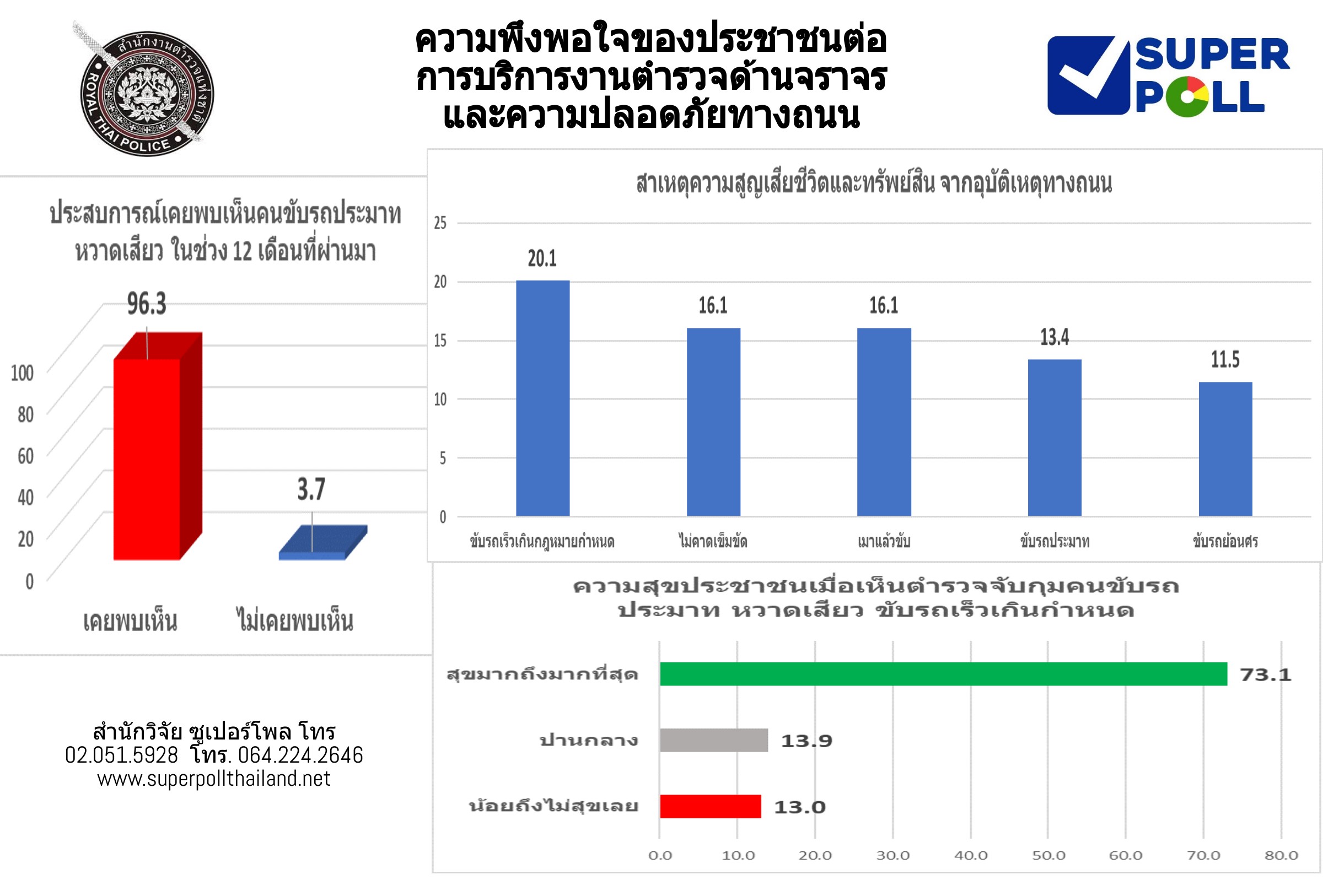 สำนักงานตำรวจแห่งชาติ โดย พล.ต.อ.สุวัฒน์ แจ้งยอดสุข รอง ผบ.ตร. พล.ต.ท.ดำรงศักดิ์ กิตติประภัสร์ ผู้ช่วย ผบ.ตร. และ พล.ต.ต.เสนิต สำราญสำรวจกิจ ผู้บังคับการ กองวิจัย ร่วมกับ ผู้ช่วยศาสตราจารย์ ดร.นพดล กรรณิกา ผู้อำนวยการสำนักวิจัยซูเปอร์โพล (SUPER POLL) เปิดเผยผลการศึกษาความพึงพอใจของประชาชนต่อการบริการงานตำรวจด้านจราจรและความปลอดภัยทางถนน กรณีศึกษาประชาชนทุกสาขาอาชีพทั่วประเทศ โดยดำเนินโครงการทั้งการวิจัยเชิงปริมาณ (Quantitative Research) และการวิจัยเชิงคุณภาพ (Qualitative Research) จำนวน 1,201 ตัวอย่าง ดำเนินโครงการระหว่างวันที่ 1 – 18 ธันวาคม พ.ศ. 2562 ที่ผ่านมา