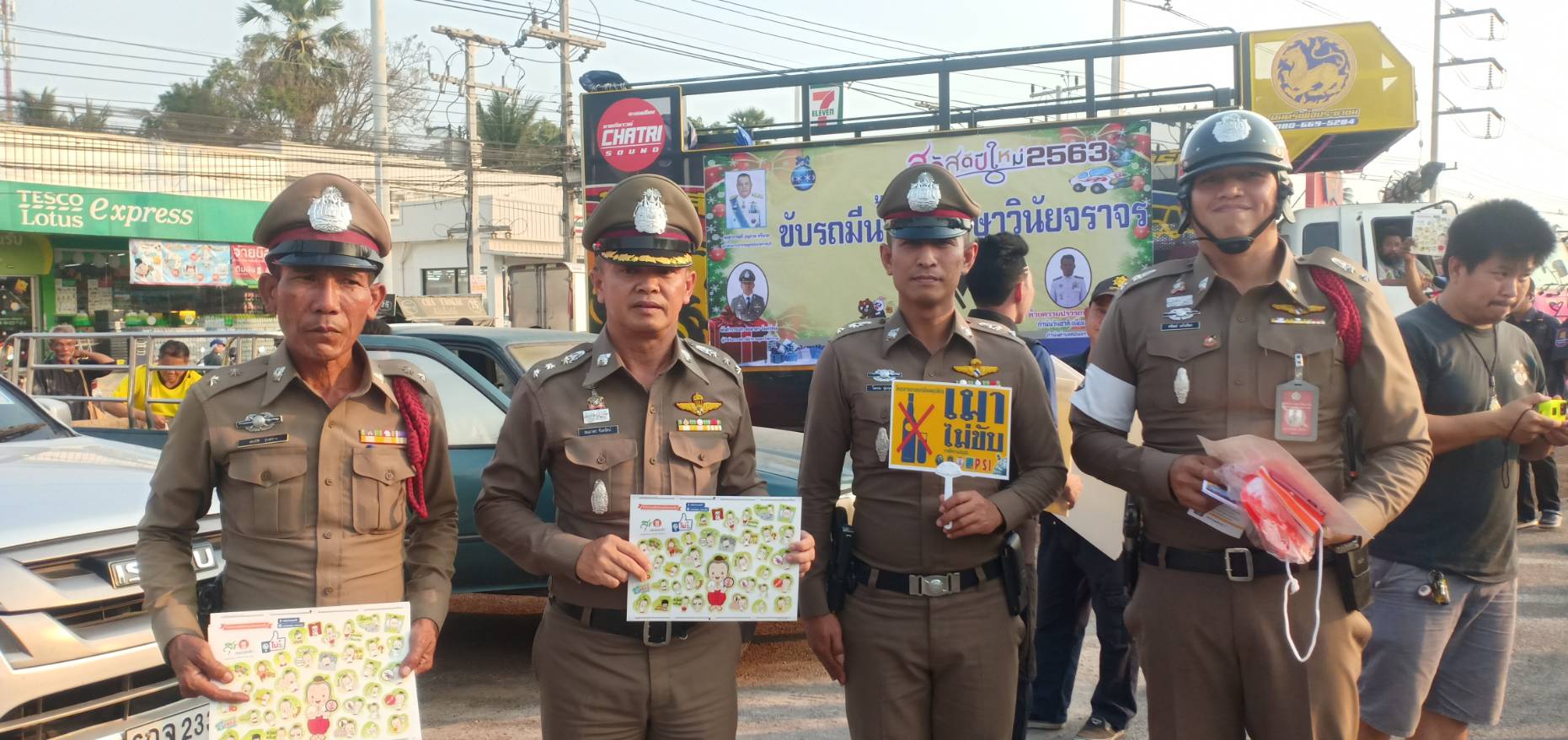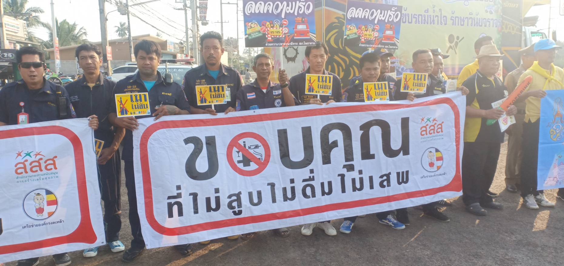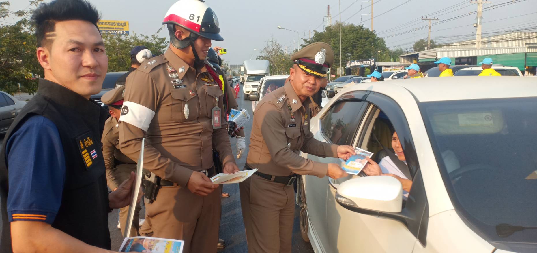ทำการแจกแผ่นพับด้วยตนเอง พร้อมนำของขวัญแจกให้กับผู้ขับขี่รถ และให้คำแนะนำ เพื่อความปลอดภัยในการขับขี่เดินทางระยะไกลๆ เคารพกฎจราจร สัญจรอย่างปลอดภัย ใส่ใจเพื่อนร่วมทาง ขับรถไม่ดื่มสุราหรือของมึนเมา เมาขับ จำคุก 1 ปี ปรับ 5 พัน บาท ถึง 2หมื่นบาท พักใบอนุญาตหรือเพิกถอน เมาขับชนผู้อื่น เจ็บจำคุก 1-5 ปีปรับ 2หมื่นบาท ถึง 1แสนบาทพักใบอนุญาต หรือเพิกถอนเมาขับชนผู้อื่นสาหัสจำคุก 2 ถึง 6 ปี ปรับ 4หมื่นถึง 1.2แสน พักใบอนุญาตหรือเพิกถอน เมาขับชนผู้อื่นตายจำคุก 3 ถึง 10 ปี ปรับ 6หมื่นบาท ถึง 2แสน บาท เพิกถอนใบอนุญาต มาตรการ 10 ข้อ10 ข้อหาหลัก)10 ร ส ข ม) 1 .ขับรถไม่ดื่มสุราหรือของมึนเมา