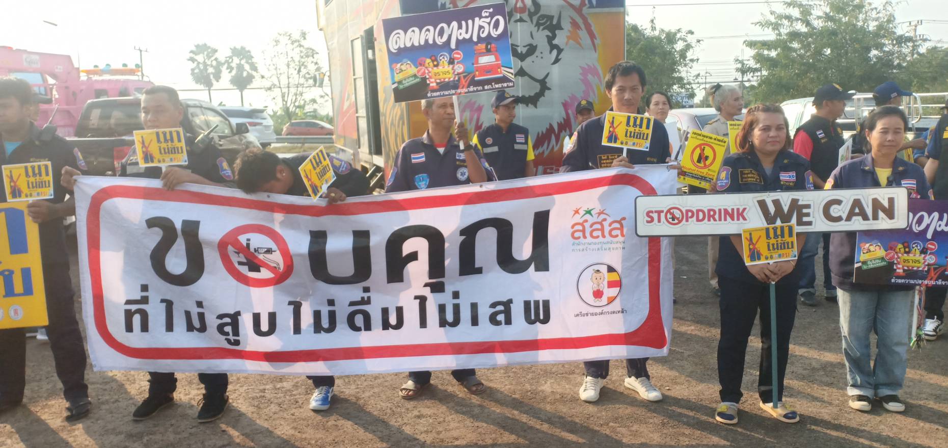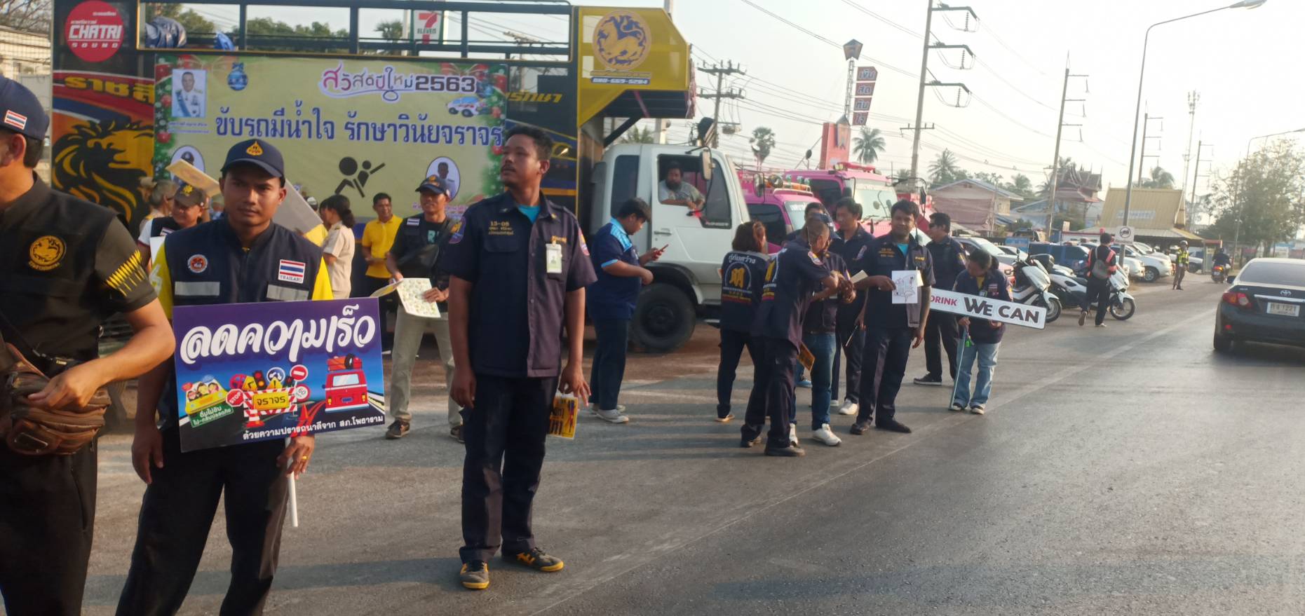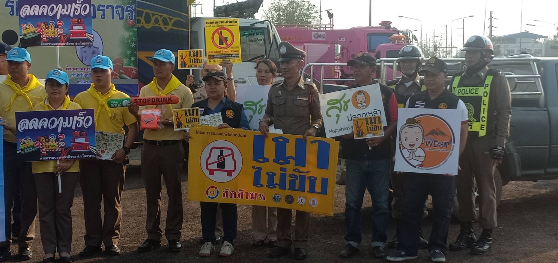ทำการแจกแผ่นพับด้วยตนเอง พร้อมนำของขวัญแจกให้กับผู้ขับขี่รถ และให้คำแนะนำ เพื่อความปลอดภัยในการขับขี่เดินทางระยะไกลๆ เคารพกฎจราจร สัญจรอย่างปลอดภัย ใส่ใจเพื่อนร่วมทาง ขับรถไม่ดื่มสุราหรือของมึนเมา เมาขับ จำคุก 1 ปี ปรับ 5 พัน บาท ถึง 2หมื่นบาท พักใบอนุญาตหรือเพิกถอน เมาขับชนผู้อื่น เจ็บจำคุก 1-5 ปีปรับ 2หมื่นบาท ถึง 1แสนบาทพักใบอนุญาต หรือเพิกถอนเมาขับชนผู้อื่นสาหัสจำคุก 2 ถึง 6 ปี ปรับ 4หมื่นถึง 1.2แสน พักใบอนุญาตหรือเพิกถอน เมาขับชนผู้อื่นตายจำคุก 3 ถึง 10 ปี ปรับ 6หมื่นบาท ถึง 2แสน บาท เพิกถอนใบอนุญาต มาตรการ 10 ข้อ10 ข้อหาหลัก)10 ร ส ข ม) 1 .ขับรถไม่ดื่มสุราหรือของมึนเมา
