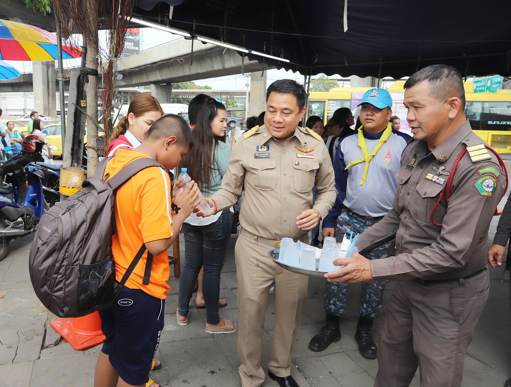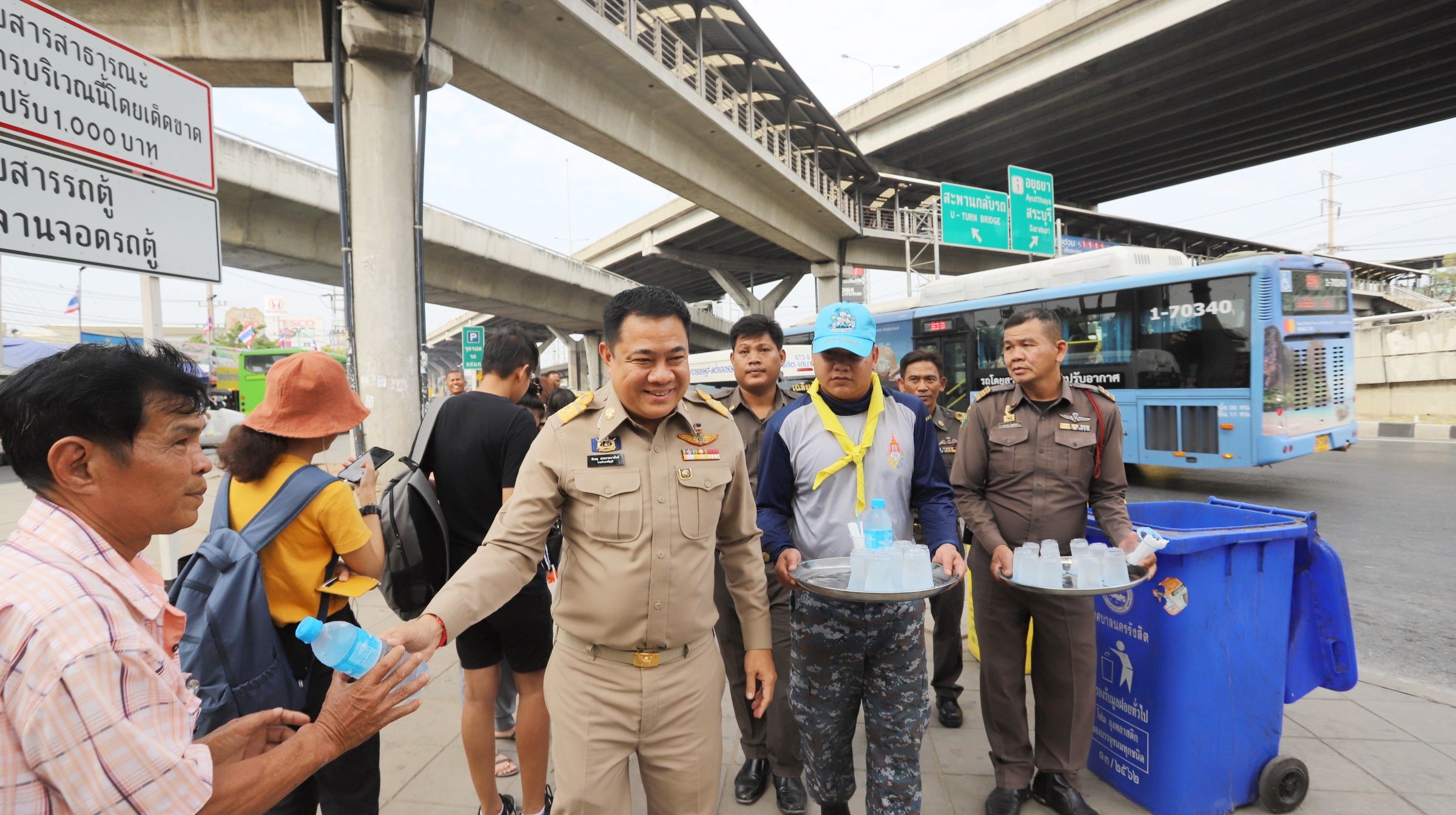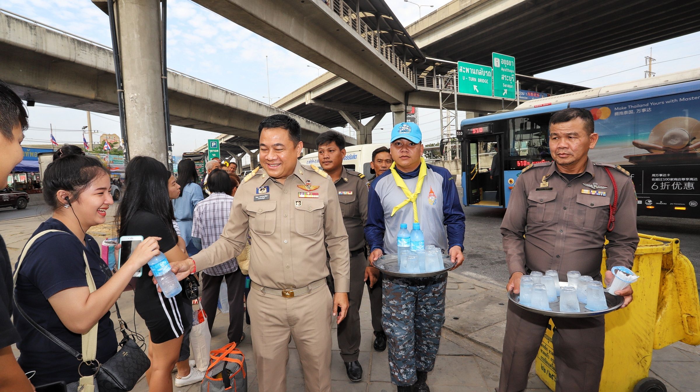 ปทุมธานี อำเภอธัญบุรีร่วมกับจิตอาสาบริการ บริการแจกเครื่องดื่มให้ปชช.เดินทางกลับบ้านเทศกาลปีใหม่