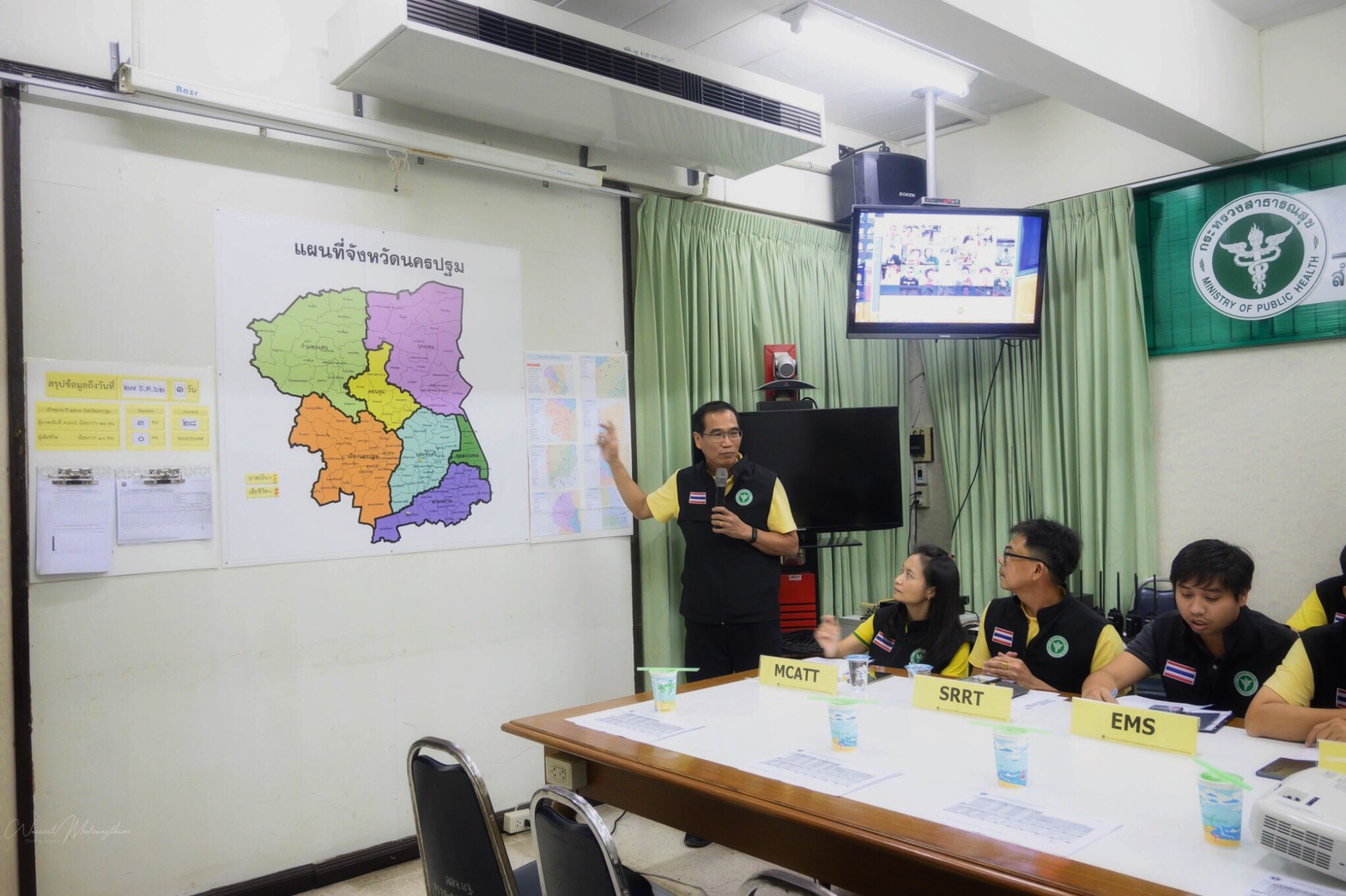 ระหว่างจุดตรวจด่านความปลอดภัยทางท้องถนน แต่ละอำเภอ เพื่อรายงานสถานการณ์เป็นระยะ ที่ห้องประชุม 2 สำนักงานสาธารณสุขจังหวัดนครปฐม