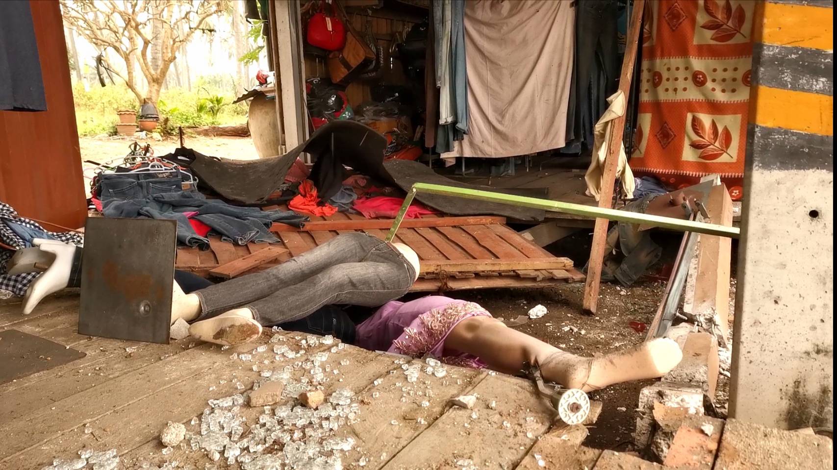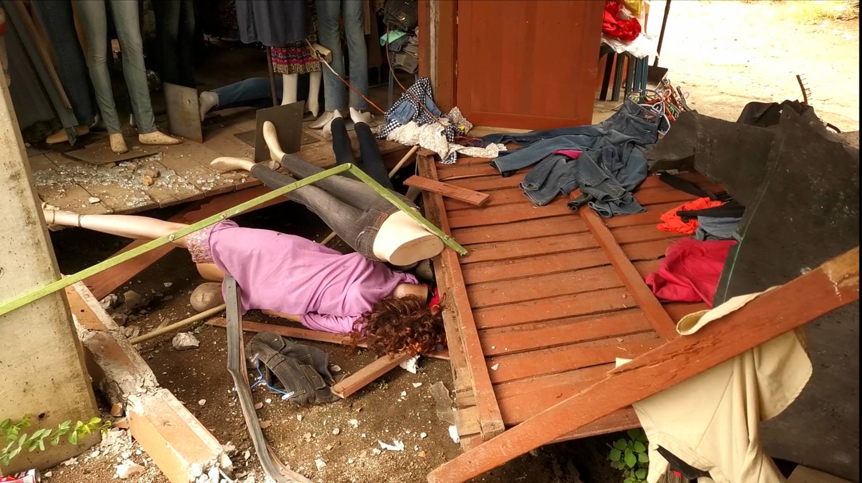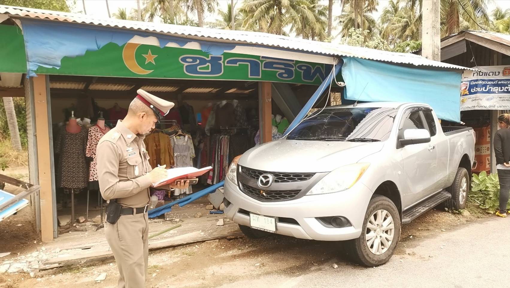 พบรถยนต์กระบะมาสด้า สีบรอนเทา หมายเลขทะเบียน ผท 184 สงขลา ด้านท้ายและด้านข้างรถฝั่งคนขับฝาดเข้ากับร้านค้าซึ่งเป็นร้านขายผ้า ชื่อร้านชารีฟ ตั้งอยู่ริมถนนเพชรเกษม กม.345-346 หมู่ที่ 6 ต.แสงอรุณ ของ น.ส.นพีภรณ์ อดุลฮีม อายุ 47 ปี บ้านเลขที่ 153/1 หมู่ 11 ต.เขาล้าน อ.ทับสะแก ซึ่งเปิดเป็นร้านขายผ้าแฟชั่นสตรี และของพี่น้องมุสลิม โดยประตูเหล็กม้วนพังเสียหาย เสื้อผ้าในร้านรวมทั้งหุ่นลองชุดล้มระเนระนาด แผงฝาร้านล้มพังเสียหาย เศษวัสดุหิน และ กระจกแตกกระจายเกลื่อน ส่วนสภาพรถกระบะ ที่มี นายถนอม เลพล อายุ 41 ปี บ้านเลขที่ 120/1 หมู่ที่ 14 ต.ตบหู อ.เดชอุดม จ.อุบล เป็นคนขับ ทั้งตัวถังด้านขวาฝั่งคนขับ และท้ายยุบพังเสียหาย กระจกหลังแตก ช่วงล่างพังเสียหายไม่สามารถขับไปได้