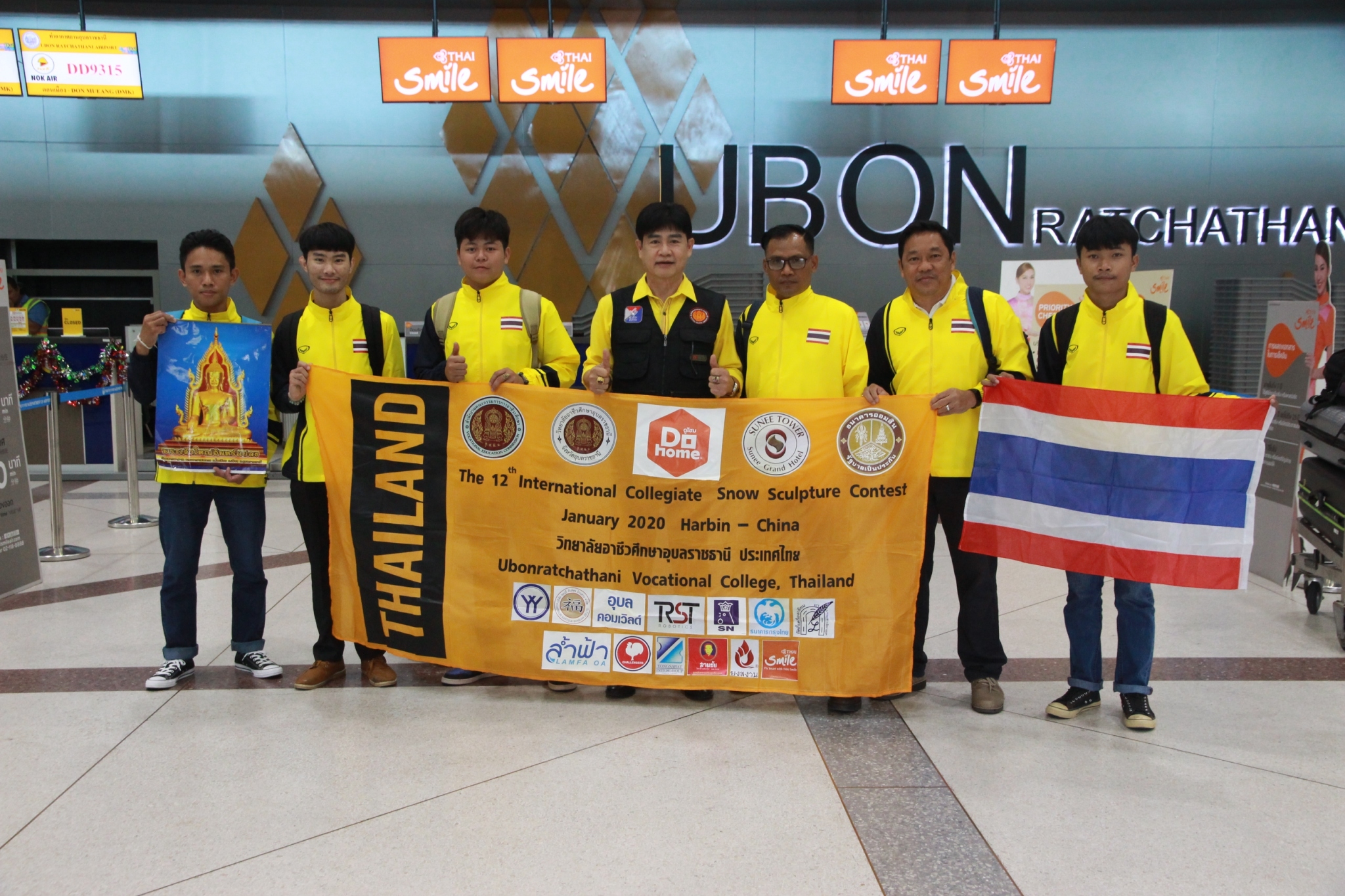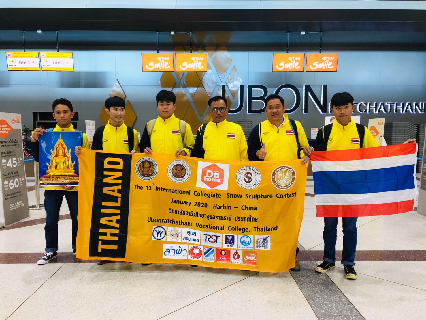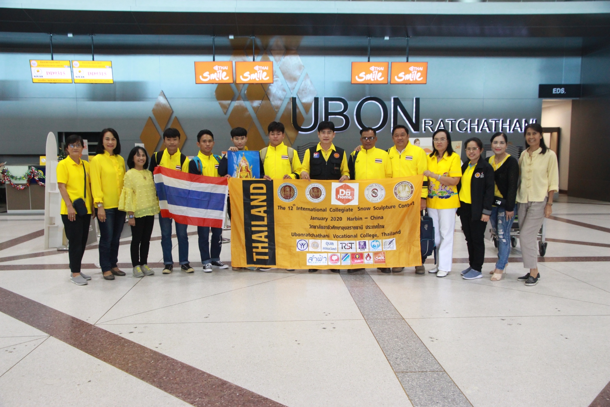 วานนี้ 31 ธันวาคม 2562 ที่สนามบินนานาชาติอุบลราชธานี วิทยาลัยอาชีวศึกษาอุบลราชธานี นำโดย ดร.พงษ์ศักดิพล ทาแก้ว ผู้อำนวยการวิทยาลัยอาชีวศึกษาอุบลราชธานี นำคณะผู้บริหาร ครู บุคลากร เดินทางส่งและให้กำลังใจทีมแกะสลักหิมะนานาชาติ ประกอบด้วย นายพิศิษฐ์ อู่ศิริกุลพาณิชย์ หัวหน้าคณะวิชาศิลปกรรม นายสุระชาติ พละศักดิ์ หัวหน้าแผนกวิชาวิจิตรศิลป์ ครูผู้ฝึกสอน นำนักเรียน นักศึกษา ประกอบด้วย นายอัฐกร แก้วหาวงศ์ นักศึกษา ปวส.2 นายพลรบ รูปคม นักศึกษา ปวส.1 นายอนันตชัย วอทอง นักเรียน ปวช.3 และนายอำพล ธรรมทอง นักเรียน ปวช.1 ทั้งหมดเป็นนักเรียน นักศึกษาในสาขาวิชาวิจิตรศิลป์ คณะวิชาศิลปกรรม เดินทางออกจากจังหวัดอุบลราชธานี วันนี้ เวลา 13.45 น. ด้วยสายการบินไทยสมายล์ เที่ยวบิน WE025 โดยได้รับการสนับสนุนเที่ยวบินเดินทางไป -กลับ ภายในประเทศ จากสายการบินไทยสมายล์ เหมือนเช่นทุกปี จากนั้นมีกำหนดเดินทางออกจากประเทศไทย ไปยังเมืองซีอาน ประเทศสาธารณรัฐประชาชนจีนในเวลา 09.00 น.ในวันที่ 1 มกราคม 2563 ต้อนรับศักราชใหม่ เพื่อปรับสภาพอุณหภูมิในร่างกาย ซึ่งในการเดินทางไปแข่งขันแกะสลักหิมะนานาชาติในปี 2563 ณ มหาวิทยาลัยวิศวกรรมฮาร์บิน มณฑลเฮย์หลงเจียง สาธารณรัฐประชาชนจีน ในปีนี้ มีตัวแทนของสถานศึกษา สังกัดสำนักงานคณะกรรมการการอาชีวศึกษา กระทรวงศึกษาธิการ จำนวน 3 แห่ง ดังนี้ วิทยาลัยสารพัดช่างตราด แชมป์ปี 2562