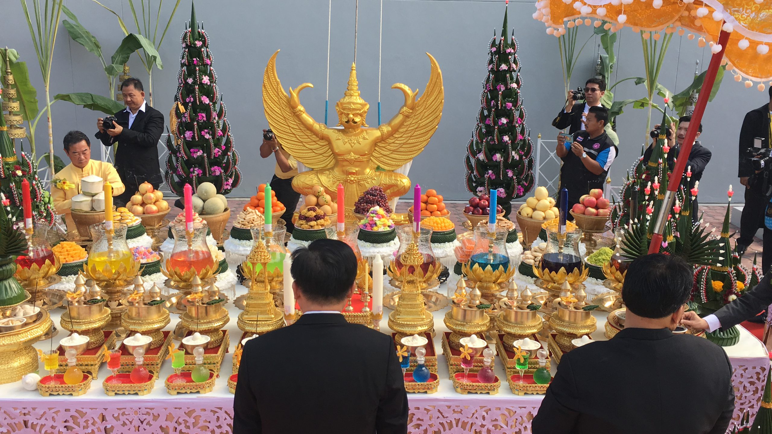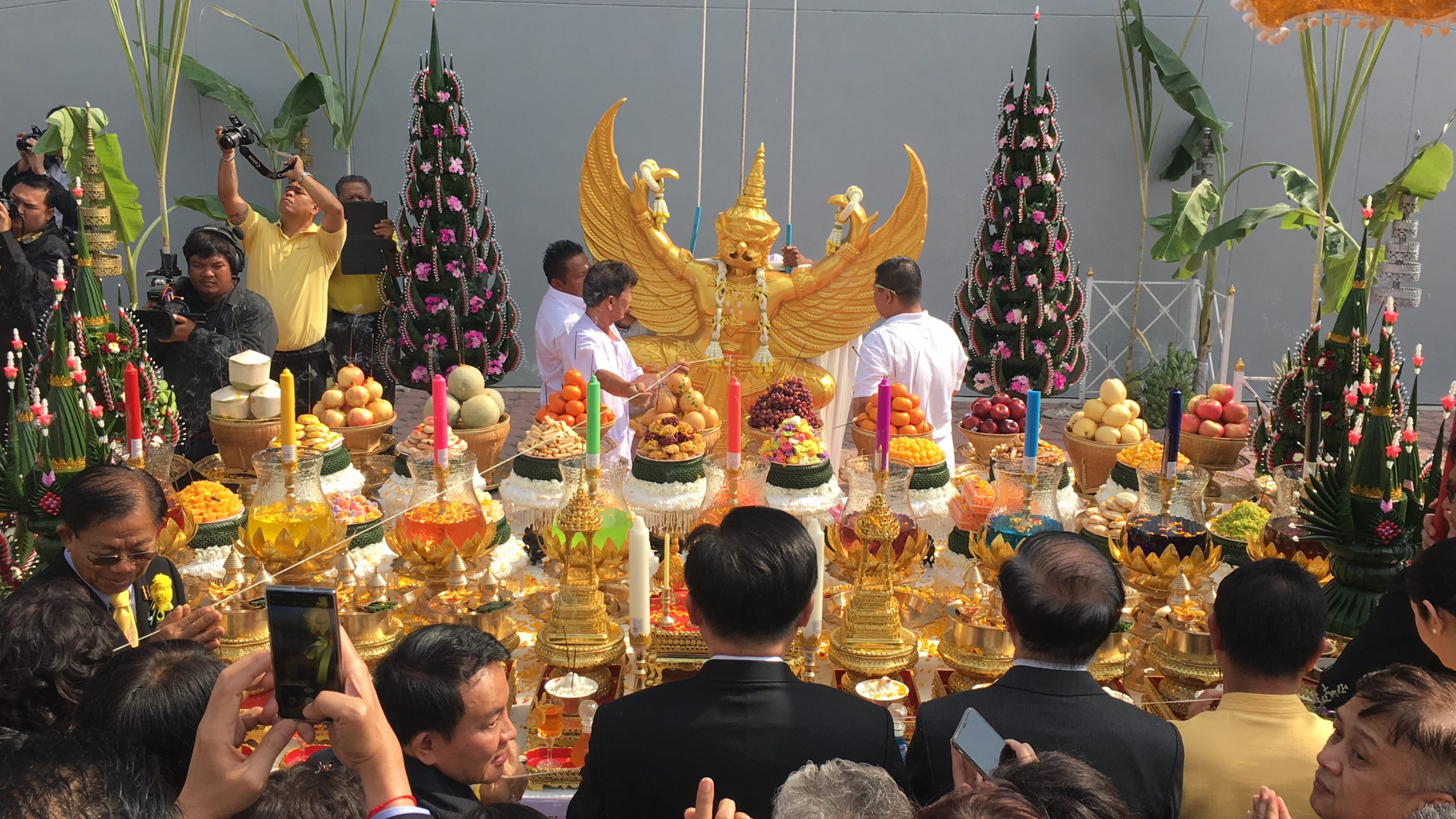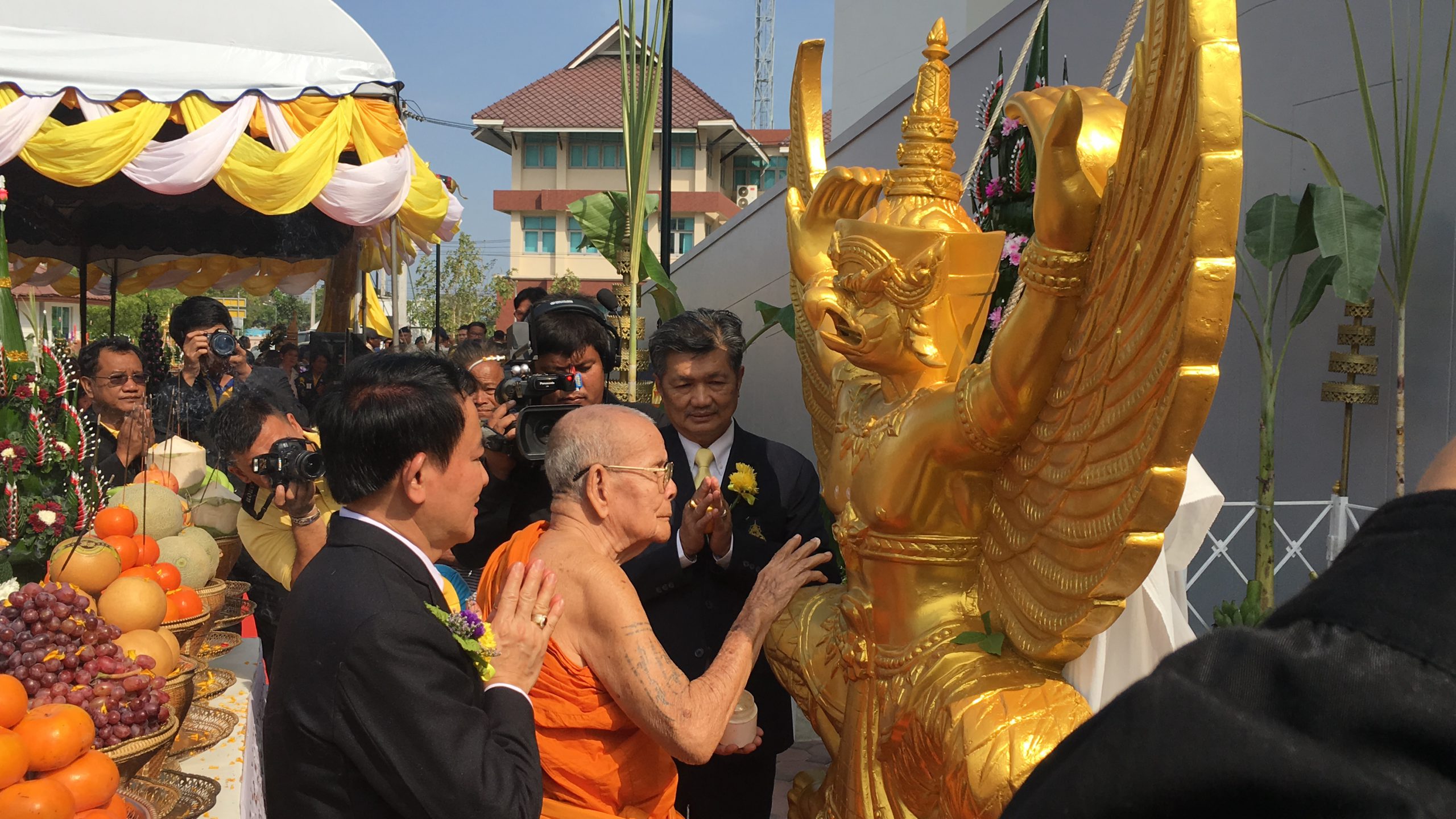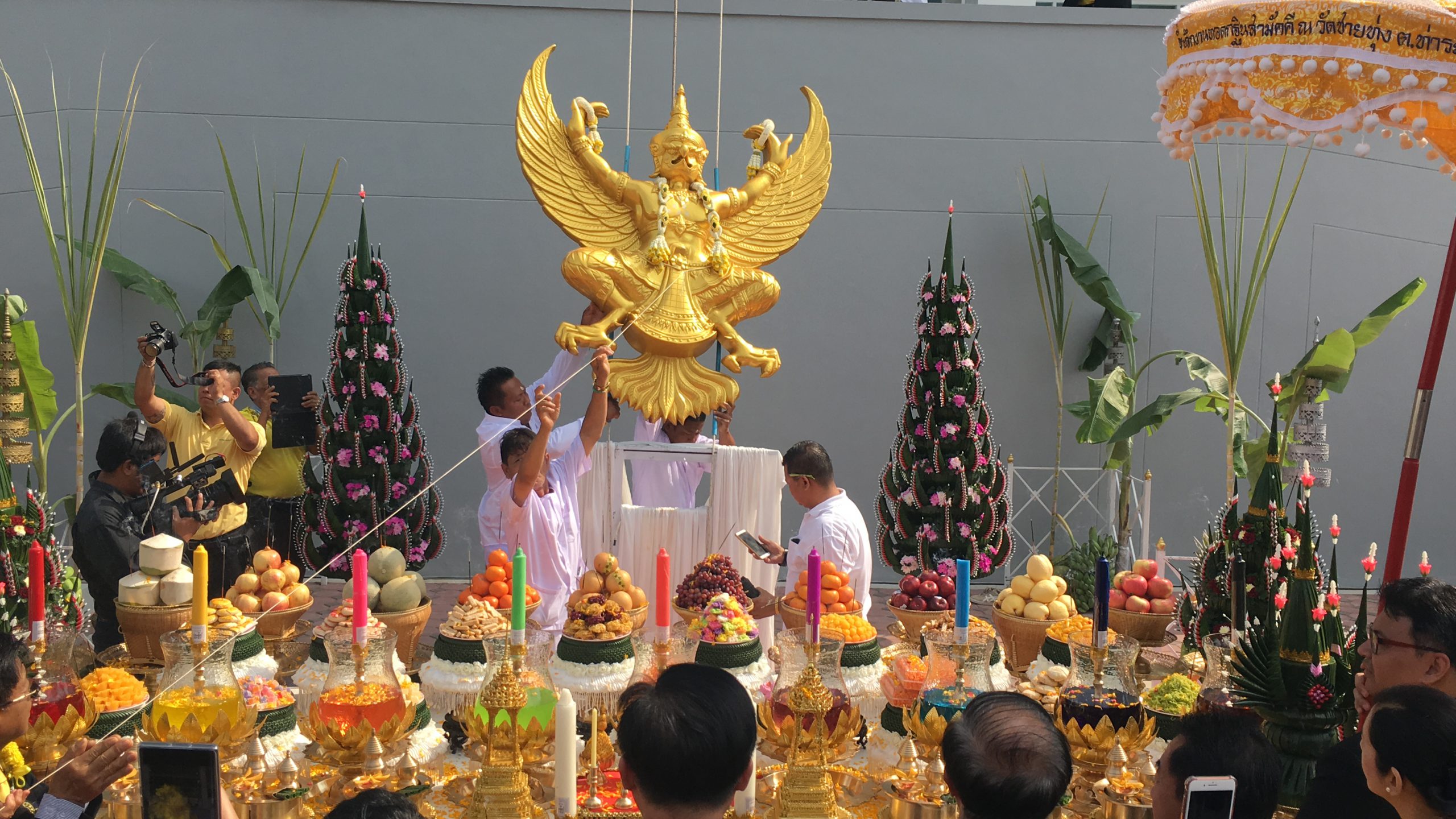 โดยมีหลวงพ่อสมบุญ ปิยธมโมเจ้าอาวาสวัดลำพันบอง อ.หนองหญ้าไซ พระเกจิชื่อดัง ของ จ.สุพรรณบุรี เป็นประธานฝ่ายสงฆ์ ประกอบพิธีเจิมครุฑเบิกเนตครุฑ จากนั้นพราหมณ์ได้อัญเชิญครุฑขึ้นสู่หน้าบรรณศาลฯ โดยมีอธิบดีผู้พิพากษาศาลเยาวชนและครอบครัวกลาง และอธิบดีผู้พิพากษาภาค7 ผู้พิพากษาหัวหน้าศาลเยาวชนและครอบครัวจังหวัดสุพรรณบุรี และนายนิมิต วันไชยธนวงศ์ ผู้ว่าราชการจังหวัดสุพรรณบุรี พร้อมด้วยหัวหน้าส่วนราชการ ร่วมกันประกอบพิธีอัญเชิญองค์ครุฑขึ้นสู่หน้าบรรณศาลฯ จากนั้นพระธรรมพุทธิมงคล เจ้าอาวาสวัดป่าเลไลยก์วรวิหาร จ.สุพรรณบุรี ประกอบพิธีเจิมประตูหน้าศาลชั้น 2 พระครูมงคลกิจโกศล หรือ หลวงปู่ฤาษีตาไฟ รองเจ้าคณะจังหวัดชัยนาท เจ้าอาวาสวัดเทพหิรัญ จ.ชัยนาท เจิมป้ายหน้าศาลเยาวชนและครอบครัวจังหวัดสุพรรณบุรี