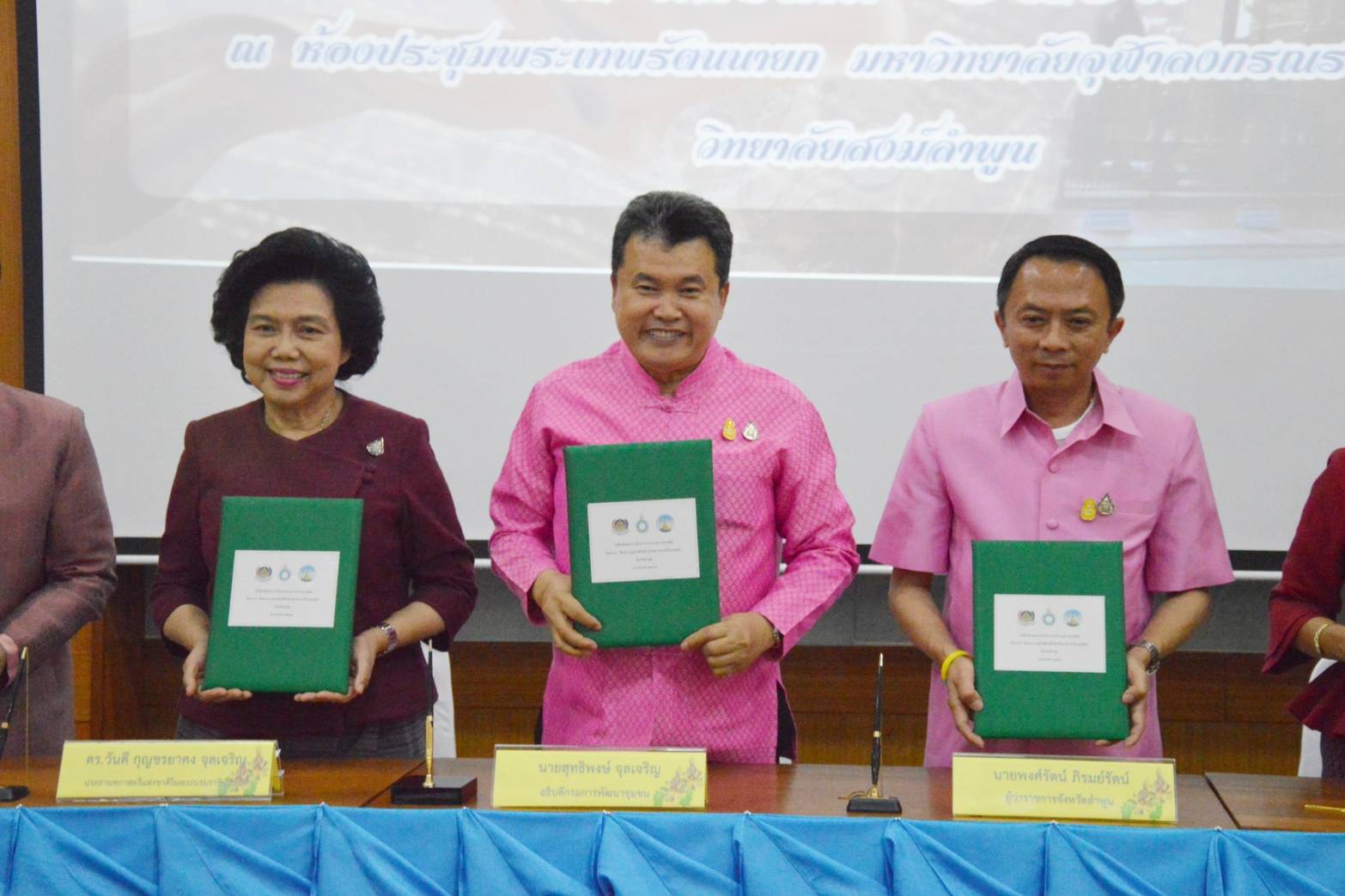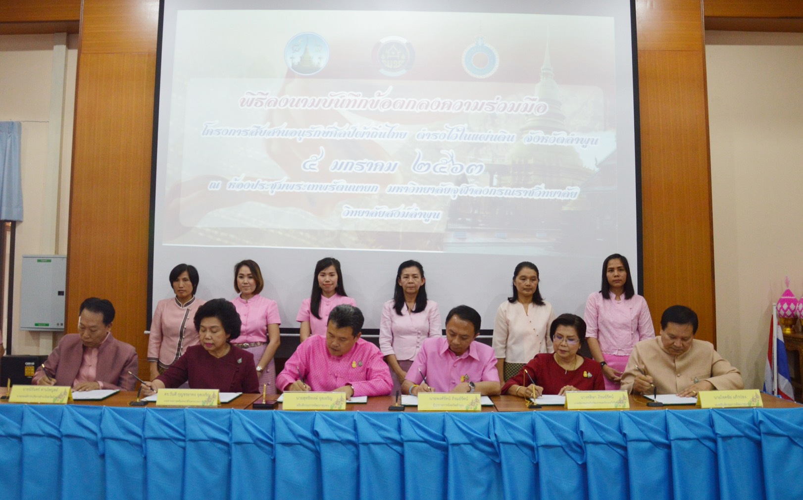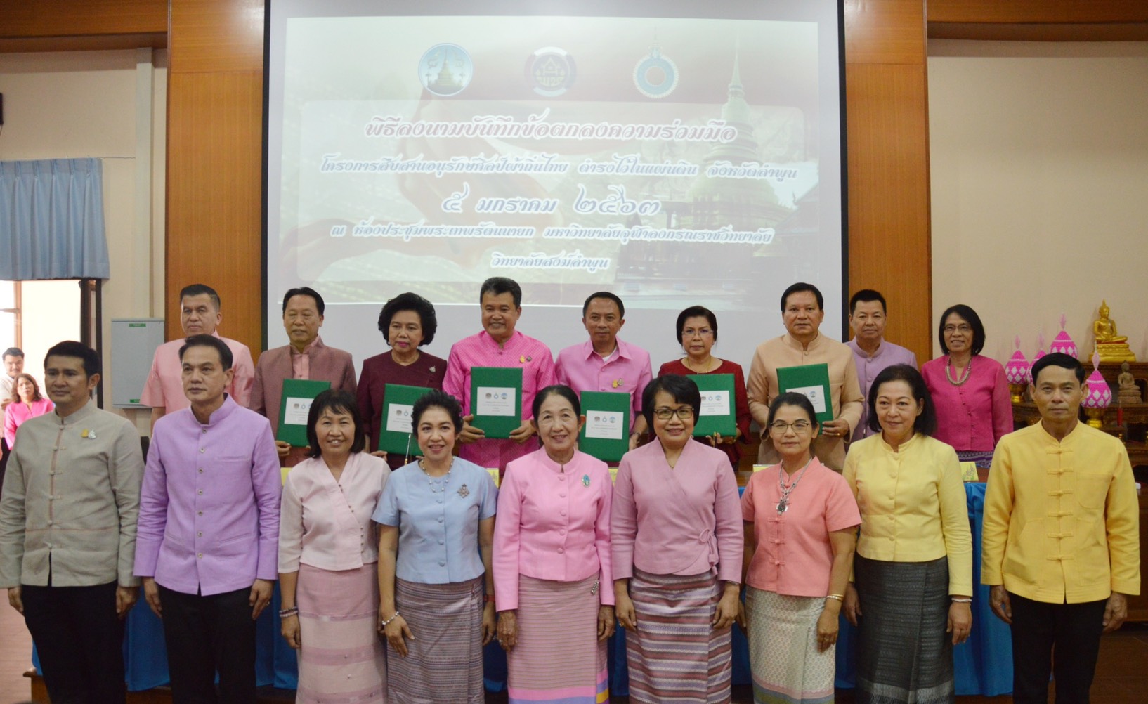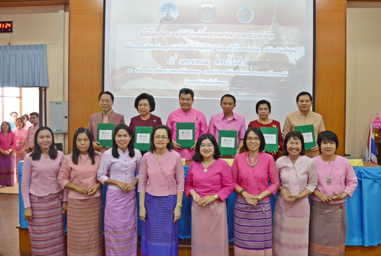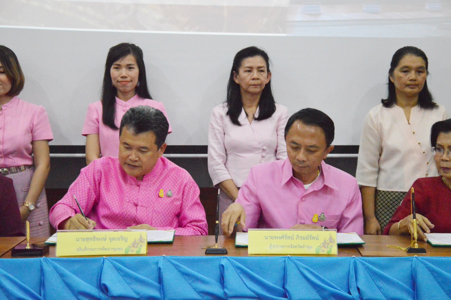 นายสุทธิพงษ์ จุลเจริญ อธิบดีกรมการพัฒนาชุมชน พร้อมด้วย ดร.วันดี กุญชรยาคง จุลเจริญ ประธานสภาสตรีแห่งชาติ ในพระบรมราชินูปถัมภ์และประธานชมรมแม่บ้านพัฒนาชุมชน ร่วมลงนามบันทึกข้อตกลงความร่วมมือ (MOU) โครงการสืบสาน อนุรักษ์ศิลป์ผ้าถิ่นไทย ดำรงไว้ในแผ่นดิน กับจังหวัดลำพูน นำโดย นายพงศ์รัตน์ ภิรมย์รัตน์ผู้ว่าราชการจังหวัดลำพูน พร้อมด้วยนางศลิษา ภิรมย์รัตน์ นายกสมาคมส่งเสริมวัฒนธรรมสตรีจามเทวี