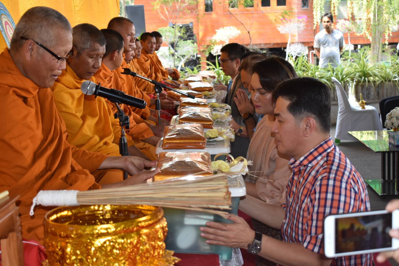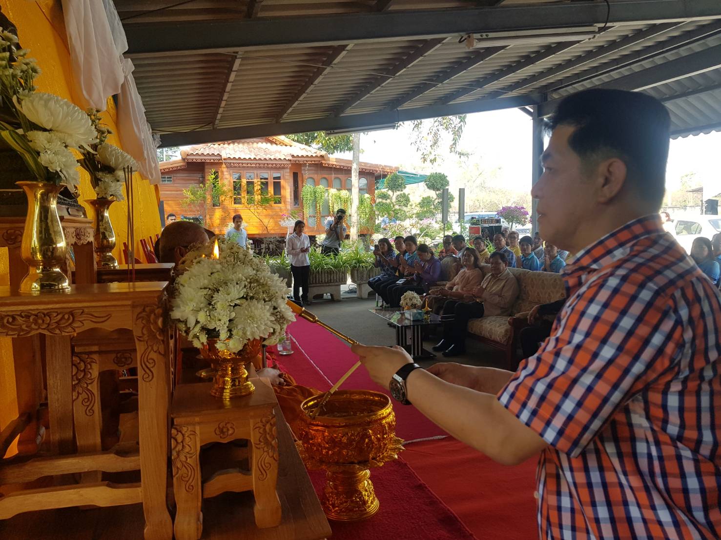 หลังจากนั้น พระสงฆ์จากวัดลาดหญ้า จังหวัดกาญจนบุรี จำนวน 9 รูปประกอบพิธีสวดเจริญพุทธมนตร์ เสร็จแล้ว นายรังสรรค์ รัศมีฤกษ์เศรษฐ์ นายกองค์การบริหารส่วนจังหวัดกาญจนบุรีพร้อมด้วยนางศรีสมร รัศมีฤกษ์เศรษฐ์ สมาชิกสภาผู้แทนราษฎรในระบบบัญชีรายชื่อพรรคประชาธิปัตย์และแขกผู้มีเกียรติได้ร่วมกันถวาย ภัตตาหารเพลแด่พระภิกษุสงฆ์จำนวน 9 รูปและขวดน้ำอุทิศส่วนกุศลให้กับผู้ล่วงลับเสร็จพิธีสงฆ์./