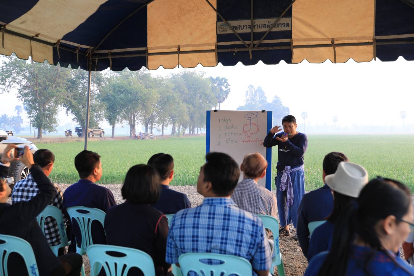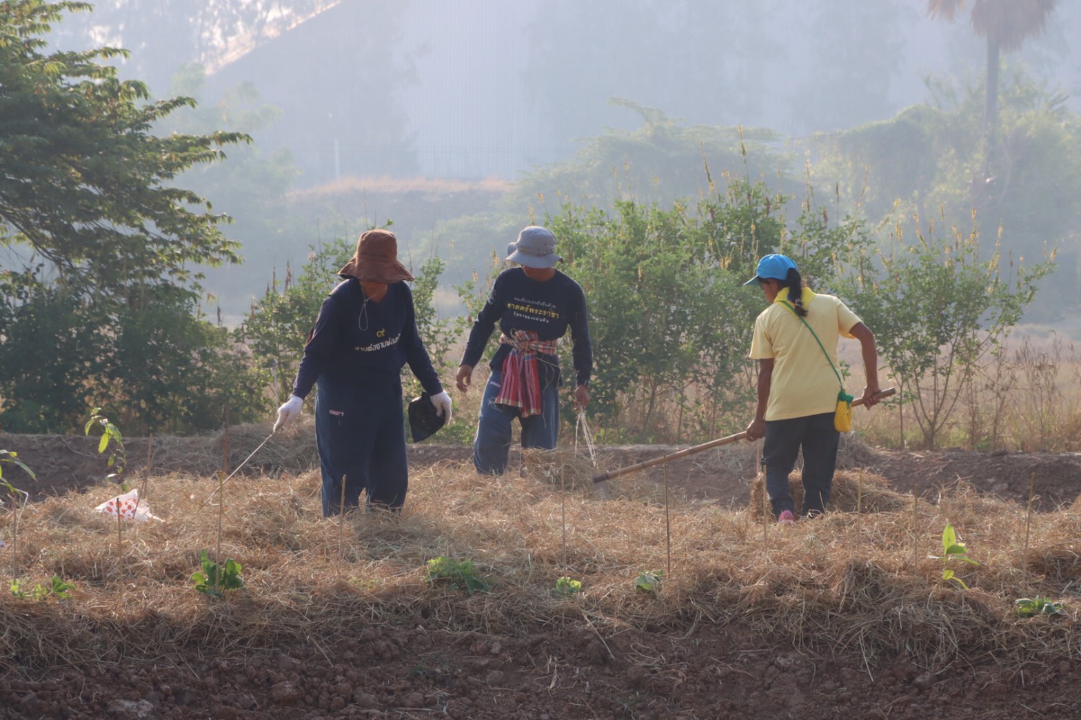 ซึ่งกิจกรรมเอามื้อในวันนี้ ได้รับการถ่ายทอดความรู้จาก อ.บุญล้อม เต้าแก้ว เกษตรกรและปราชญ์ชาวบ้าน ผู้ได้รับมอบหมายจากมูลนิธิกสิกรรมธรรมชาติ ที่เชี่ยวชาญเรื่องการออกแบบพื้นที่ทำการเกษตร การจัดการน้ำ การทำน้ำหมักสมุนไพรไล่แมลง มาถ่ายทอดความรู้พร้อมสอนวิธีการ ปลูกผัก ห่มดิน ใส่ปุ๋ยแบบแห้งชาม น้ำชาม ตลอดจนการดูแลรักษาพื้นที่ให้คงความชุ่มชื้นได้นาน โดยวิธีนี้เป็นการระเบิดดินที่แห้งแข็ง ให้มีความชุ่มชื้น (ฟางห่มคลุมดินเพื่อลดการระเหยของน้ำในดิน ปุ๋ยคอกที่ใส่เพื่อเพิ่มอินทรียวัตถุ น้ำหมักทำหน้าที่ย่อยสลายทั้งปุ๋ยและฟาง ให้กลายเป็นอินทรียวัตถุได้เร็วขึ้น) ซึ่งดินจะปล่อยธาตุอาหารให้พืช โดยกระบวนการย่อยสลายของจุลินทรีย์ เรียกว่า “เลี้ยงดิน ให้ดินเลี้ยงพืช”
