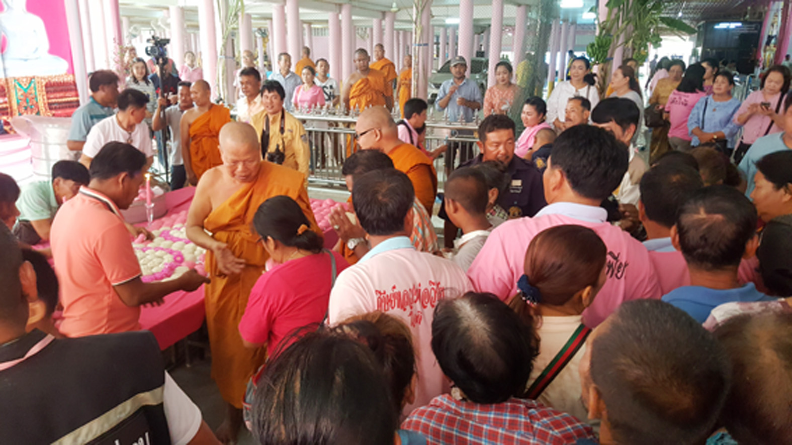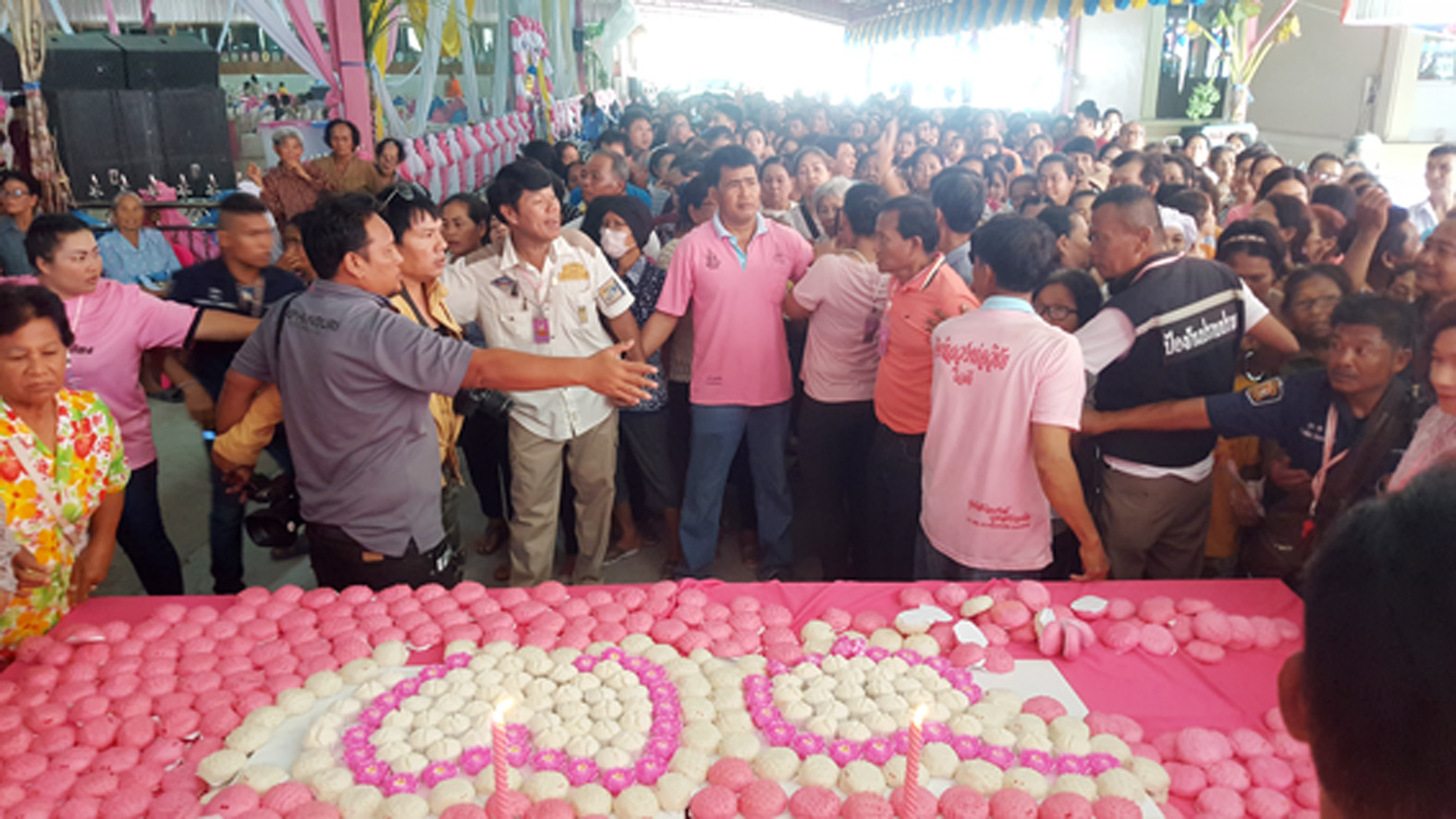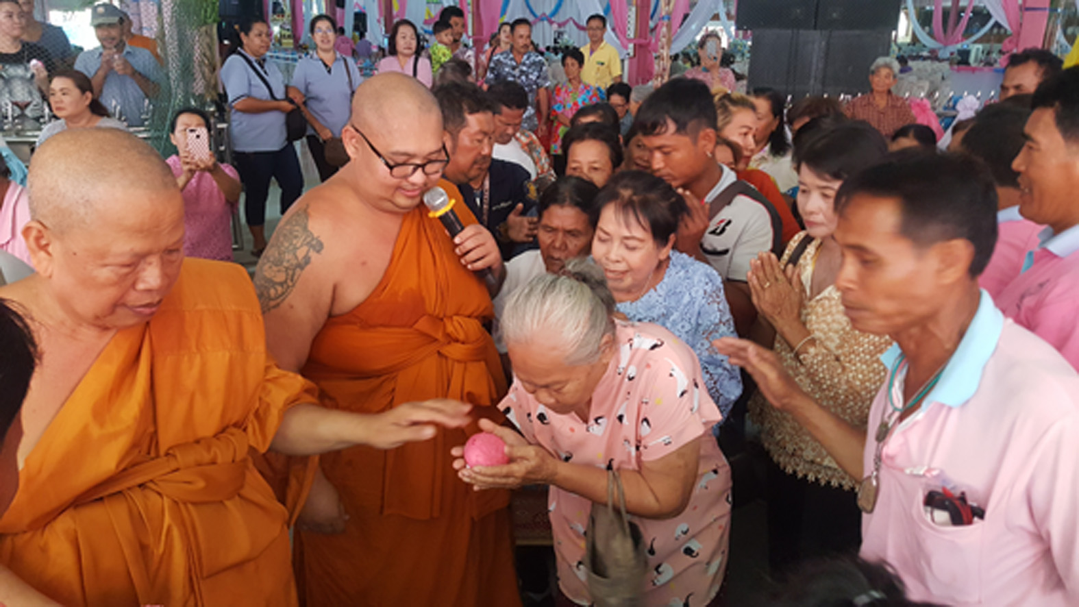 สุพรรณบุรี ชาวบ้านกว่า2,000 คนแห่รับแจกซาลาเปามงคลสีชมพูงานอายุวัฒนมงคลหลวงพ่อวิชัย