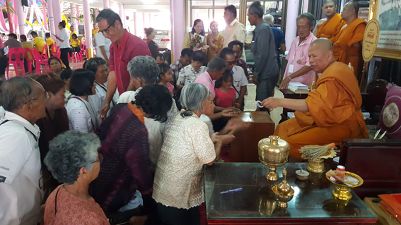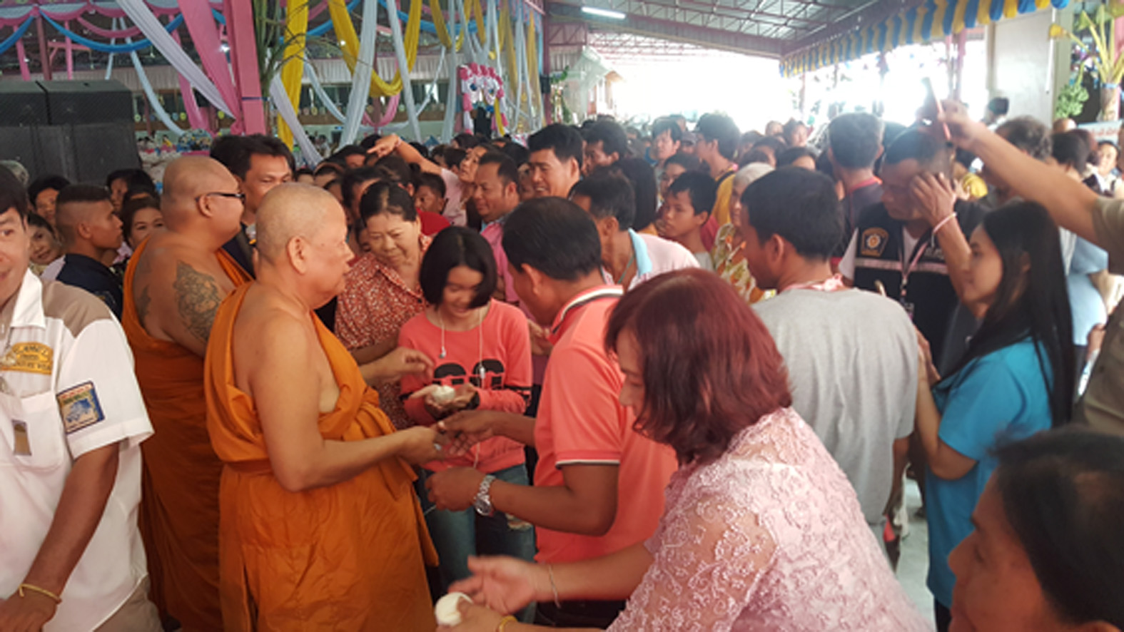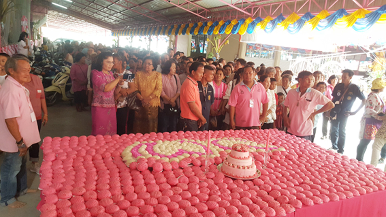 สุพรรณบุรี ชาวบ้านกว่า2,000 คนแห่รับแจกซาลาเปามงคลสีชมพูงานอายุวัฒนมงคลหลวงพ่อวิชัย