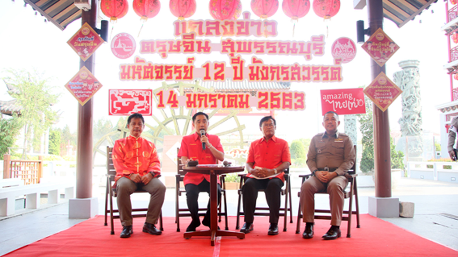 ที่หมู่บ้านมังกรสวรรค์ สุพรรณบุรี นายนพฤทธิ์ ศิริโกศล รองผู้ว่าราชการจังหวัดสุพรรณบุรี นายณัฐปคัลภ์ อัครวิชญ์ ผอ.ททท.สำนักงานสุพรรณบุรี นางดวงใจ คุ้มสอาด รอง ผอ. ททท. สำนักงานสุพรรณบุรี รองผู้บังคับการตำรวจภูธรจังหวัดสุพรรณบุรี และนายชาญชัย ทิพเนตร ผู้จัดการศาลเจ้าพ่อหลักเมืองสุพรรณบุรี ร่วมกันเปิดเผยการเตรียมจัดงาน “ตรุษจีนสุพรรณบุรี มหัศจรรย์ 12 ปี มังกรสวรรค์” โดยจังหวัดสุพรรณบุรี ร่วมกับการท่องเที่ยวแห่งประเทศไทย สำนักงานสุพรรณบุรี และคณะกรรมการศาลเจ้าพ่อหลักเมืองสุพรรณบุรี ร่วมกันจัดขึ้นระหว่างวันที่ 25-26 มกราคม 2563 ณ บริเวณอุทยานมังกรสวรรค์ พิพิธภัณฑ์ลูกหลานพันธุ์มังกร ศาลเจ้าพ่อหลักเมือง อำเภอเมือง จังหวัดสุพรรณบุรี เพื่อเปิดโอกาสให้ประชาชนได้สักการะ กราบไหว้บูชาขอพรเจ้าพ่อหลักเมืองสุพรรณบุรี ในช่วงเทศกาลตรุษจีน รวมทั้งเฉลิมฉลองพิพิธภัณฑ์ลูกหลานพันธุ์มังกร ครบรอบ 12 ปี ภายใต้ชื่อ “ตรุษจีนสุพรรณบุรีมหัศจรรย์ 12 ปีมังกรสวรรค์”
