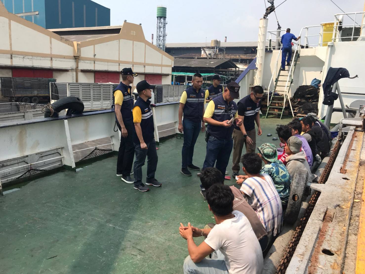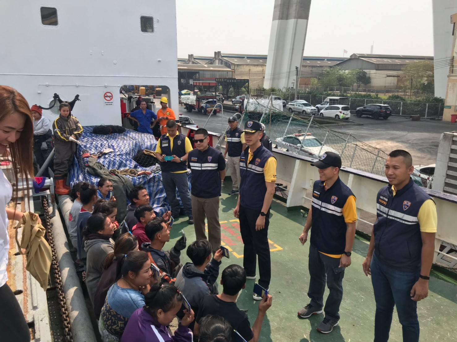 เข้ามาเป็นลูกจ้างขนถ่ายปลาแช่แข็ง ผลการตรวจสอบพบ คนต่างด้าวประมาณ 30 คน คนไทยประมาณ 20 คน กำลังทำงานขนถ่ายปลาแช่แข็งจากเรือสินค้า TIARA 108 ขึ้นรถบรรทุก โดยได้ตรวจสอบความถูกต้องในการเดินทางเข้าออก และการอนุญาตให้อยู่ต่อในราชอาณาจักร ด้วยรถไฟฟ้าตรวจการณ์อัจฉริยะ (BMW) จำนวน 30 คน พบว่า มีคนต่างด้าวสัญชาติเมียนมา จำนวน 4 คน ชื่อ 1.นายเนเบ อายุ 20 ปี สัญชาติเมียนมา 2.นายเมาเต อายุ 25 ปี สัญชาติเมียนมา 3.นายละเว อายุ 23 ปี สัญชาติเมียนมา และ 4.นายอาชุ่ย อายุ 23 ปี สัญชาติเมียนมา โดยทั้งหมดสามารถฟังและพูดภาไทยได้ หลบหนีเข้าเมือง และทำงานขนถ่ายปลาแช่แข็งโดยไม่รับอนุญาต และพบ นายKITOME BOUNPHETTAVANH สัญชาติลาว สามารถพูดภาษาไทยได้ จากการตรวจสอบพบว่าได้เดินทางเข้ามาในราชอาณาจักรโดยถูกต้องตามกฎหมาย ประเภทแรงงาน Non-LA ทำงานประเภทผลิตภัณฑ์พลาสติก แต่กลับมาทำงานรับจ้างส่งน้ำจืดให้เรือสินค้า ซึ่งเป็นงานอื่นที่นอกเหนือจากสิทธิ ที่ได้รับอนุญาตให้ทำงานได้ จึงได้ดำเนินการจับกุมตัวส่งพนักงานสอบสวน สภ.พระประแดง ดำเนินคดีตามกฎหมาย และในขณะตรวจสอบ ไม่พบผู้เป็นนายจ้าง จะได้ทำการสืบสวนขยายผลถึงผู้เป็นนายจ้างต่อไป
