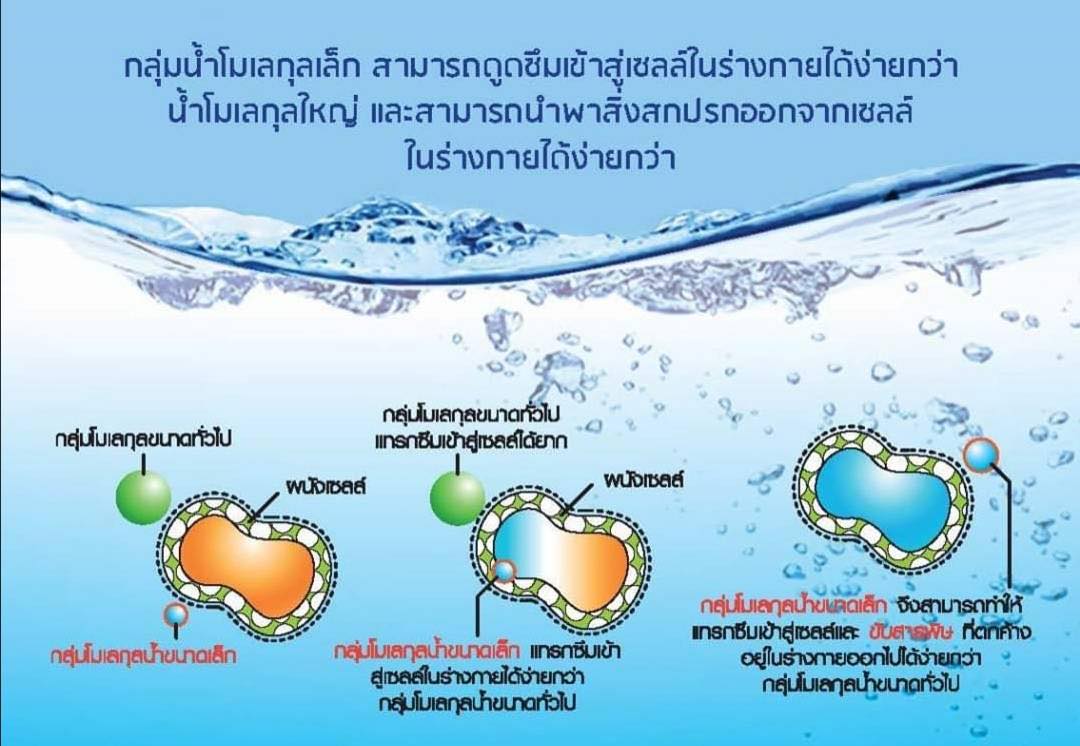ㆍ สามารถผ่านผนังเซลล์ได้ง่าย . น้ำมีแรงตึงผิวต่ำ จึงสามารถทำละลายได้ดี ㆍมีปริมาณออกซิเจนสูง ㆍมีคุณสมบัติเป็นด่างอ่อนๆ (pH 7.5-8.0) ㆍช่วยต่อต้านอนุมูลอิสระ