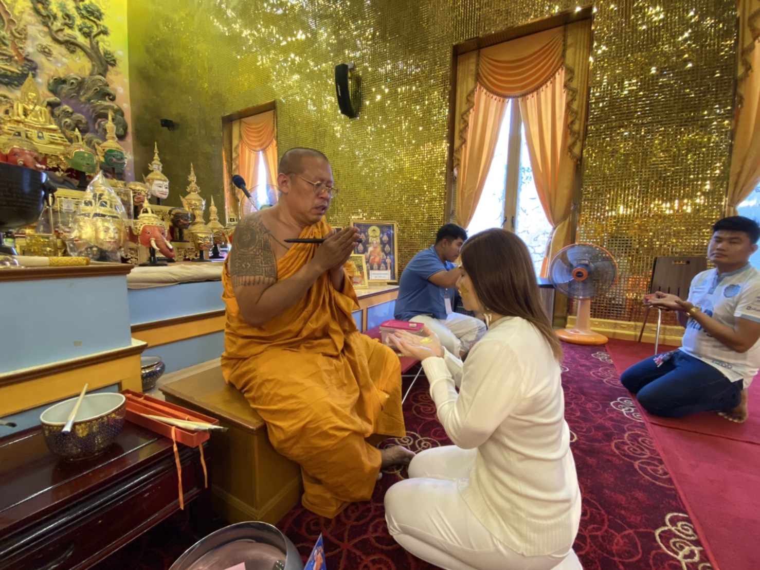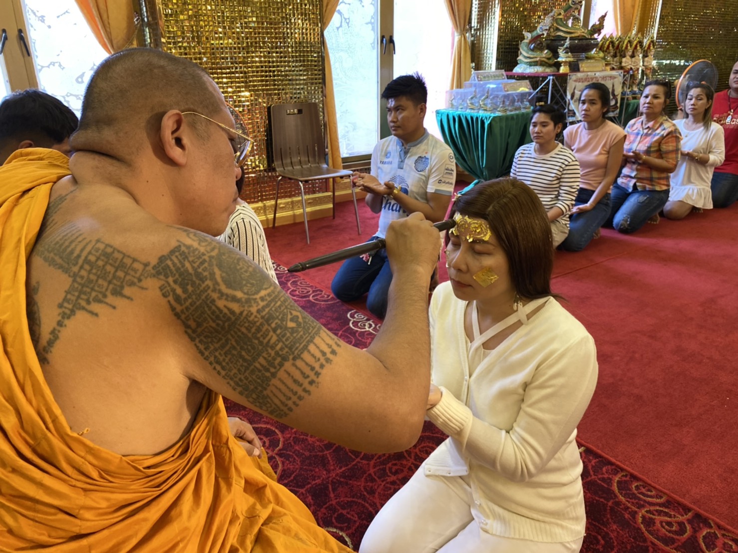 พระครูปลัดสิทธิวัฒน์(หลวงพี่น้ำฝน)เจ้าอาวาสวัดไผ่ล้อม อำเภอเมือง จังหวัดนครปฐม ทำพิธี ลงนะหน้าทอง บริกรรมพระคาถาอธิษฐานจิตลงอักขระยันต์ ‘นะเมตตาม้วนโลก’ จารลงที่เนื้อทองคำ ให้ละลายหายเข้าไปที่แก้มทั้ง 2 ข้าง จากนั้นก็จะลงอักขระเขียนยันต์ล้อมรอบบริเวณที่ปาก ด้วยยันต์นะเมตตา มหาละลวย พูดจาปราศรัย มีแต่คนรัก คนเมตตา เกิดเป็นมหาเสน่ห์ มหามงคล ปิดทองบริเวณ มือซ้าย 1 แผ่น มือขวา 1 แผ่น โดยจะบริกรรมพระคาถา อธิษฐานจิตลงอักขระยันต์ ‘นะเมตตาม้วนโลก’ เพื่อความเป็นสิริมงคล