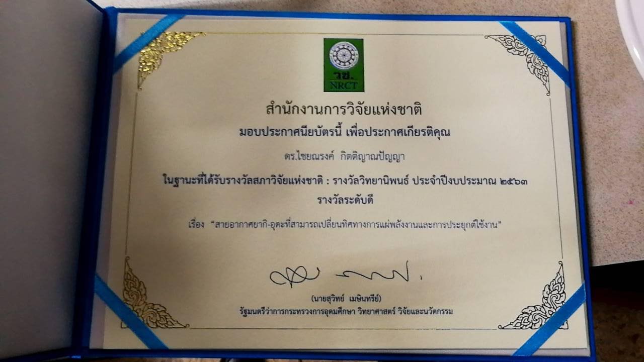 ขอแสดงความยินดี กับ ดร.ไชยณรงค์ กิตติญาณปัญญา อาจารย์ประจำสาขาวิชาวิศวกรรมเมคคาทรอนิกส์ คณะวิศวกรรมศาสตร์ มทร.รัตนโกสินทร์ ที่ได้รับเชิญให้เข้ารับรางวัลสภาวิจัยแห่งชาติ รางวัลวิทยานิพนธ์ ประจำปีงบประมาณ 2563 เรื่อง “สายอากาศยากิ – อุดะที่สามารถเปลี่ยนทิศทางการแผ่พลังงานและการประยุกต์ใช้งาน” รางวัลระดับดี สาขาวิศวกรรมศาสตร์และอุตสาหกรรมวิจัย จากสำนักงานวิจัยแห่งชาติ (วช.) ในงานวันนักประดิษฐ์ ประจำปี 2563 เมื่อวันที่ 2 กุมภาพันธ์ 2563 จัดโดยสำนักงานการวิจัยแห่งชาติ (วช.) ร่วมกับสถาบันการศึกษา หน่วยงานภาครัฐและเอกชน ซึ่งเป็นการจัดงานครั้งที่ 22