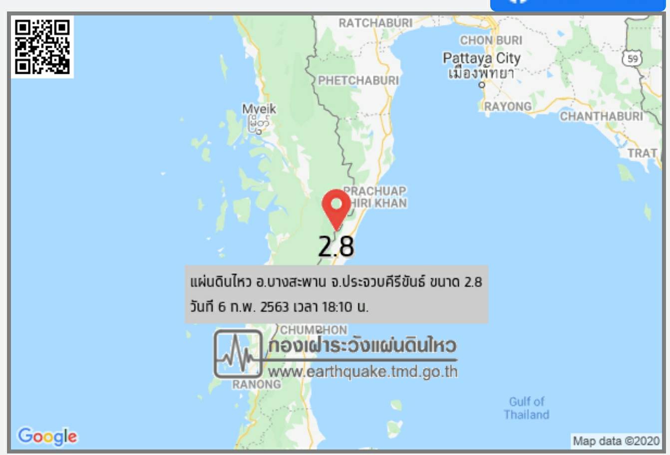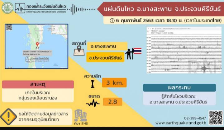 วันที่ 6 ก.พ.63 ผู้สื่อข่าวรายงานว่า ได้เกิดเหตุแผ่นดินไหวและสั่นสะเทือน บริเวณ อำเภอบางสะพาน และอำเภอทับสะแก จังหวัดประจวบคีรีขันธ์ ทำให้ประชาชนแตกตื่นเป็นจำนวนมาก โดยเเว๊ปไซด์กรมอุตุนิยมวิทยาได้แจ้งประกาศแผ่นดินไหว วันที่ 6 กุมภาพันธ์ 2563 เวลา 18:10 น. จุดศูนย์กลางอยู่ที่ อ.บางสะพาน จ.ประจวบคีรีขันธ์ (11.46°N,99.41°E) ขนาด 2.8 ริกเตอร์ ลึกจากผิวดิน 3 กิโลเมตร ทำให้รู้สึกสั่นไหวที่ อ.บางสะพานนายเลิศยศ แย้มพราย กล่าวว่า หลังได้รับแจ้งจึงประสานกำนัน ผู้ใหญ่บ้าน ผู้บริหารองค๋การปกครองส่วนท้องถิ่นทั้ง7 ตำบล ให้เร่งสำรวจในเบื้องต้นว่ามีความเสียหายหรือไม่ หากพบความเสียหายให้รายงานกับนายอำเภอโดยตรงอย่างเร่งด่วน โดยขณะนี้ได้รับรายงานมีความเสียหายไม่มากนักเป็นทรัพย์สินภายในบ้านตกแตก อย่างไรก็ดีได้เฝ้าติดตามประสานงานกับกรมอุตุนิยมวิทยาตลอดเวลาด้าน นายปรีดา สุขใจ นายอำเภอทับสะแก กล่าวว่า ได้รับรายงานการเกิดแผ่นดินไหวของอำเภอทับสะแก จำนวน 2 ตำบล ได้แก่ ต.อ่างทอง และ ต.นาหูกวาง เบื้องต้นยังไม่ได้รับรายงานความเสียหาย แต่ได้สั่งการให้ผู้นำหมู่บ้านเฝ้าระวัง พร้อมสำรวจความเสียหายและให้แจ้งทางอำเภอทราบอย่างเร่งด่วน เพื่อที่จะเข้าให้การช่วยเหลือ