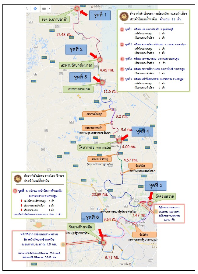 ซึ่งรองอธิบดีกรมโยธาธิการและผังเมือง กล่าวว่า กรมโยธาธิการและผังเมือง มีเรือดำเนินการแก้ไขปัญหาผักตบชวาอยู่ในแม่น้ำท่าจีนอย่างต่อเนื่องอยู่แล้ว โดยมีสถานีกั้นทุ่นดักผักตบชวา จำนวน 6 จุด ได้แก่ จุดที่ 1 บริเวณอ.บางปลาม้า จ.สุพรรณบุรี จุดที่ 2 บริเวณสะพานวัดบางไผ่นารถ จุดที่ 3 บริเวณสะพานบางเลน จุดที่ 4 บริเวณสะพานวัดบางพระ จุดที่ 5 บริเวณหน้าวัดดอนหวาย และจุดที่ 6 บริเวณหน้าวัดบางช้างเหนือ จ.นครปฐม และมีเรือดำเนินการจำนวน 11 ลำ ประกอบไปด้วย รถแบ็คโฮบนพอนทูน 4 ลำ เรือสายพานลำเลียง 6 ลำ เรือตักขนาดเล็ก 1 ลำ ส่วนในพื้นที่จังหวัดนครปฐม มีเรือดำเนินการอยู่ จำนวน 9 ลำ ซึ่งอยู่ในพื้นที่อำเภอสามพราน 5 ลำ อำเภอนครชัยศรี 2 ลำ และอำเภอบางเลน 2 ลำ แต่ด้วยปริมาณของผักตบที่มีจำนวนมากทำให้มีผักตบชวาล้นออกจากสถานีและไหลไปตามกระแสน้ำ กรมโยธาธิการและผังเมือง มีความห่วงใยพี่น้องประชาชนที่ใช้การคมนาคมทางน้ำเป็นอย่างมาก จึงได้เร่งรัดเจ้าหน้าที่ให้เฝ้าติดตามสถานการณ์อย่างใกล้ชิด และพบว่า ผักตบชวาจะลอยมาตามสภาวะน้ำขึ้นน้ำลงตามธรรมชาติ ช่วงน้ำลงผักตบชวาจะไหลลงปากอ่าว แต่พอน้ำขึ้นผักตบชวาจะไหลกลับมาที่เดิม และยิ่งช่วงฤดูร้อนผักตบชวาจะขยายพันธ์อย่างรวดเร็ว อย่างไรก็ตามขณะนี้กรมโยธาธิการและผังเมืองได้เฝ้าติดตามสถานการณ์อย่างต่อเนื่อง