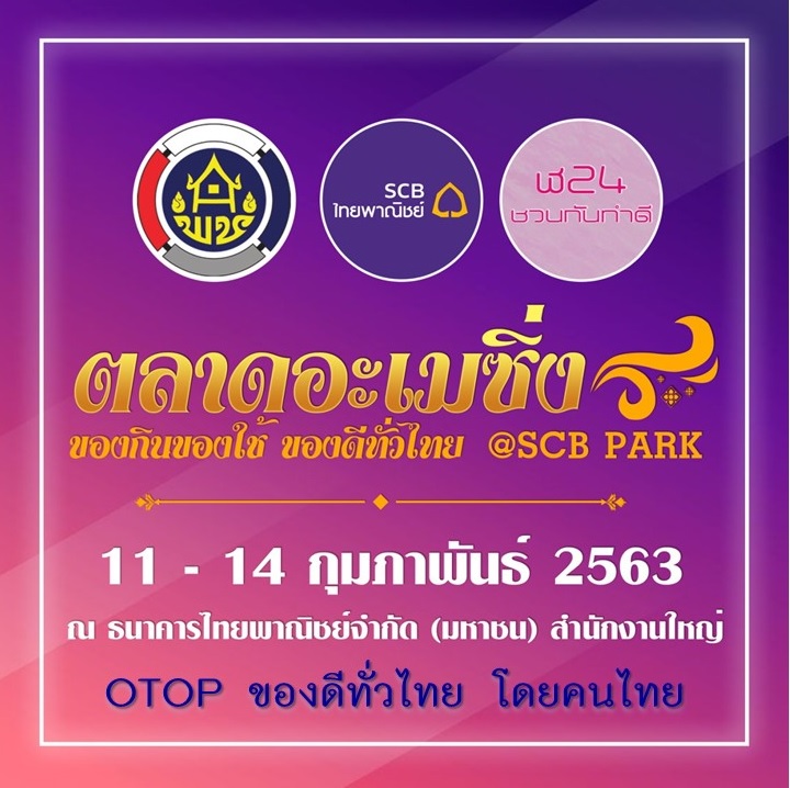 กรมการพัฒนาชุมชน ร่วมกับธนาคารไทยพาณิชย์ จำกัด (มหาชน) ยกขบวนผู้ประกอบการ OTOP ทั่วประเทศ เปิด“ตลาดอะเมซิ่ง ของกิน ของใช้ ของดีทั่วไทย@ SCB Park” ระหว่างวันที่ 11 – 14 กุมภาพันธ์ 2563 ตั้งแต่เวลา 08.30 – 17.00 น. ณ ธนาคารไทยพาณิชย์ สำนักงานใหญ่ ถนนรัชดาภิเษก เขตจตุจักร กรุงเทพมหานคร