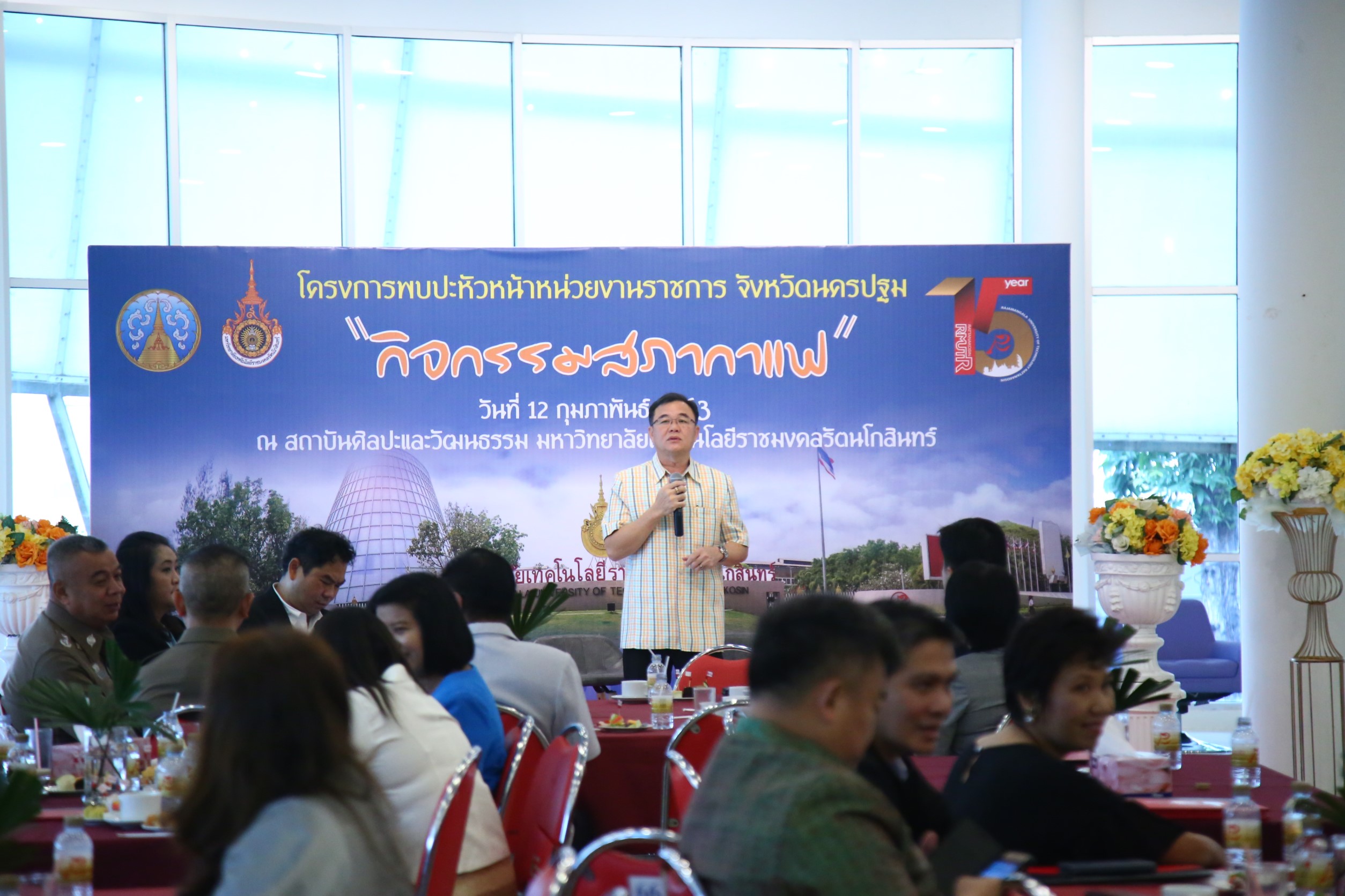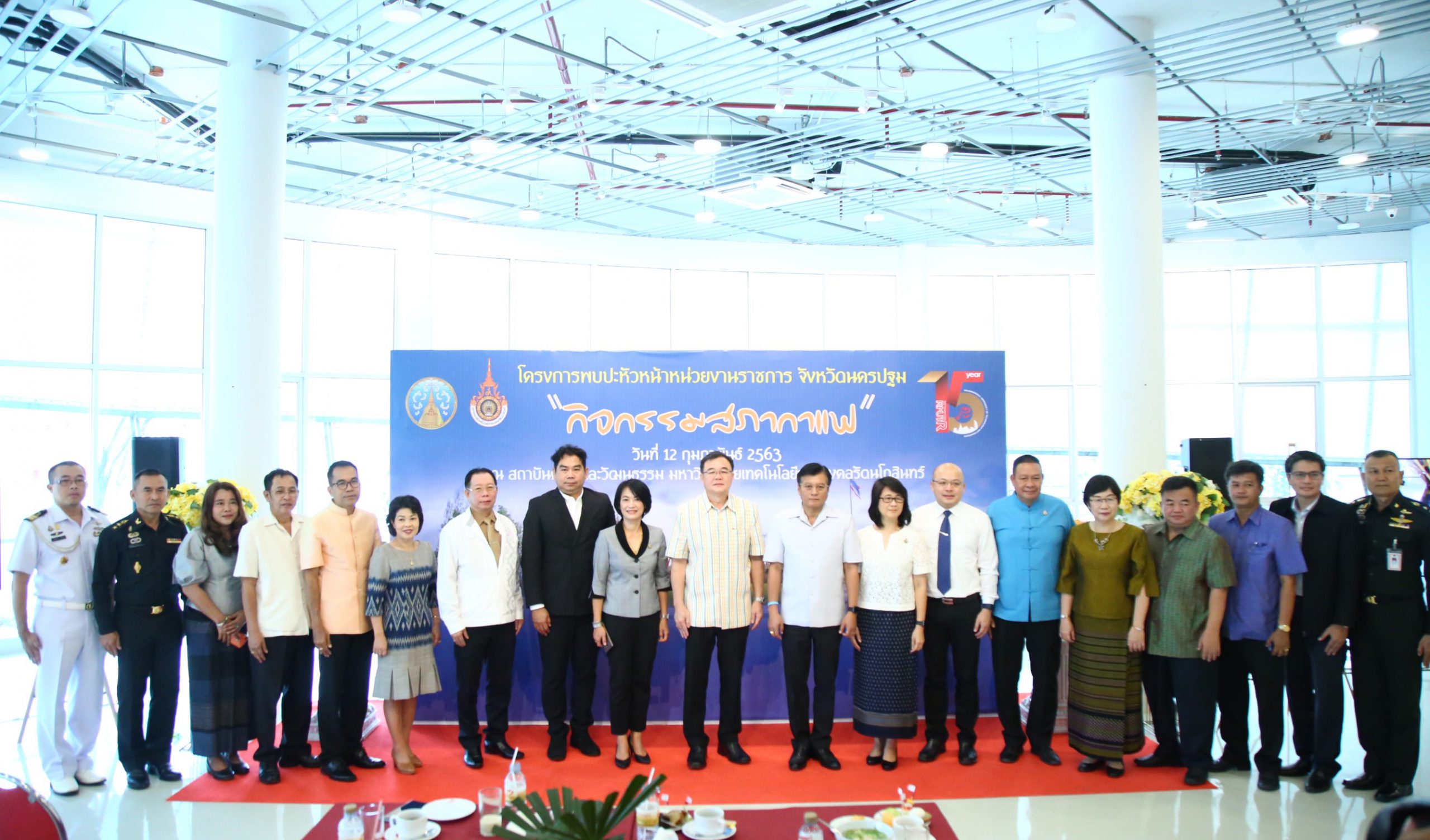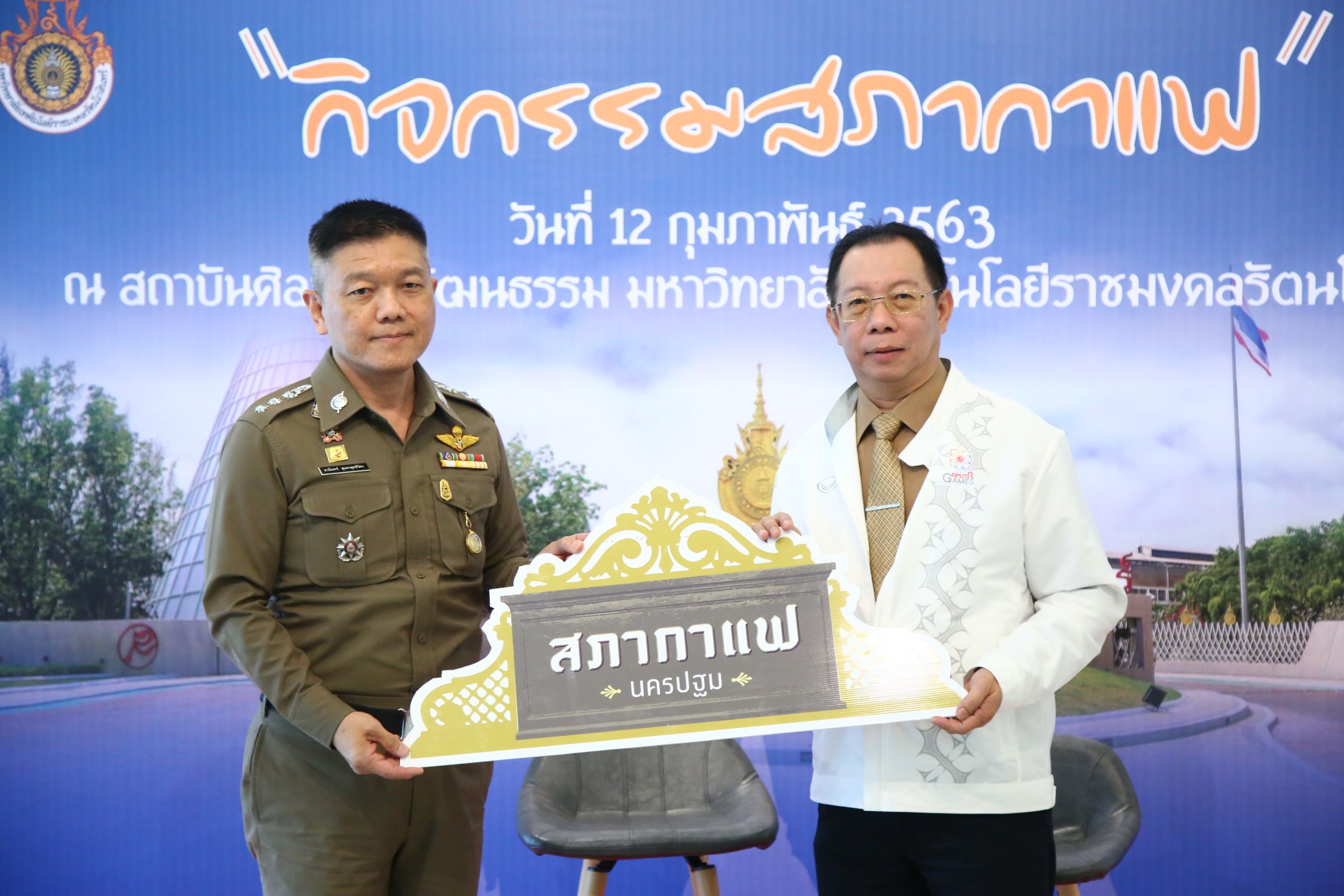 ในวันพุธที่ 12 กุมภาพันธ์ 2563 มทร.รัตนโกสินทร์ โดย ผศ.ศิวะ วสุนธราภิวัฒก์ อธิการบดี มอบหมายให้ ผศ.ดร.กฤชกนก สุทัศน์ ณ อยุธยา รองอธิการบดี กล่าวต้อนรับ หัวหน้าส่วนราชการเเละผู้เข้าร่วมโครงการพบปะหัวหน้าส่วนราชการ “สภากาแฟ” ประจำเดือนกุมภาพันธ์ 2563 โดยมี นายขจรเกียรติ รักพาณิชมณี รองผู้ว่าจังหวัดนครปฐม เป็นประธานเปิดโครงการ ณ สถาบันศิลปะและวัฒนธรรม มหาวิทยาลัยเทคโนโลยีราชมงคลรัตนโกสินทร์