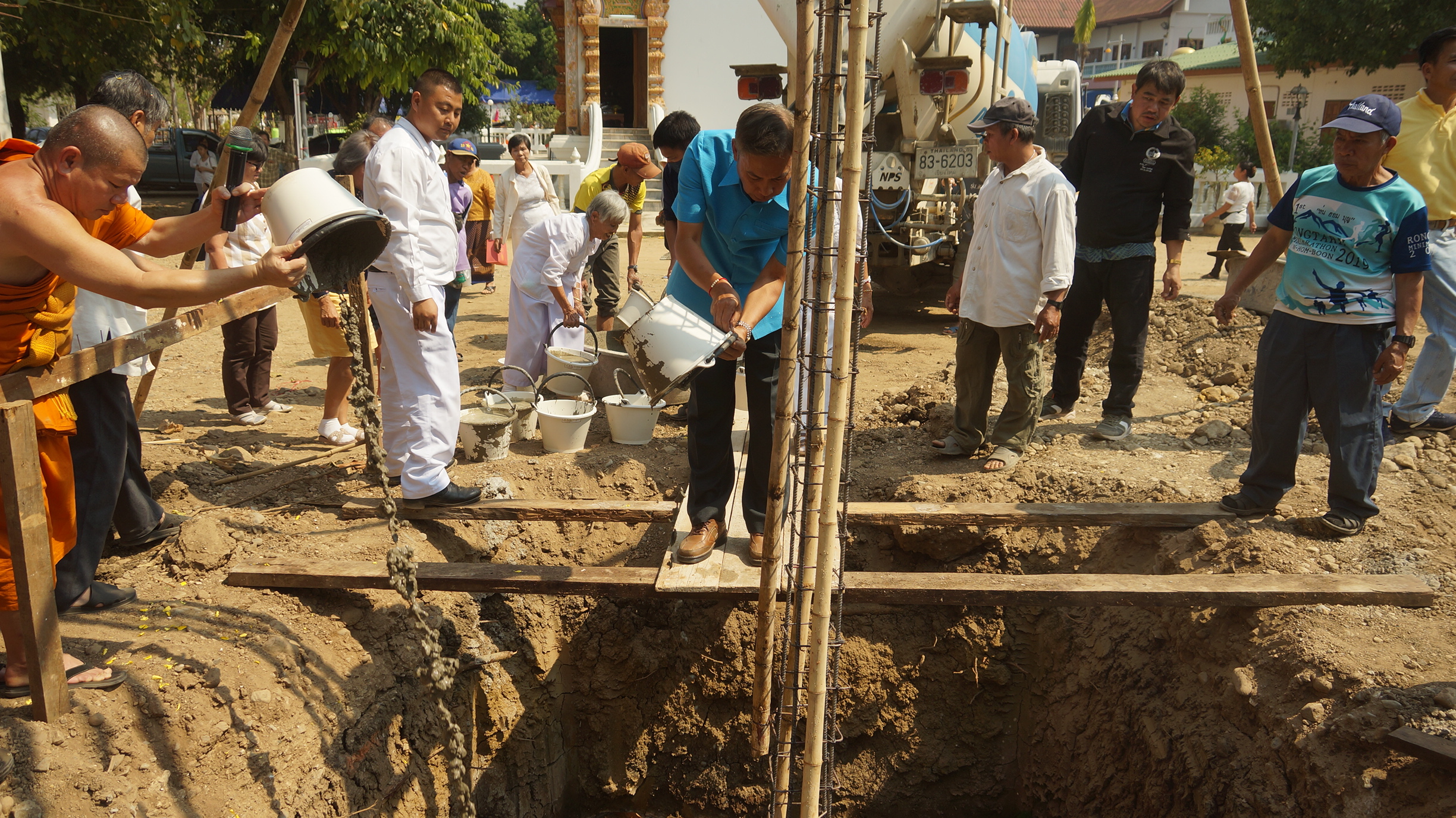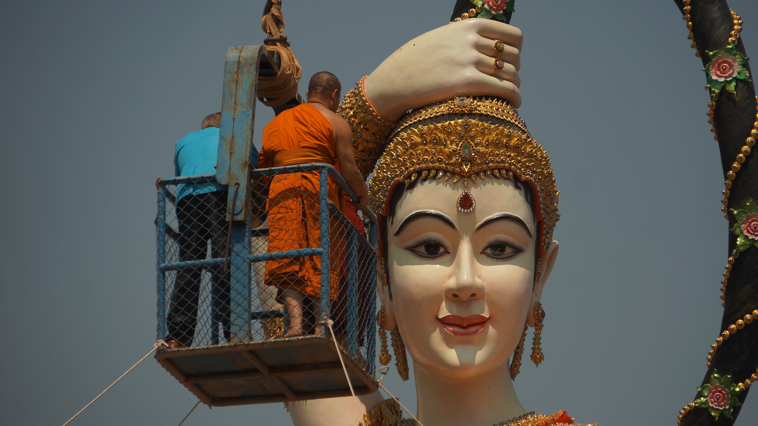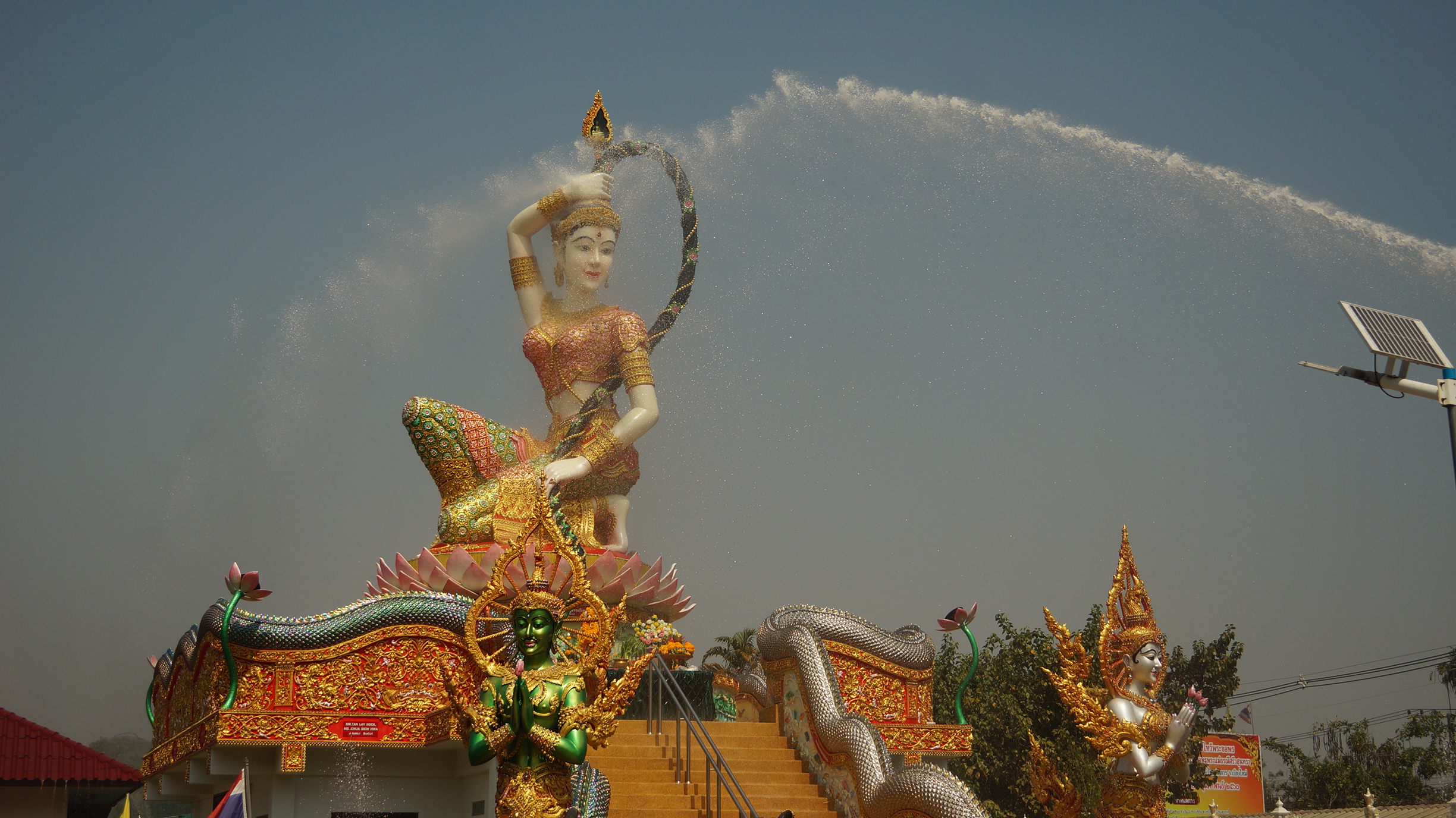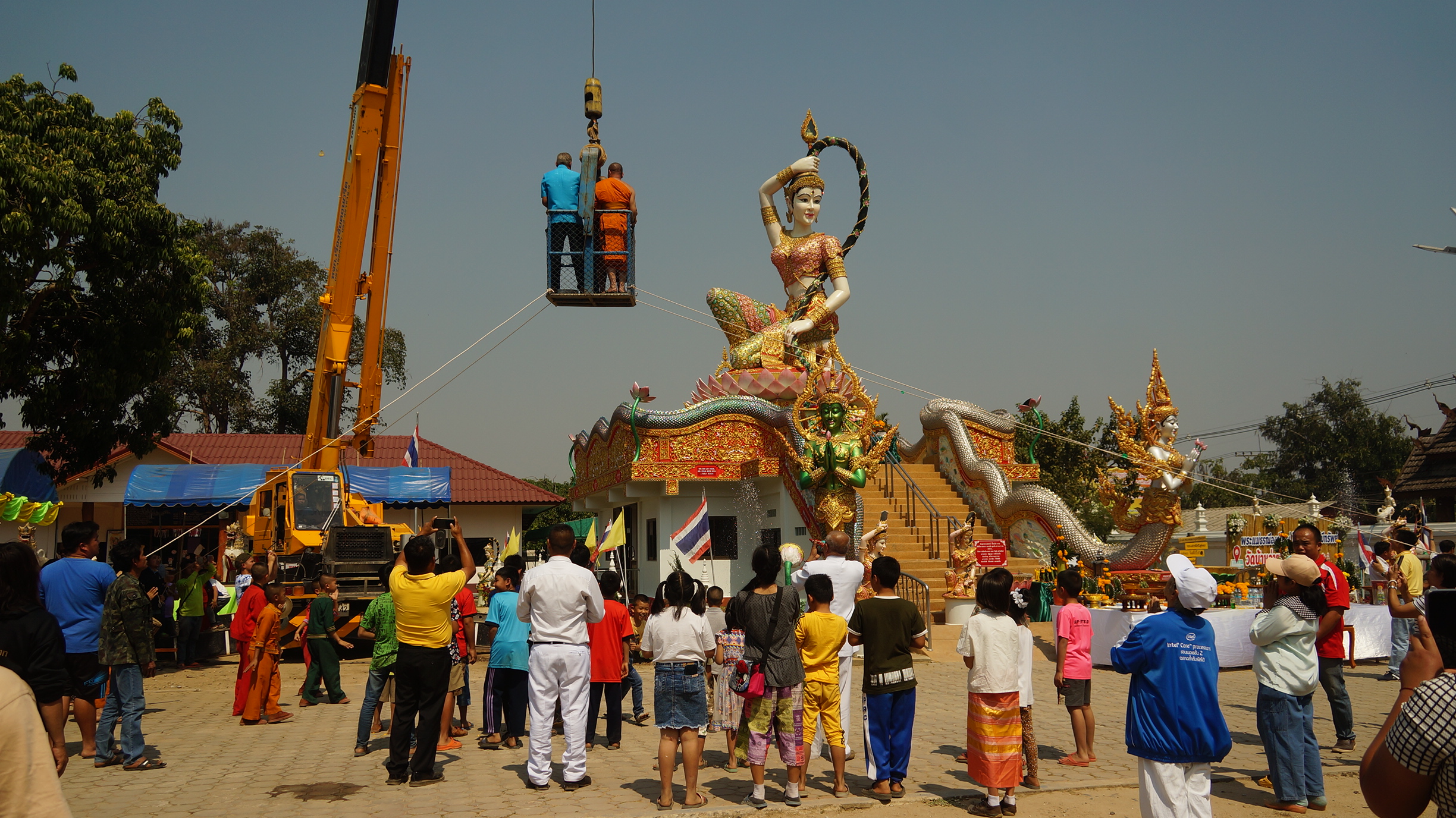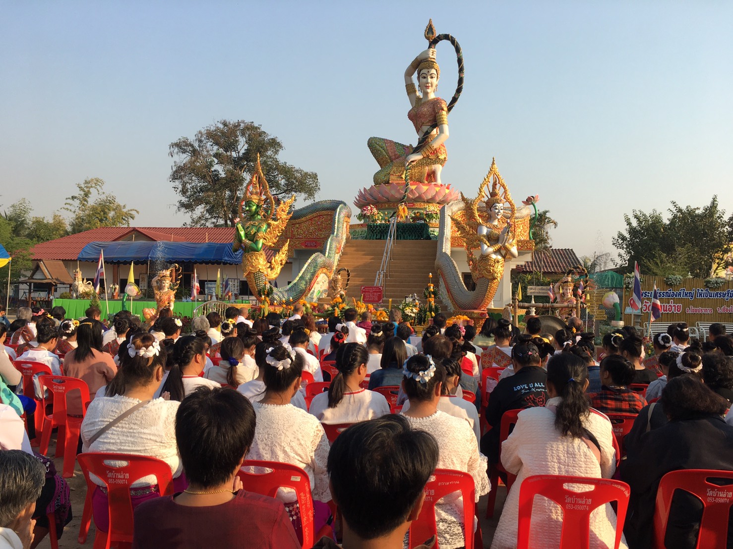 พระครูวิมลบุญญาคม เจ้าอาวาสวัดบ้านอ่ายเจ้าคณะตำบลศรีดงเย็น อำเภอไชยปราการ จังหวัดเชียงใหม่ ได้ร่วมกับพลังศรัทธาของญาติธรรมพร้อมใจกันร่วมบริจาคเงินสร้างเจ้าแม่ธรณีบีบมวยผมมหาธรณีศรีวสุนทรา ขึ้นเพื่อเป็นสิ่งยึดเหนี่ยวจิตใจ เพราะเป็นพระที่มีตำนานในพระพุทธศาสนา มีความสูงเท่ากับตึก4 ชั้น ใช้เวลาสร้างมานานกว่า 3 ปี จนแล้วเสร็จ จึงได้ทำพิธี บวงสรวงอาหารมังสวิรัติ ตามความเชื่อของชาวล้านนา และสวดเจริญพระพุทธมนต์โดยมีพระครูประภัคร์ธรรมรังษี เจ้าอาวาสวัดกู้เต้า เจ้าคณะตำบลศรีภูมิ เขต3 อำเภอเมือง จังหวัดเชียงใหม่ มาเป็นพระประธานสงฆ์พร้อมกับ พระสงฆ์จำนวน59 รูปทอดผ้าป่ามหาธรณีศรีวสุนทรา แล้วทำพิธีล้างหน้ามหาธรณีศรีวสุนทราตามความเชื่อ โดยมีนายเจษฏา สรณวิช ผู้พิพากษาอาวุโสในศาลอุทธรณ์ มาเป็นประธานฝ่ายฆาราวาส ช่วงเช้าได้ทำการบวงสรวง
