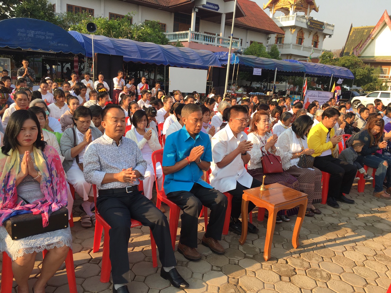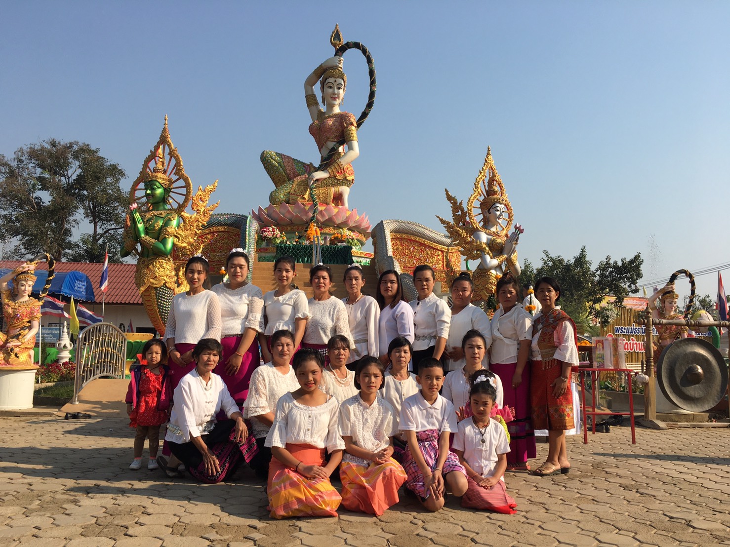 โดยมีนางรำหรือช่างฟ้อนจำนวน 109 คน ได้มาทำการร่ายรำถวายในพิธี โดยเป็นนางรำจากหลายหมู่บ้านและนางรำนักเรียนจากโรงเรียนบ้านอ่าย ชาวบ้านบ้านอ่าย ที่เป็นฝ่ายรำถวายในงานบวงสรวง มหาธรณีศรีวสุนทรา(เจ้าแม่ธรณีบีบมวยผม) เพื่อให้เกิดสิริมงคลกับหมู่บ้านและญาติธรรมที่มีความเลื่อมใสใน มหาธรณีศรีวสุนทรา(เจ้าแม่ธรณีบีบมวยผม) และได้ร่วมกันยกเสาเอกเพื่อสร้างกุฏิสงฆ์สามเณร เพื่อใช้เป็นที่พักของพระสงฆ์และสามเณรที่มาอาศัยวัดในการปฏิบัติธรรมและเรียนพระธรรมวินัย และมีปอยหลวงการเฉลิมฉลองมหาธรณีศรีวสุนทรา(เจ้าแม่ธรณีบีบมวยผม)เป็นเวลา 3 คืน เชิญชวนพุทธศาสนิกชนที่มีความเลื่อมใสในมหาธรณีศรีวสุนทรา(เจ้าแม่ธรณีบีบมวยผม) สามารถเดินทางมาทำการนมัสการได้ที่วัดสันต้นเปา หรือวัดบ้านอ่าย ตำบลศรีดงเย็น อำเภอไชยปราการ จังหวัดเชียงใหม่ ได้ทุกวัน