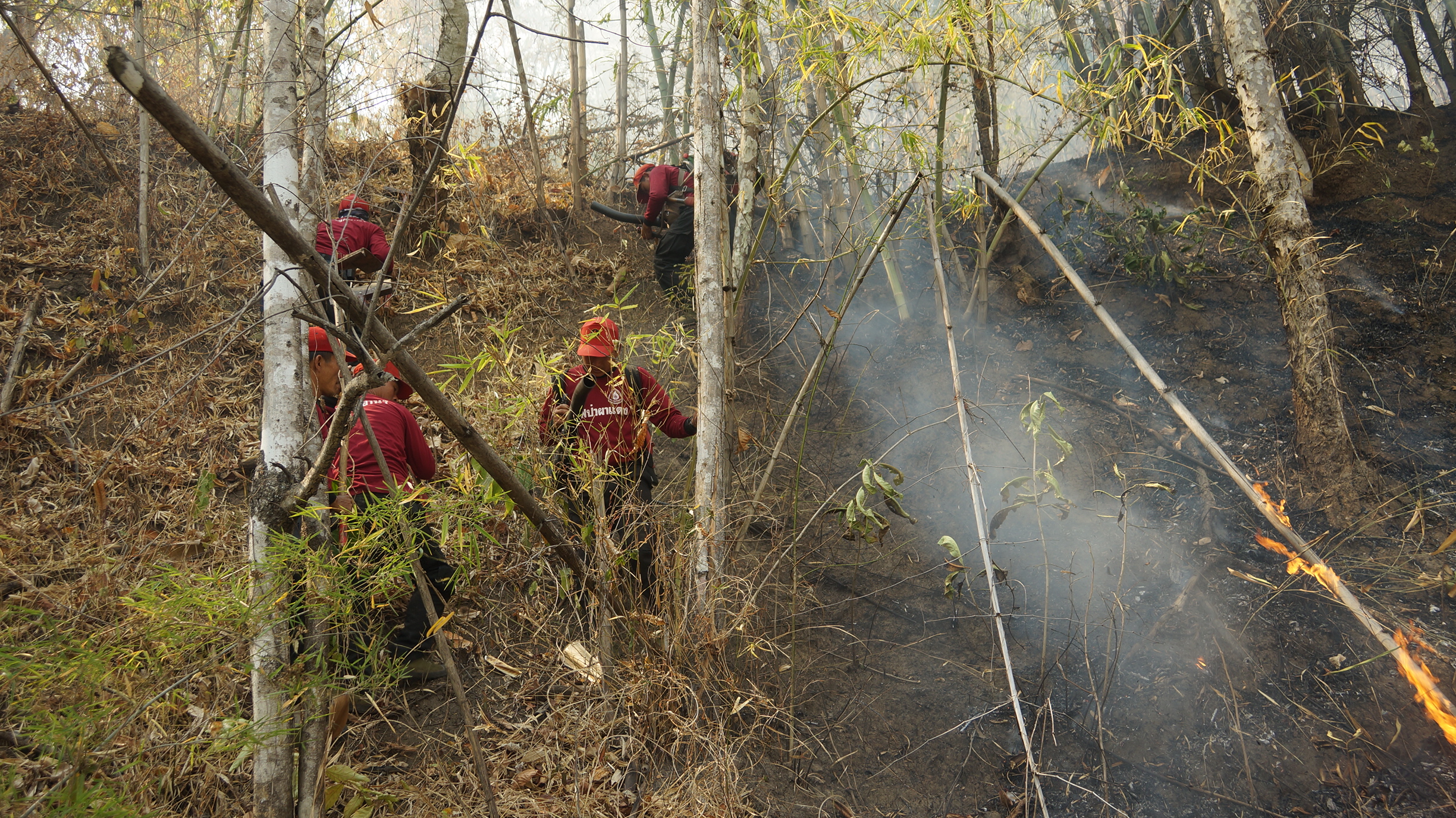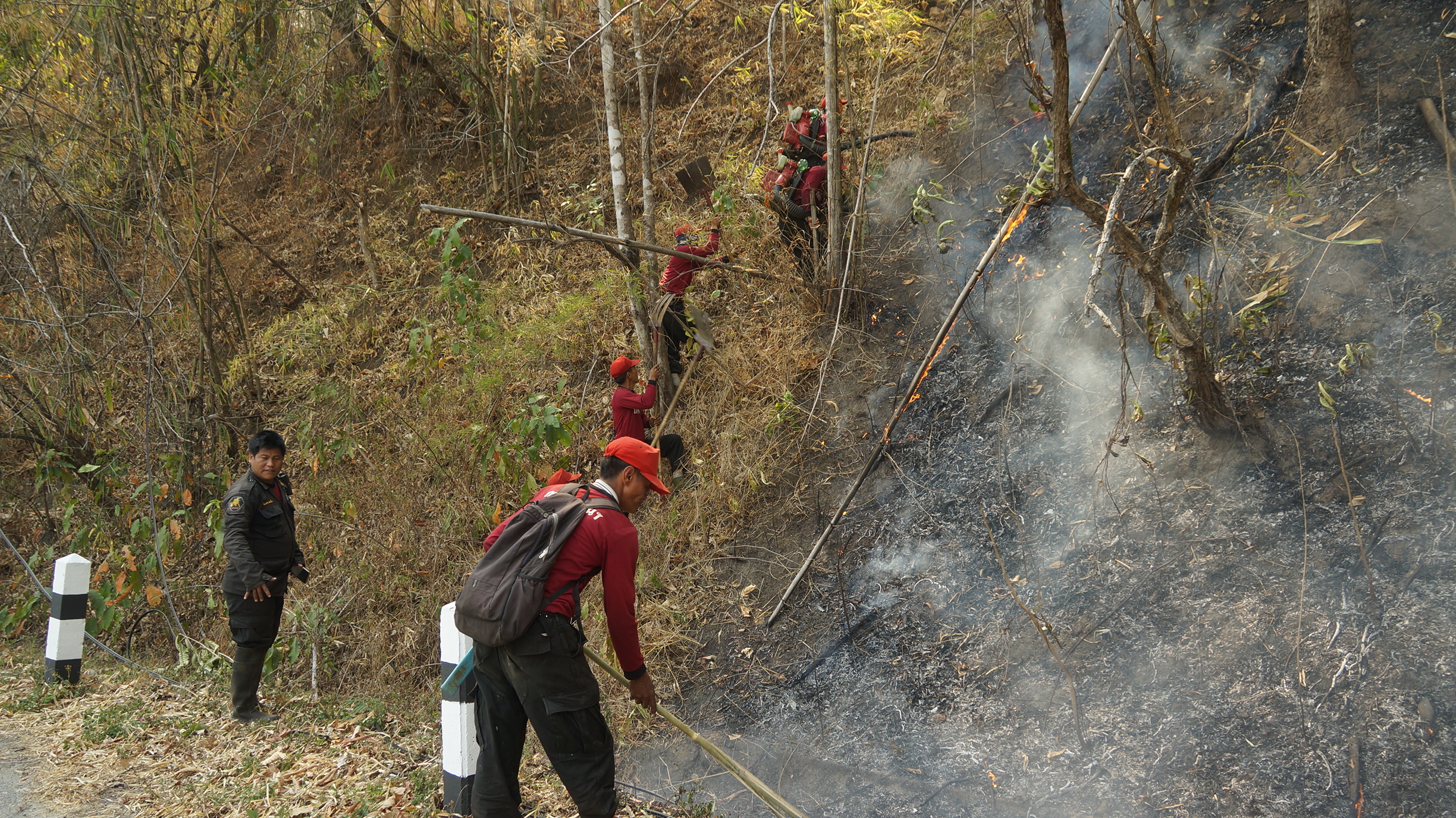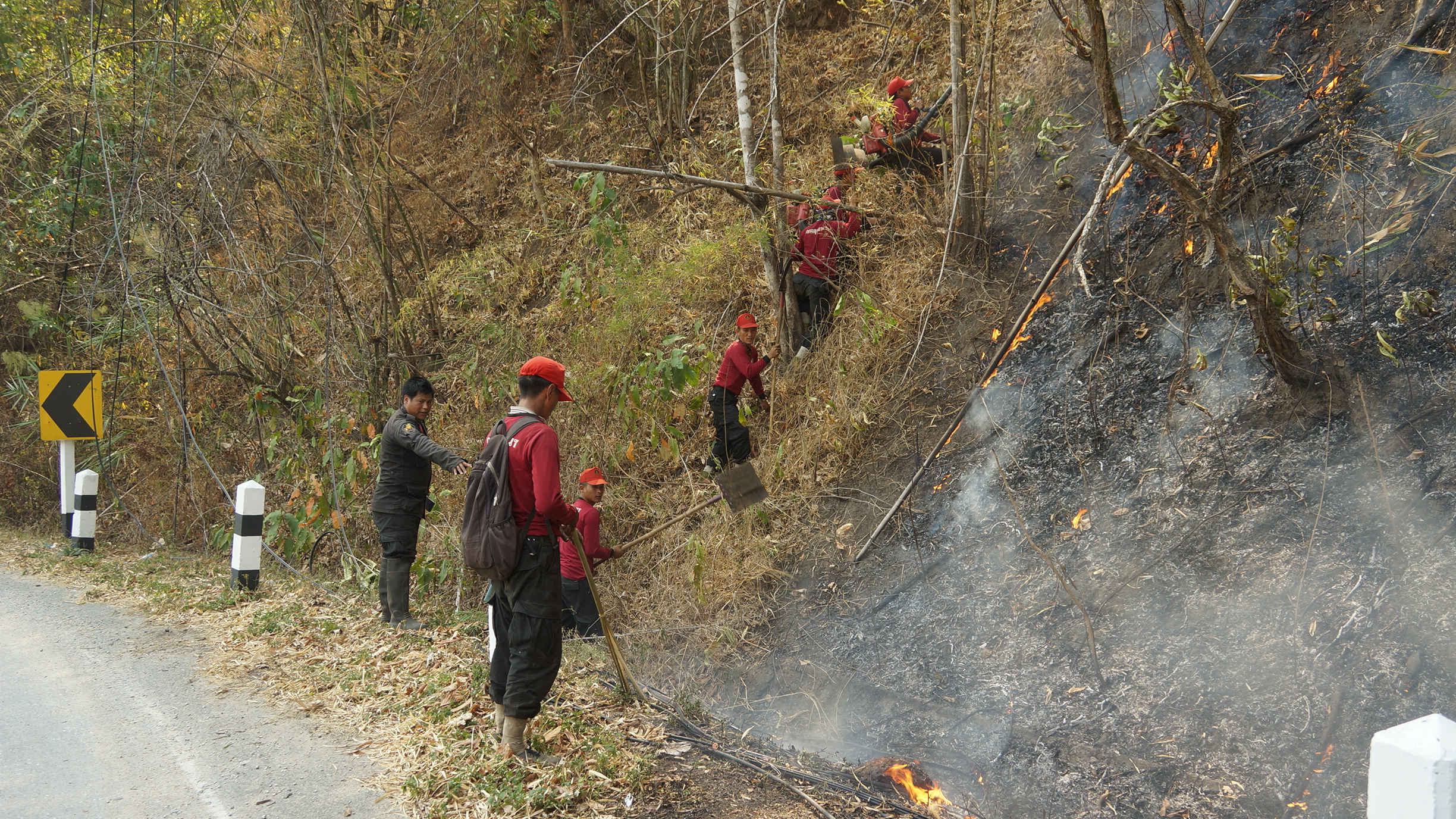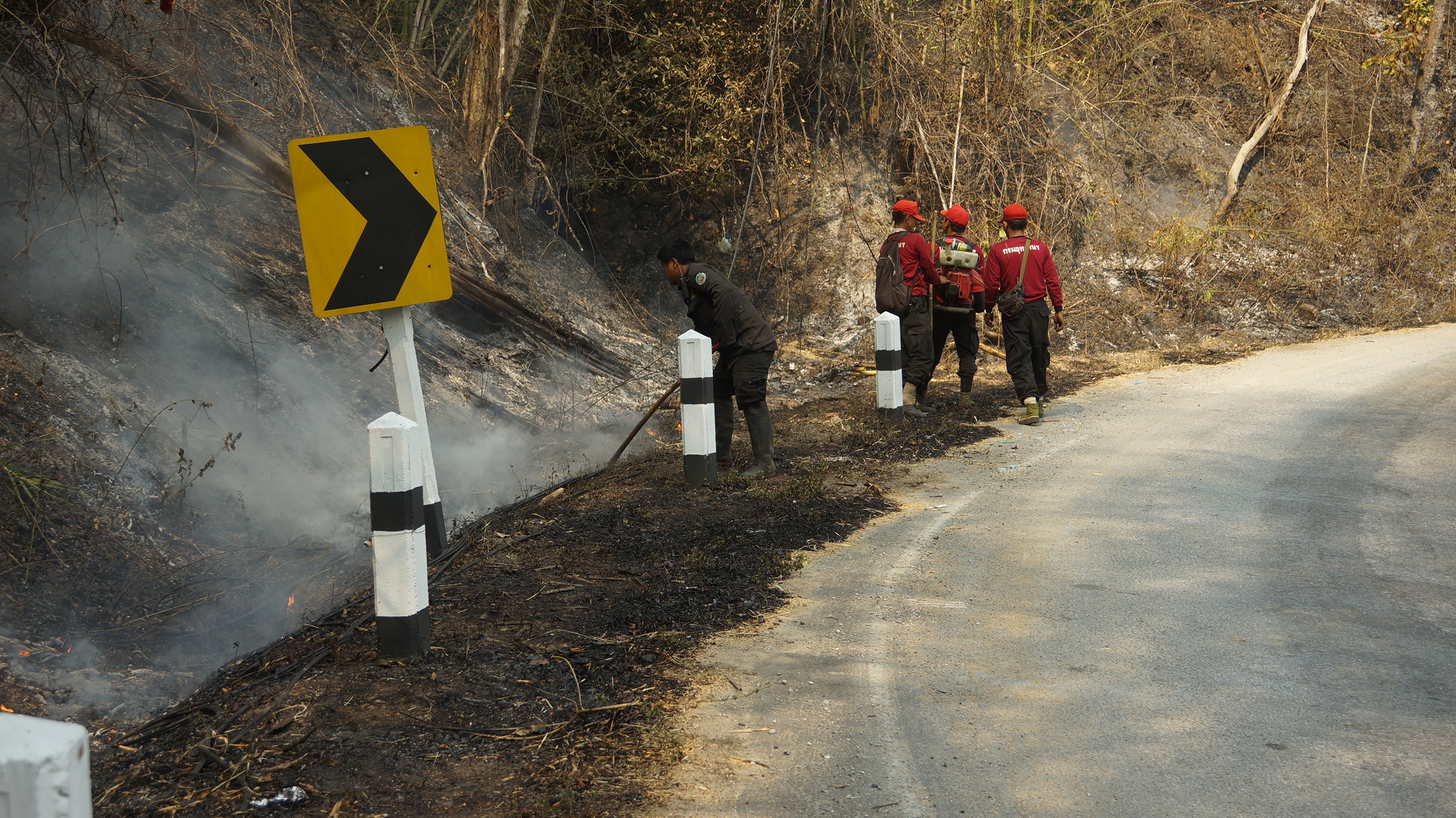 เพื่อดับไฟป่า และไฟไหม้สองข้างทางหลวง และยังลุกลามไหม้สายอินเตอร์เนต ไนบางจุดที่ติดตั้งต่ำเกินไปจะถูกไฟป่าลุกไหม้และเป็นยางพลาสติกเป็นเชื้อเพลิงอย่างดี ในเช้านี้ที่บ้านหัวโท ตำบลปิงโค้ง อำเภอเชียงดาว จังหวัดเชียงใหม่ ช่วง กิโลเมตรที่ 109-112 จะมีไฟป่าติดติดต่อกันหลายจุดซึ่งเจ้าหน้าที่ก็ได้ปีนเขาดับไฟป่ากัน อย่างหนักแทบไม่มีเวลาหยุด ทางนายอังคาร แสนเป็ง หัวหน้าชุดดับไฟป่า อำเภอเชียงดาว-อำเภอไชยปราการ จังหวัดเชียงใหม่ ได้นำลูกน้องออกดับไฟทั้งวันและทั้งคืน จึงได้ออกมาแจ้งทางสื่อว่าขอชาวบ้านประชาชนที่ขับรถใช้เส้นทางนี้โปรดกรุณาช่วยกันด้วย อย่าทิ้งก้นบุหรี่ลงข้างทาง ที่มีหญ้าแห้ง หรืออย่าทิ้งลงบนถนนเพราะลมจะพัดเข้าในป่าเกิดการเผาไหม้และลุกลามอย่างรวดเร็ว และอาจเข้าไหม้บ้านได้ และยังเป็นการทำลายธรรมชาติทางอ้อมเกิดความเสียหายอย่างมากๆ เกิดความเสียหาต่อทรัพย์สินของประเทศชาติ เป็นต้นไม้สำคัญที่อนุรักษ์ และอาจทำลายทรัพย์สินของประชาชน จึงขอความร่วมมือด้วย ซึ่งถ้าใครพบเห็นขอแจ้งเจ้าหน้าที่ด้วยเพราะจะได้เข้าไปเก็บกวาดและไล่ดับไฟป่าก่อนไม่ให้ขยายไปเข้าบ้านพักอาศัยของชาวบ้านได้ใครสามารถจับคนเผาได้มีรางวัลให้ไปรับที่นายอำเภอแต่ละเขตได้เลย