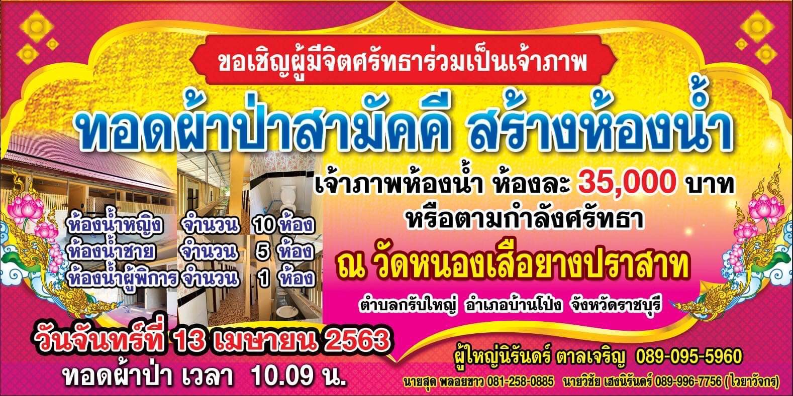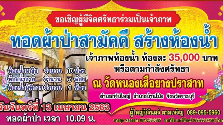 ขอเชิญร่วมเป็นเจ้าภาพ ทอดผ้าป่าสามัคคี สร้างห้องน้ำ เนื่องด้วยทางวัดหนองเสือยางประสาท ต. กรับใหญ่ อ. บ้านโป่ง จ. ราชบุรี ซึ่ง มี พระมหาสุกฤติ สฺขวฑฺฒโก เจ้าอาวาสวัดหนองเสือยางประสาท และคณะกรรมการประชุม เห็นว่า ห้องน้ำเก่าชำรุดทรุดโทรมลงตามกาลเวลา ทางวัดจึง จัดให้มีการทอดผ้าป่าสามัคคี มีความประสงค์สร้างห้องน้ำหญิง จำนวน 10 ห้อง ห้องน้ำชายจำนวน 5 ห้อง ห้องน้ำผู้พิการจำนวน 1 ห้อง ราคาห้องละ 35,000 บ. กำหนดการ วันจันทร์ที่ 13 เมษยน 2563 เวลา 10.00 น. พิธีทอดผ้าป่าสามัคคี