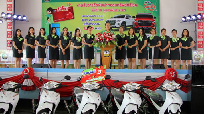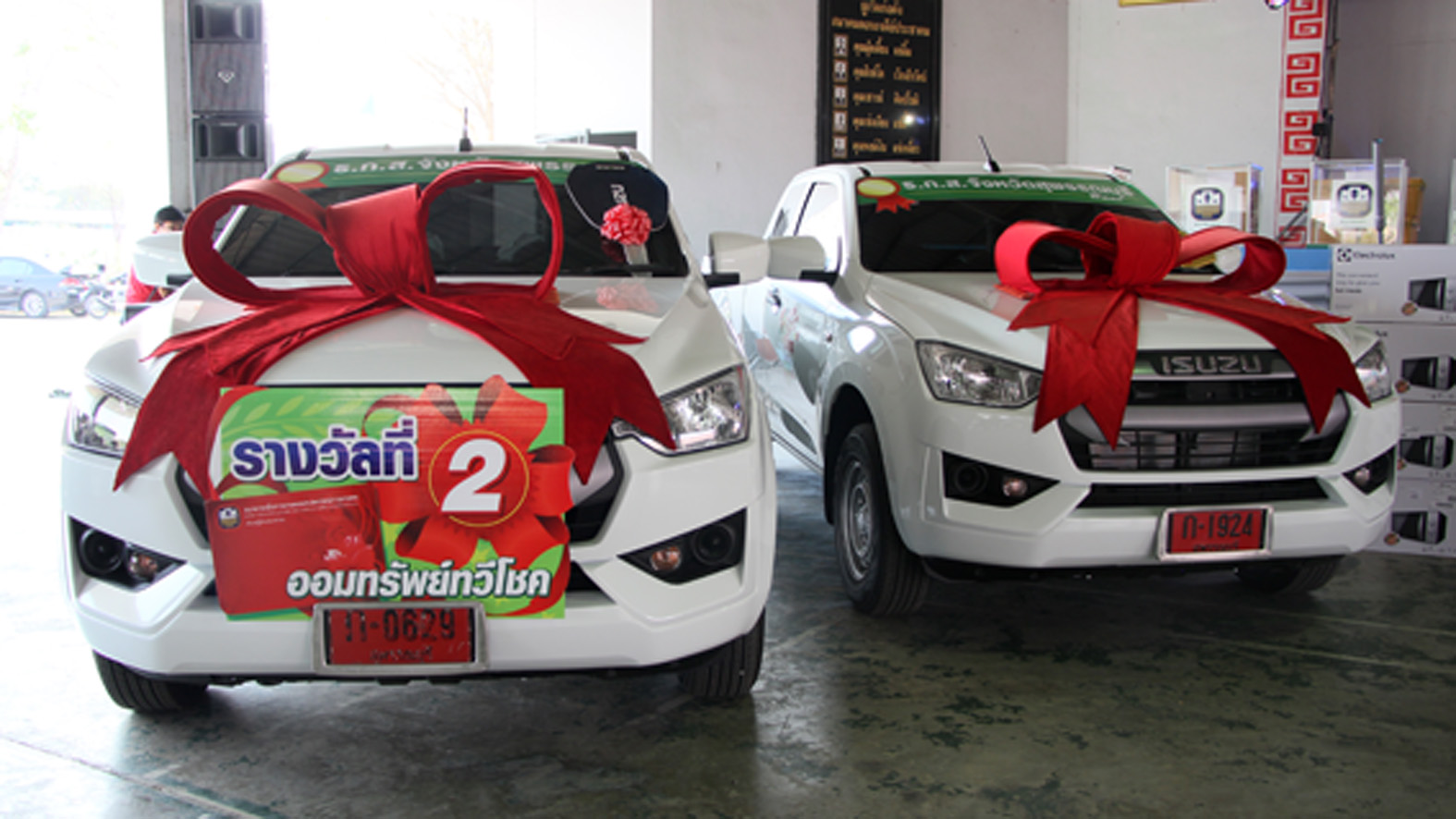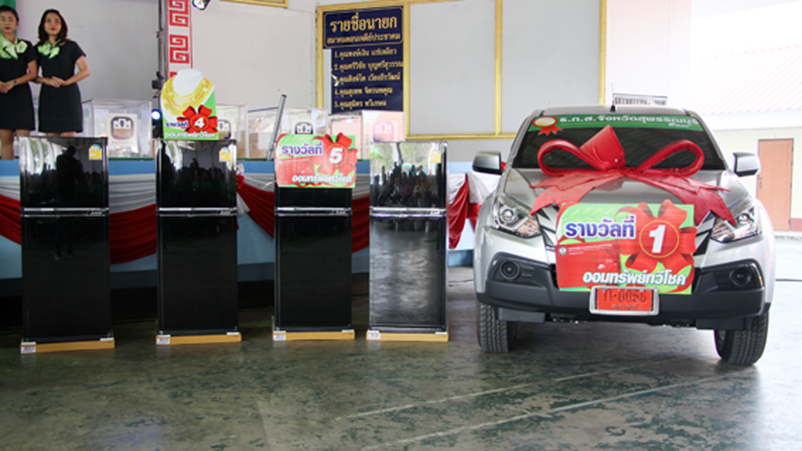 สำหรับผู้โชคดีได้รับรางวัลที่ 1 รถยนต์ 7 ที่นั่ง 1 คัน คือนางสาวเมธารี ปัญญานรกุล ลูกค้า ธ.ก.ส.สาขาสองพี่น้อง ส่วนผู้โชคดีได้รับรางวัลที่ 2 รถยนต์กระบะ CAB จำนวน 3 รางวัล ประกอบด้วยนาย 1.นายสำเนา ขยันสะการ ลูกค้า ธ.ก.ส.สาขาเดิมบางนางบวช 2.พระระวุฒิ สุทธจิตโต (ระวุฒิ แจ้งมงคล) ลูกค้า ธ.ก.ส.สาขาสามชุก 3.นางละเอียด ศรีเหรา ลูกค้า ธ.ก.ส.สาขา อู่ทอง ลูกค้า ธ.ก.ส.สามารถติดต่อสอบถามรายละเอียดได้ที่ ธ.ก.ส.ได้ทุกสาขา