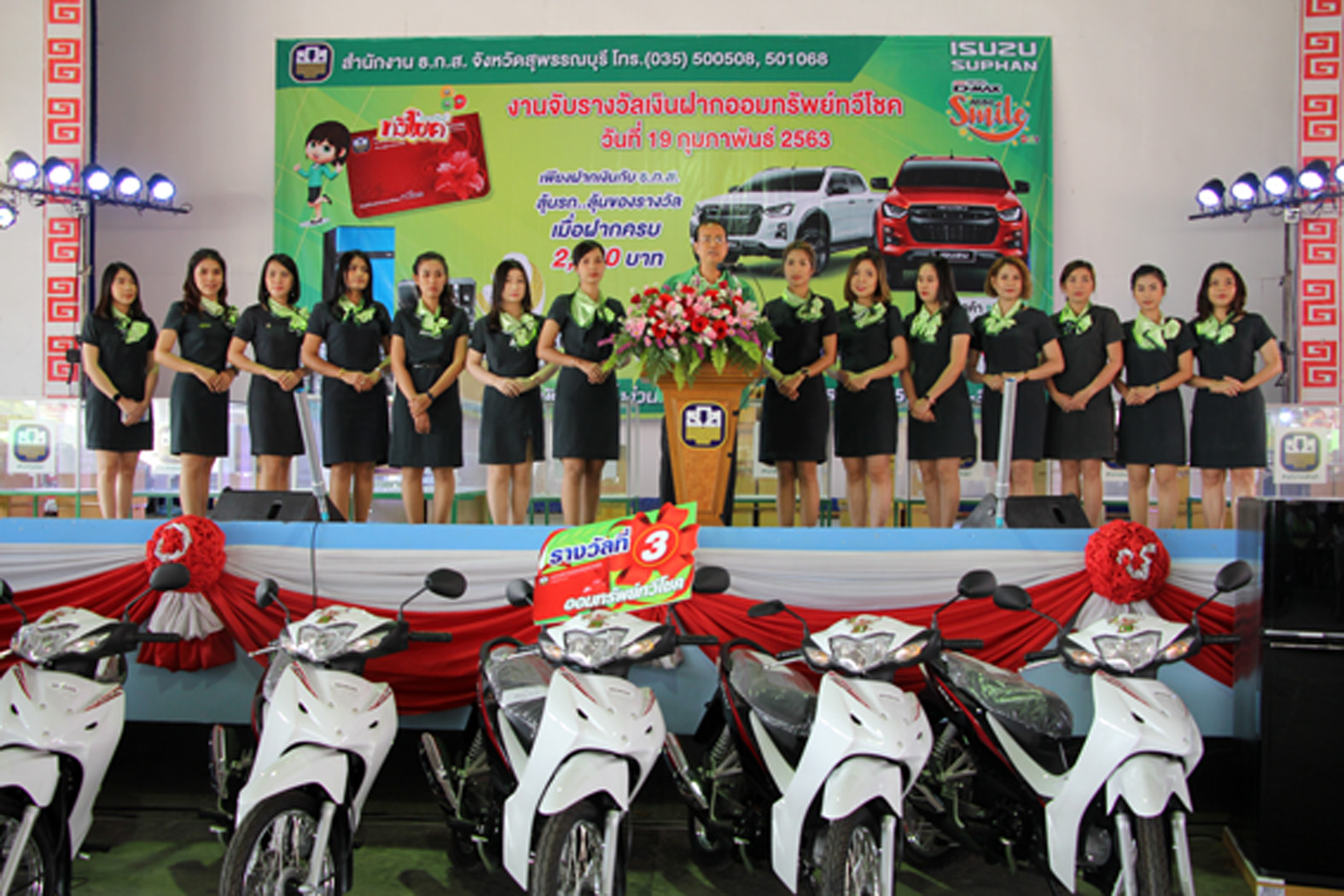 โดยสำนักงานธนาคารเพื่อการเกษตรและสหกรณ์การเกษตร (ธ.ก.ส.) จังหวัดสุพรรณบุรี เป็นธนาคารของรัฐบาลได้จัดงานจับรางวัลเงินฝากออมทรัพย์ทวีโชคมอบรางวัลให้กับลูกค้า ธ.ก.ส.ผู้ฝากเงินบัญชีออมทรัพย์ทวีโชคทุกอำเภอใน จ.สุพรรณบุรี จำนวน 14 สาขา ประกอบด้วย รางวัลที่ 1 รถยนต์ 7 ที่นั่ง 1 คัน รางวัลที่ 2 รถยนต์กระบะ CAB จำนวน 3 รางวัล รางวัลที่ 3 รถจักรยานยนต์ 13 คัน รางวัลที่ 4 ทองคำหนัก 2 สลึง 125 รางวัล รางวัลที่ 5 ตู้เย็น 351 รางวัล และรางวัลที่ 6 ไมโครเวฟ 530 รางวัล รวมรางวัล จำนวน 1,023 รางวัล มูลค่า 8,402,545 บาท (แปดล้านสี่แสนสองพันห้าร้อยสี่สิบห้าบาทถ้วน)