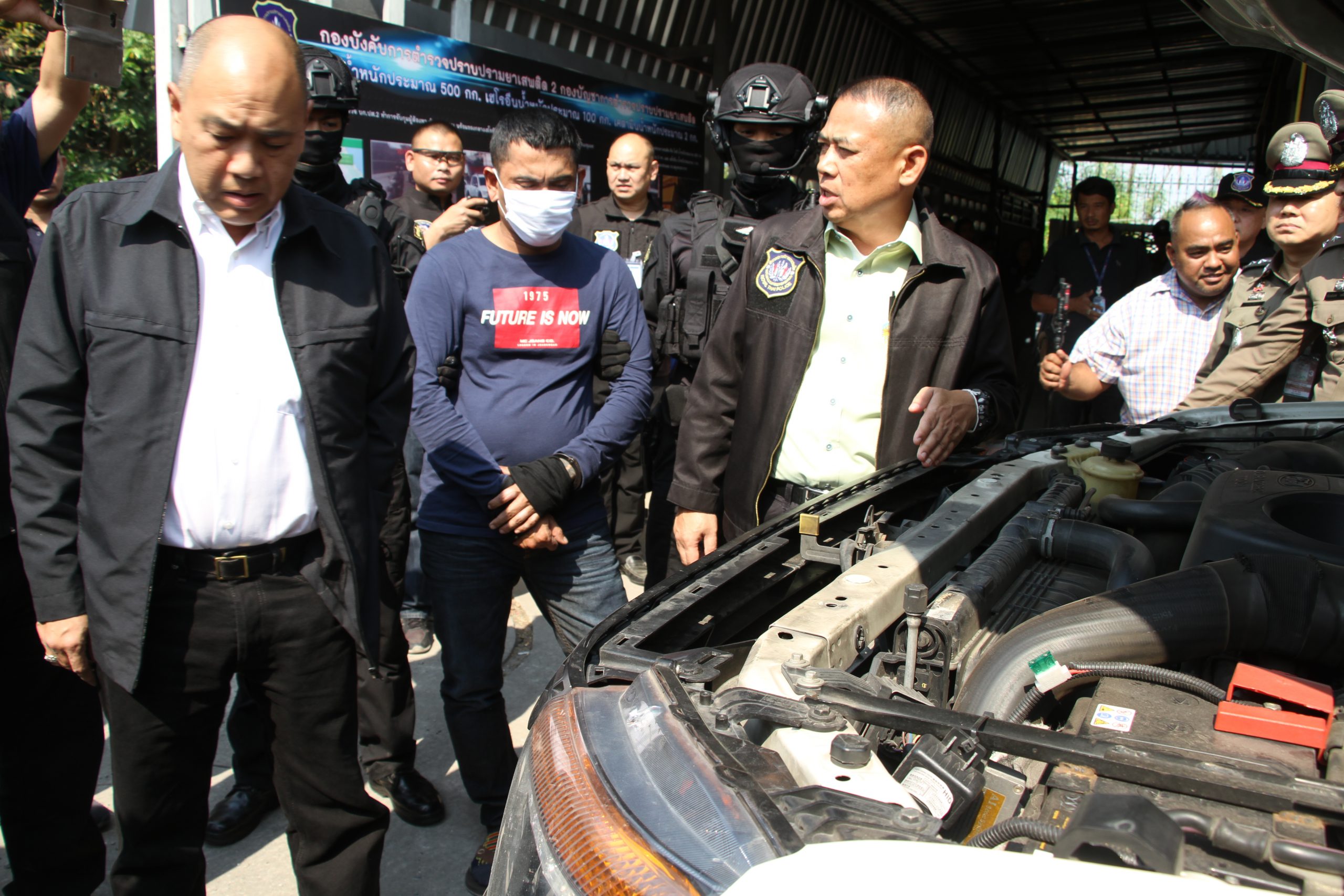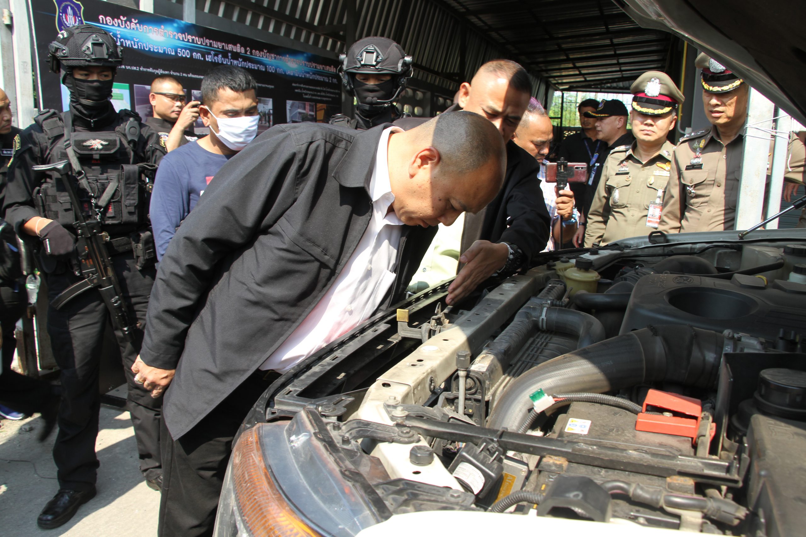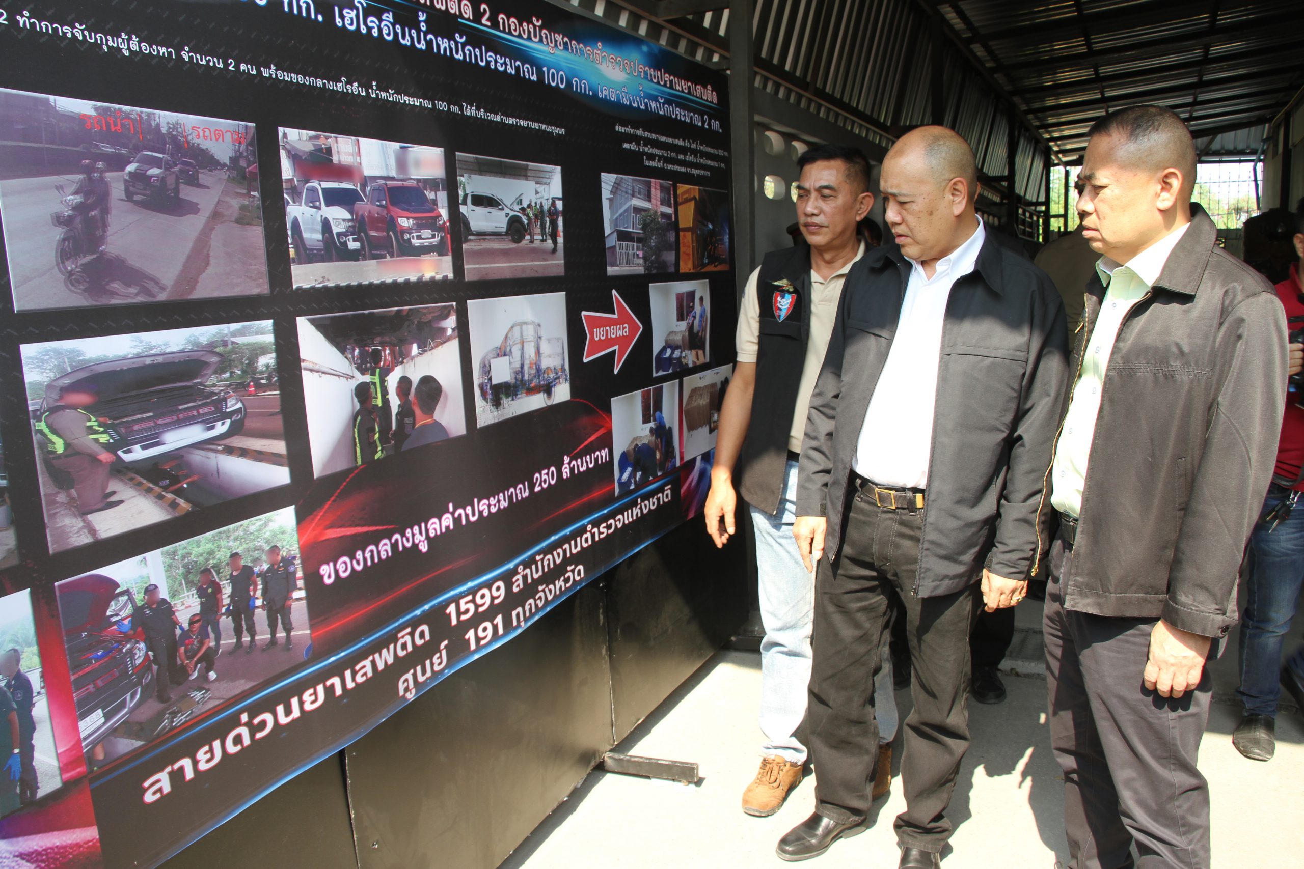 *****ต่อมาเมื่อวันที่ 22 ก.พ. 2563 ชุดจับกุมพบว่ารถยนต์ผู้ต้องหาเดินทางออกจากตึกแถวดังกล่าวทิศทางมุ่งหน้าสู่ภาคใต้เชื่อว่าน่าจะเป็นการลักลอบลำเลียงยาเสพติดไปส่งมอบให้ผู้รับในพื้นที่ชายแดนภาคใต้จึงได้ประสานกับเจ้าหน้าที่ตำรว จปส.4 ด่านตรวจยานพาหนะชุมพร ทำการร่วมสกัดจับเพื่อตรวจค้นรถยนต์ทั้งสองคันผลการตรวจค้นพบยาเสพติดเป็นเฮโรอีนจำนวนประมาณ 200 แท่ง รวมน้ำหนักประมาณ 100 กก. ซุกซ่อนอยู่ในรถเป้าหมายทั้งสองคันซึ่งมีการดัดแปลงตัวรถเป็นกล่องลับ (เซฟ) อย่างดีไว้ที่หน้ากระจังหน้ารถยนต์ จึงได้ทำการจับกุมผู้ต้องหาพร้อมของกลางเพื่อดำเนินคดีต่อมาได้นำผู้ต้องหามาขยายผลตรวจค้นห้องพักต้องสงสัยที่เจ้าหน้าที่ตำรวจชุดจับกุมสืบสวนติดตามมาในเขตพื้นที่ ม.9 ต. บางหัวเสือ อ. พระประแดง จ. สมุทรปราการ ตรวจค้นภายในตึกแถว ชั้น 2 ภายในห้อง พบยาเสพติดเป็นไอซ์น้ำหนักประมาณ 500 กก. เฮโรอีน 1 กก. และเคตามีนน้ำหนักประมาณ 2 กก. จึงได้ตรวจยึดไว้เป็นของกลาง