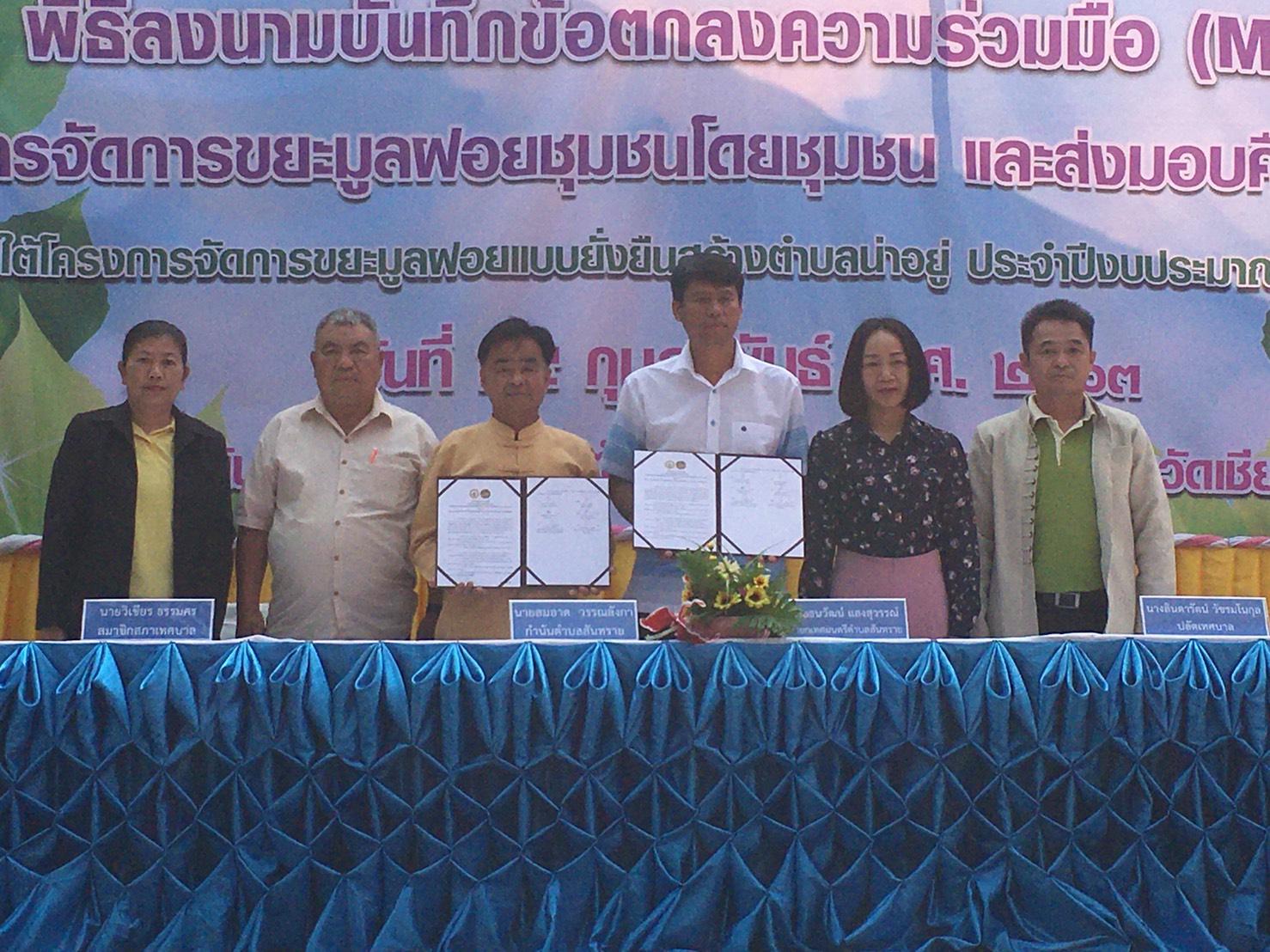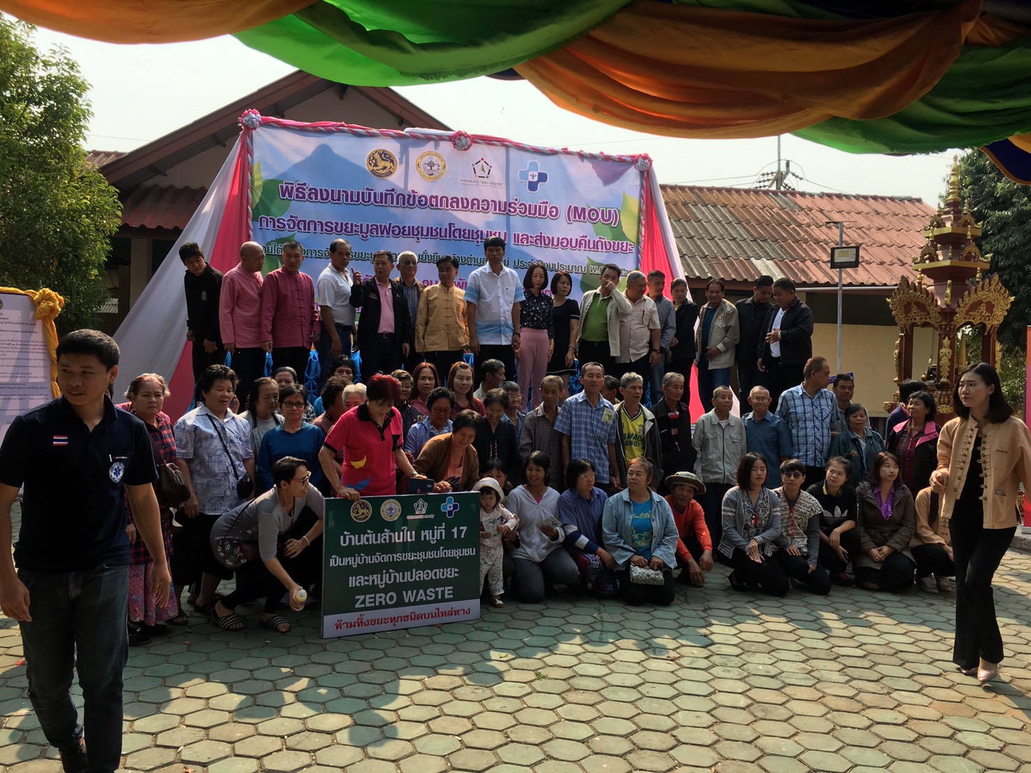 ที่วัดต้นส้านใน บ้านต้นส้าน หมุ่ที่ 17ตำบลสันทราย อำเภอฝาง จังหวัดเชียงใหม่ ได้มีการลงนามตกลงร่วมมือแก้ปัญหากำจัดขยะชุมชน โดยชุมชนใน ”โครงการกำจัดขยะมูลฝอยแบบยั่งยืน สร้างตำบลน่าอยู่” โดยทางเทศบาลตำบลสันทราย อำเภอฝาง ร่วมกับบ้านต้นส้าน หมุ่ที่ 17ตำบลสันทราย อำเภอฝาง จังหวัดเชียงใหม่ มีวัตถุประสงค์เพื่อให้เกิดความร่วมมือของชุมชน องค์กร ประชาชน เยาวชน ดำเนินการกำจัดขยะมูลฝอยชุมชนโดยชุมชน ในพื้นที่ให้เป็นหมู่บ้านปลอดขยะอย่างเป็นรูปธรรมโดยมีการลงนามระหว่าง นายธนวัฒน์ แสงสุวรรณ์ นายกเทศมนตรีตำบลสันทราย นางลินดา วัชรมโนกุล ปลัดเทศบาลตำบลสันทราย นายภาณุพงศ์ บังคมเนตร รักษาการ ผู้อำนวยการกองสาธารณสุขและสิ่งแวดล้อม นายสมอาด วรรณลังกา กำนันตำบลสันทราย นายวิเชียร ธรรมศร สมาชิกเทศบาลเขต2 นางดวงนภา. ขจรโมทย์ ผอ รพ สตสองแคว ตำบลสันทรายทั้งหมดได้ลงนาม MOU และมีคณะกรรมการผู้บริหาร สมาชิกสภาตำบลสันทราย กำนัน ผู้ใหญ่บ้าน ผู้อำนวยการโรงเรียนในตำบลสันทราย และประชาชนในหมู่บ้านร่วมเป็นพยาน เพื่อเป็นแนวในการปฏิบัติการกำจัดขยะมูลฝอยร่วมกัน โดยความร่วมมือกันทุกฝ่าย เพื่อต้องการให้ชุมชนในตำบลสันทรายเป็นตำบลน่าอยู่ และได้ทำการมอบถุงดำให้กับหมู่บ้านห้วยงูกลาง คืนถังขยะให้กับเทศบาลตำบลสันทราย