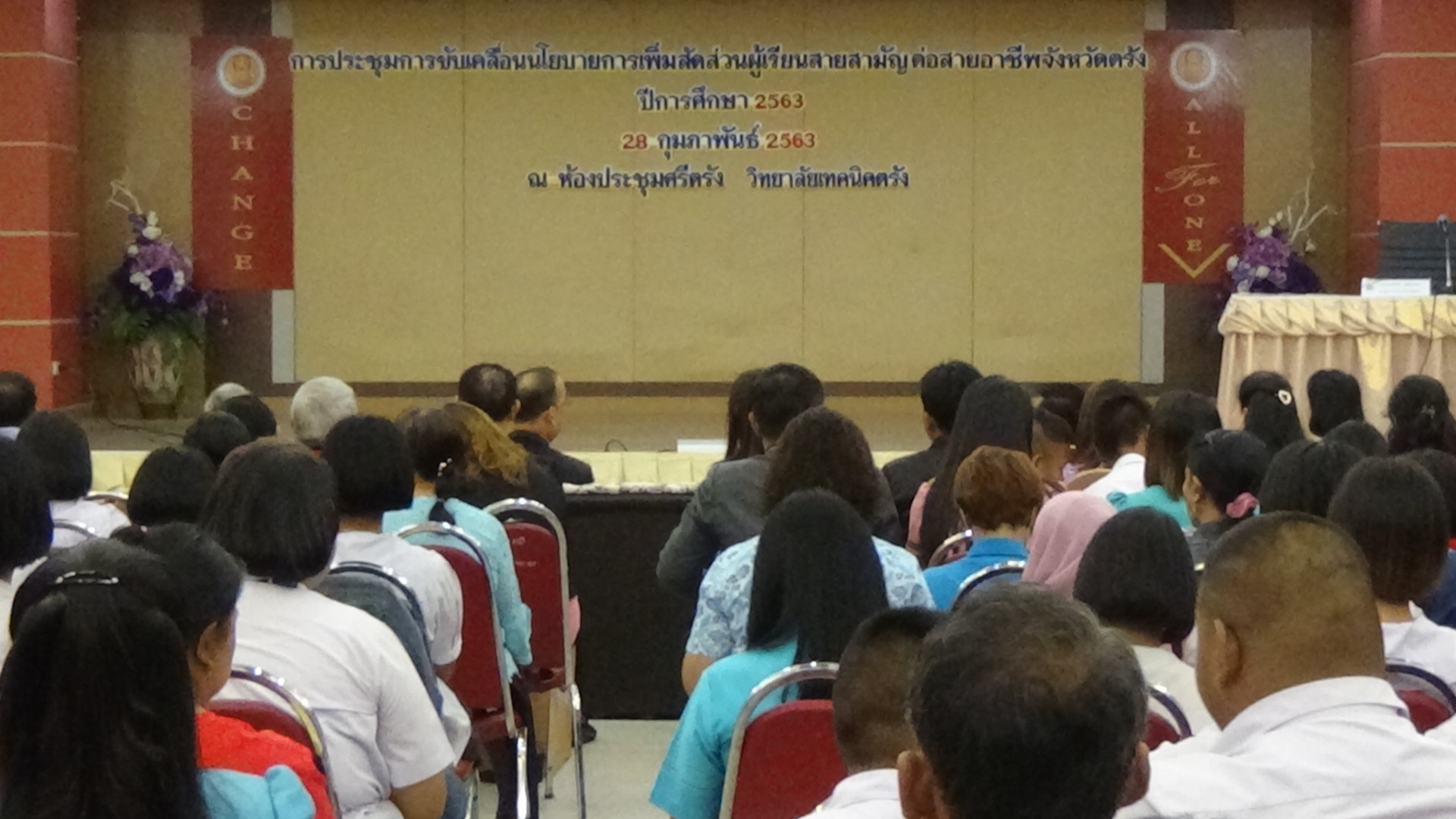 ทั้งนี้ การเข้าเรียนต่อสายอาชีพ มีหลักการสำคัญ คือ เกิดจากความประสงค์และความต้องการของผู้เรียนและผู้ปกครอง ซึ่งในส่วนนี้ สำนักงานศึกษาธิการจังหวัดตรัง ได้จัดประชุมหน่วยงานการศึกษาระดับขั้นพื้นฐานในจังหวัดตรังทุกสังกัด ร่วมกับวิทยาลัย 9 แห่ง ในจังหวัดตรัง เมื่อวันที่ 7 กุมภาพันธ์ 2563 ณ ห้องประชุมศึกษาธิการจังหวัดตรัง จากการประชุมดังกล่าวจึงได้มีมติให้จัดกิจกรรมการลงนามข้อตกลงความร่วมมือการเพิ่มสัดส่วนผู้เรียนสายอาชีพในพื้นที่จังหวัดตรัง และกิจกรรมการเสวนาการแนะแนวเพื่อเรียนต่อสายอาชีพ ขึ้น โดยมีวัตถุประสงค์เพื่อร่วมกันส่งเสริมและสนับสนุนผู้เรียนที่มีความถนัดและความสนใจ ที่ต้องการเรียนต่อสายอาชีพได้มีแนวทางในการเลือกศึกษาต่อในสายอาชีพ และเป็นการสร้างทัศนคติที่ดีต่อการเรียนสายอาชีพ ให้นักเรียนและผู้ปกครอง มีภาพลักษณ์ที่ดี มีความภาคภูมิใจในการเรียนสายอาชีพ และมีหลักประกันในอาชีพต่อไป โดยในวันนี้มีผู้เข้าร่วมกิจกรรมจำนวน 400 คน