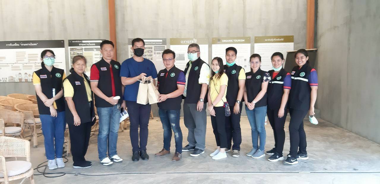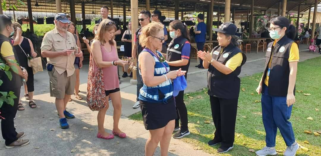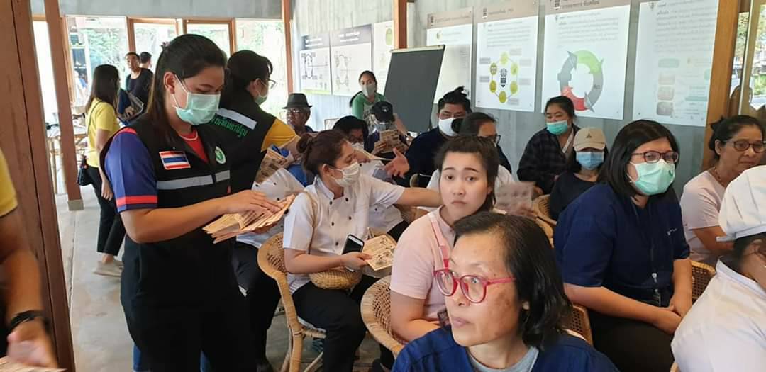 และประชาสัมพันธ์แนะนำวิธีจัดเก็บและกำจัดหน้ากากอนามัยที่ใช้แล้วอย่างถูกวิธี 4 ขั้นตอน ประกอบด้วย 1) แยกทิ้งหน้ากากอนามัยออกจากขยะมูลฝอยประเภทอื่น 2) พับหน้ากากอนามัยส่วนที่สัมผัสกับใบหน้าเข้าด้านใน เพื่อป้องกันสารคัดหลั่งจากน้ำมูก หรือน้ำลายแพร่กระจาย 3) ม้วนหน้ากากอนามัยใช้แล้วใส่ถุงที่ปิดสนิทก่อนทิ้งหรือทิ้งในถังขยะที่มีฝาปิด และ 4) ล้างมือทุกครั้งด้วยน้ำสบู่หรือเจลล้างมือหลังทิ้งหน้ากากอนามัย สำหรับประชาชนทั่วไปและไม่มีอาการป่วยหรือกลุ่มเสี่ยงในการติดเชื้อโรค สามารถใช้หน้ากากอนามัยแบบผ้าได้ และควรมีสำรองอย่างน้อย 2 ผืน เมื่อใช้แล้วต้องซักทำความสะอาด ตากแดดให้แห้งเพื่อฆ่าเชื้อทุกครั้ง ซึ่งมี ผู้บริหารสวนสามพราน,คณะกรรมการตลาดสุขใจ,ผู้ประกอบการ และตัวแทนผู้บริโภค นักท่องเที่ยว เข้าร่วมกิจกรรม
