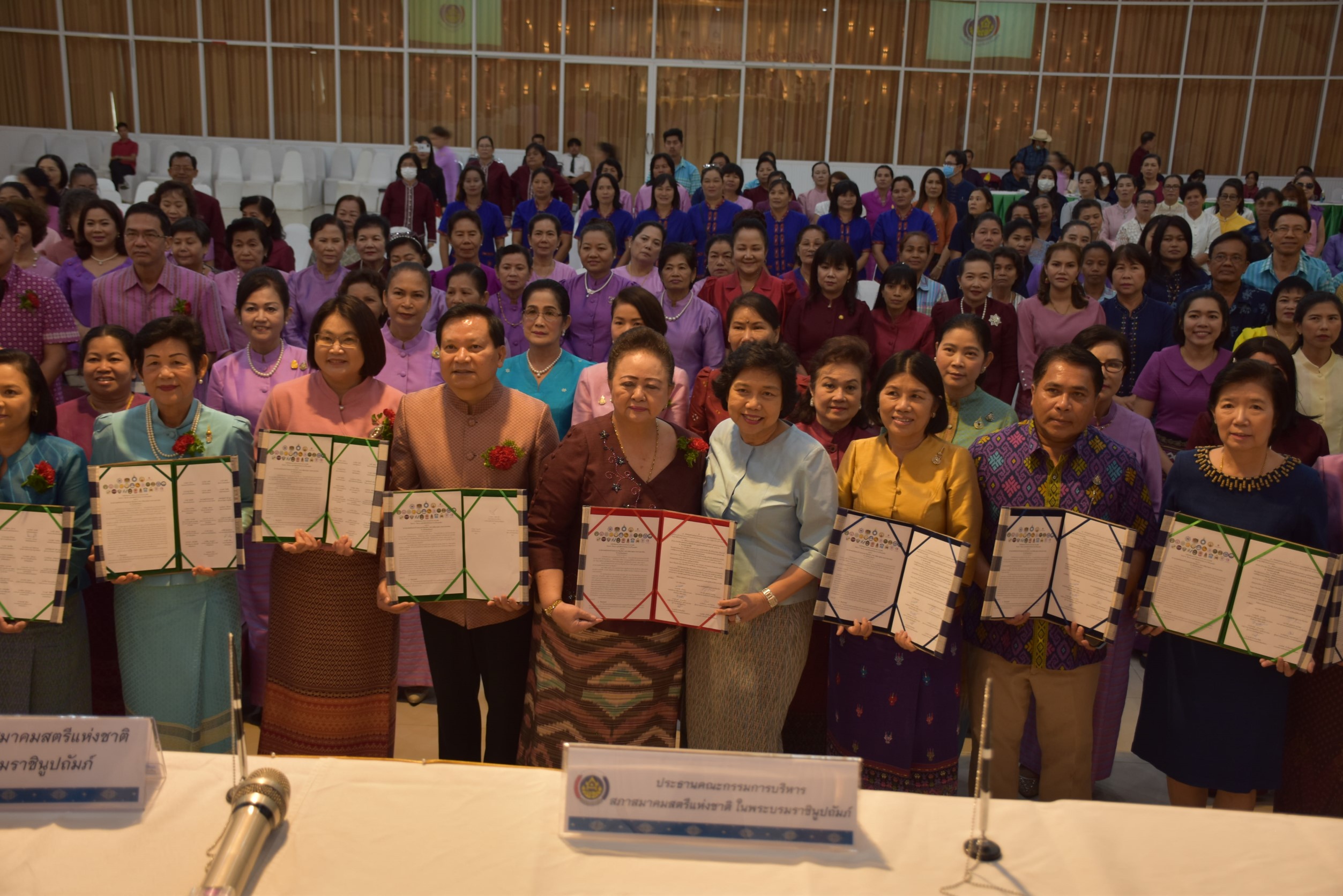 ขอแนะนำ สภาสมาคมสตรีแห่งชาติในพระบรมราชินูปถัมภ์ ก่อตั้งมาตั้งแต่ ปี พ.ศ. 2499 โดยท่านผู้หญิงละเอียด พิบูลสงคราม ภริยาของ ท่านจอมพล ป. พิบูลสงคราม นายกรัฐมนตรีในขณะนั้น มีประธาน ที่ดำรงตำแหน่งมาแล้ว จำวน 23 คน 26 สมัย โดยข้าพเจ้าได้เป็นประธาน มา 2 สมัย มีองค์กรสมาชิก มากกว่า 200 องค์กร มีการจัดตั้งสมาคมส่งเสริมวัฒนธรรมหญิง ในทุกจังหวัด เพื่อเพิ่มบทบาทของสตรี ในปัจจุบัน สตรีมีบทบาท และมีการศึกษาเพิ่มมากขึ้น และมีตำแหน่งสำคัญในสังคม ควบคู่กับบทบาทของผู้หญิง จากนี้ เป็นต้นไปขอให้รณรงค์การใส่ผ้าไทยในทุกวัน ไม่ว่าจะเป็นผ้าถูก แพง และ สภาสมาคมสตรีแห่งชาติในพระบรมราชินูปถัมภ์ ร่วมกับกรมการพัฒนาชุมชน จัดประกวดผ้า อัตลักษณ์ ขอจังหวัดฉะเชิงเทราได้พัฒนาต่อยอดการทอผ้า ดังเช่น จังหวัดพิจิตร ที่ได้สร้างลวดลายผ้า และขอให้ทุกท่านได้ร่วมกันสวมใส่ผ้าไทยตาม โครงการ สืบสาน อนุรักษ์ศิลป์ผ้าถิ่นไทย ดำรงไว้ในแผ่นดิน