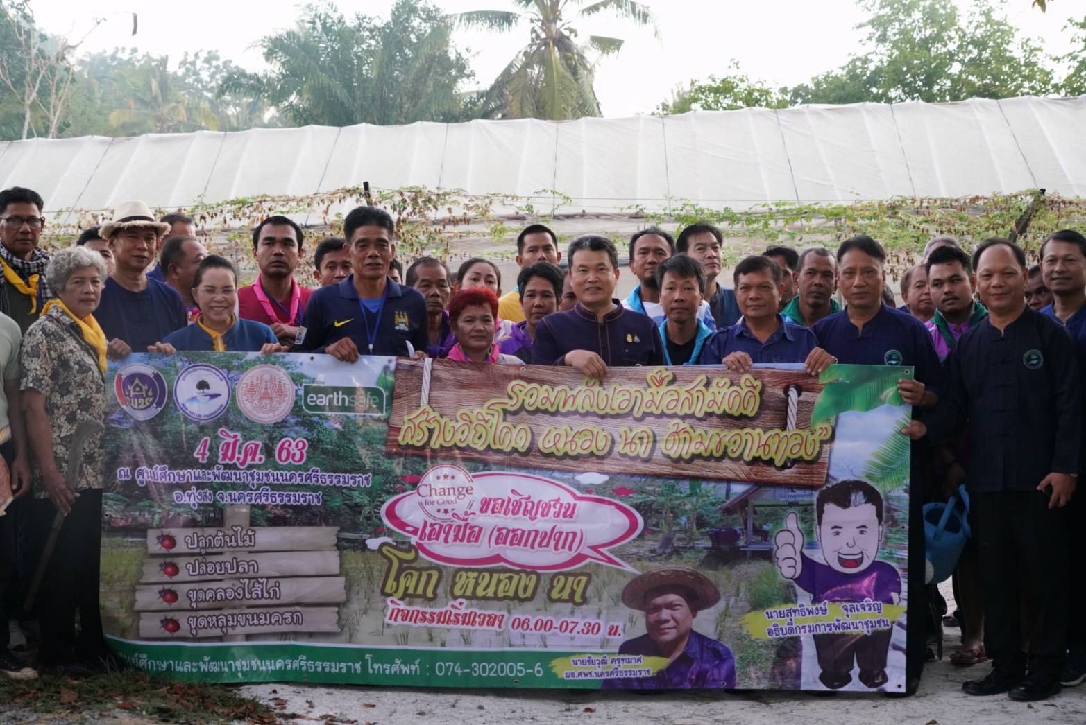วันที่ 4 มีนาคม 2563 นายสุทธิพงษ์ จุลเจริญ อธิบดีกรมการพัฒนาชุมชน นำคณะผู้บริหาร ข้าราชการกรมการพัฒนาชุมชน ผู้นำชุมชน ตลอดจนผู้แทนภาคส่วนต่าง ๆ รวมพลังเอามื้อสามัคคี สร้างวิถีโคก หนอง นา ด้ามขวานทอง ภายใต้แนวคิด “หิ้วปิ่นโต ไปเอามื้อ ถือจอบเสียม พลิกฟื้นแผ่นดิน” ณ ศูนย์ศึกษาและพัฒนาชุมชนนครศรีธรรมราช