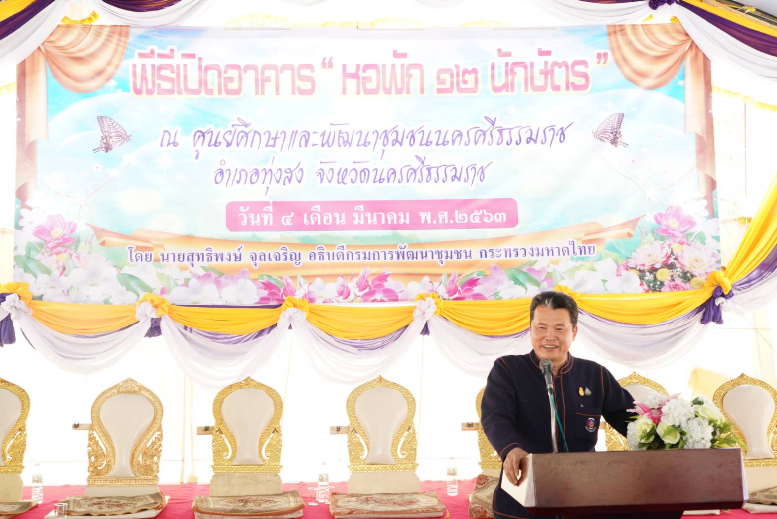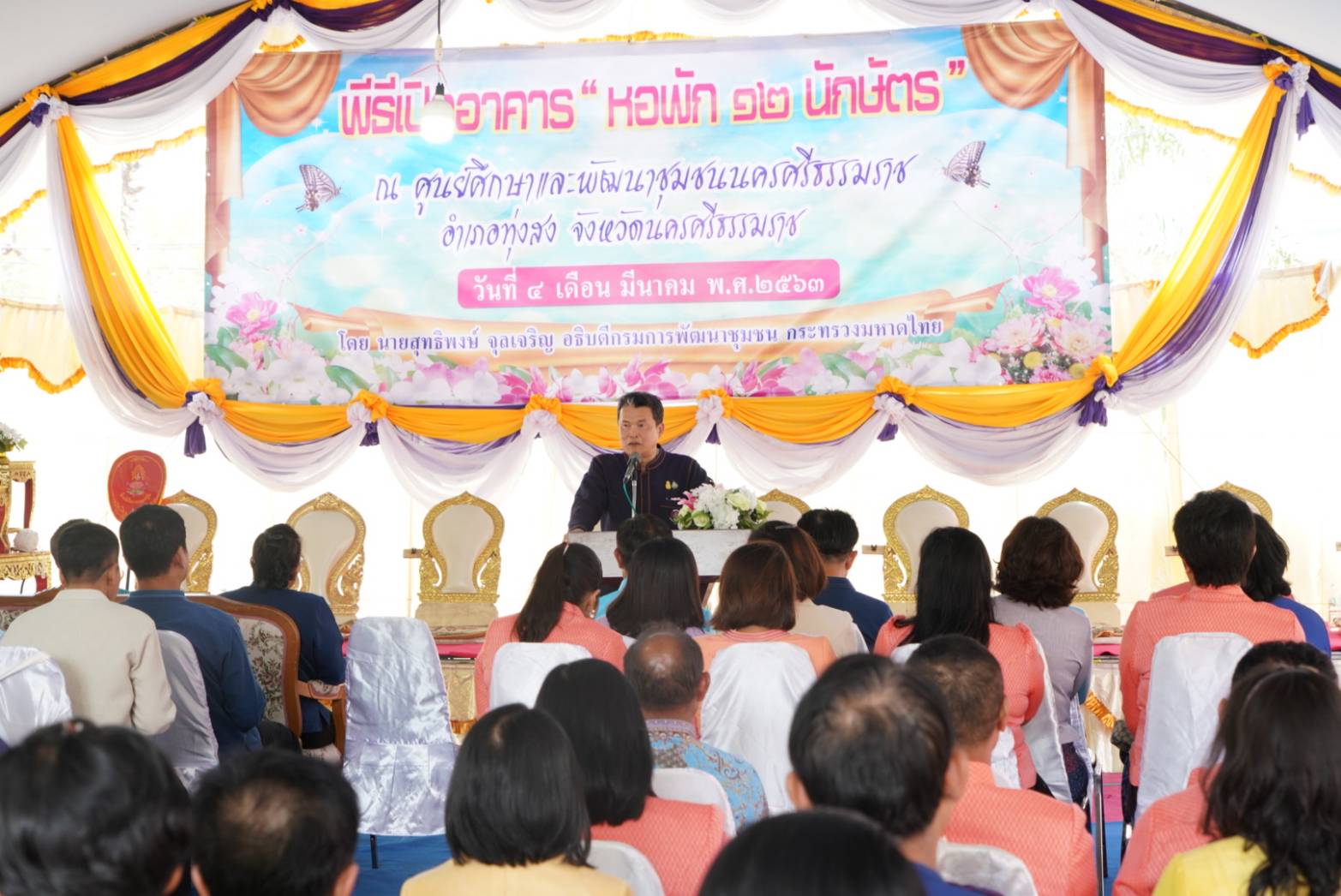 นายสุทธิพงษ์ จุลเจริญ อธิบดีกรมการพัฒนาชุมชน เป็นประธานในพิธีเปิดอาคารหอพัก 12 นักษัตร ศูนย์ศึกษาและพัฒนาชุมชนนครศรีธรรมราช ตำบลหนองหงส์อำเภอทุ่งสง จังหวัดนครศรีธรรมราช โดยมีนายสมพงษ์ มากมณี รองผู้ว่าราชการจังหวัดนครศรีธรรมราช นายร่องกี้ พลเยี่ยม ผู้อำนวยการสถาบันการพัฒนาชุมชน คณะผู้บริหาร พช. ในพื้นที่ใกล้เคียง ให้การต้อนรับ อาคารหอพัก 12 นักษัตร ศูนย์ศึกษาและพัฒนาชุมชนนครศรีธรรมราช เป็นอาคาร 2 ชั้น ขนาด 12 ห้องพัก กรมการพัฒนาชุมชน ได้อนุมัติงบลงทุนเพื่อการก่อสร้าง เพื่อให้ศูนย์ศึกษาและพัฒนาชุมชนนครศรีธรรมราช มีความพร้อมในการรองรับด้านที่พักแก่ผู้มาใช้บริการการฝึกอบรม ประชุม สัมมนาสำหรับข้าราชการ พนักงานของรัฐผู้นำองค์กร ภาคประชาชน และภาคีเครือข่ายการพัฒนาในพื้นที่ 7 จังหวัดภาคใต้ตอนบนประกอบด้วย จังหวัดชุมพร ระนอง สุราษฎร์ธานี นครศรีธรรมราช กระบี่ พังงาและจังหวัดภูเก็ต และพื้นที่ใกล้เคียง