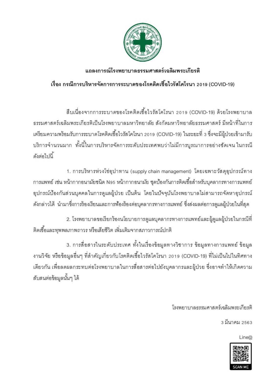 ระบุ สืบเนื่องจากการระบาดของโรคติดเชื้อไวรัสโคโรน่า 2019 (COVID-19) ด้วยโรงพยาบาลธรรมศาสตร์เฉลิมพระเกียรติเป็นโรงพยาบาลมหาวิทยาลัย สังกัดมหาวิทยาลัยธรรมศาสตร์ มีหน้าที่ในการเตรียมความพร้อมรับการระบาดโรคติดเชื้อไวรัสโคโรน่า 2019 (COVID-19) ในระยะที่ 3 ซึ่งจะมีผู้ป่วยเข้ามารับบริการจำนวนมาก ทั้งนี้ในการบริหารจัดการระดับประเทศพบว่าไม่มีการบูรณาการอย่างชัดเจน ในกรณีดังต่อไปนี้1. การบริหารห่วงโซ่อุปทาน (supply chain management) โดยเฉพาะวัสดุอุปกรณ์ทางการแพทย์ เช่น หน้ากากอนามัยชนิด N95 หน้ากากอนามัย ชุดป้องกันการติดเชื้อสำหรับบุคลากรทางการแพทย์ อุปกรณ์ป้องกันส่วนบุคคลในการดูแลผู้ป่วย เป็นต้น โดยในปัจจุบันโรงพยาบาลไม่สามารถจัดหาอุปกรณ์ดังกล่าวได้ นำมาซึ่งการร้องเรียนและการฟ้องร้องต่อบุคลากรทางการแพทย์ ซึ่งส่งผลต่อการดูแลผู้ป่วยในที่สุด2. โรงพยาบาลขอเรียกร้องนโยบายการดูแลบุคลากรทางการแพทย์และผู้ดูแลผู้ป่วยในกรณีที่ติดเชื้อและทุพพลภาพถาวร หรือเสียชีวิต เพิ่มเติมจากสภาวการณ์ปกติ
