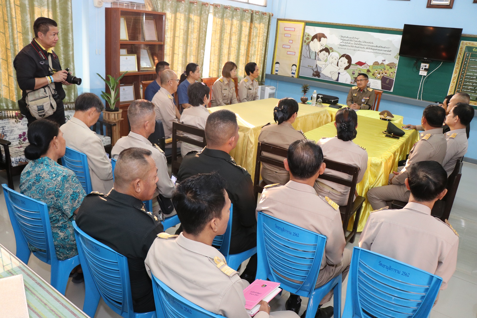 ที่ห้องประชุมโรงเรียนหนองปรือพิทยาคม อำเภอหนองปรือ จังหวัดกาญจนบุรี พลเอกไพบูลย์ คุ้มฉายา องคมนตรี เป็นประธานการประชุมติดตามการดำเนินงานโครงการโรงเรียนกองทุนการศึกษาในจังหวัดกาญจนบุรี โดยมี นายจีระเกียรติ ภูมิสวัสดิ์ ผู้ว่าราชการจังหวัดกาญจนบุรี นายอนันต์ กัลปะ ศึกษาธิการจังหวัดกาญจนบุรี นายวิบูลย์ ชัยประเสริฐ นายอำเภอหนองปรือ ผู้อำนวยการโรงเรียนในพื้นที่อำเภอหนองปรือ ผู้นำท้องถิ่น และเครือข่ายผู้ปกครอง ให้การต้อนรับพร้อมรายงานข้อมูลในการดำเนินการตามกระบวนการของโครงการฯในพื้นที่ทั้งนี้ได้ติดตามรับฟังปัญหาและการแก้ไขในเบื้องต้นของโรงเรียนหนองปรือพิทยาคม โดย นายสรศักดิ์ ไสยะหุต เป็นผู้อำนวยการโรงเรียนหนองปรือพิทยาคม ได้รายงานถึงการติดตามและเยี่ยมเยียนนักเรียนทุนพระราชทานและครอบครัว และการแก้ไขปัญหาเรื่องโครงการอาหารกลางวันโดยได้ขอรับการสนับสนุนงบประมาณจากจังหวัดกาญจนบุรี สำหรับโรงเรียนหนองปรือพิทยาคม เปิดการเรียนการสอนในระดับมัธยมศึกษาชั้นปีที่ 1 ถึงชั้นปีที่ 6 มีนักเรียนจำนวน 238 คน เป็นชาย 105 คน หญิง 133 คน นายสรศักดิ์ ไสยะหุต เป็นผู้อำนวยการโรงเรียนหนองปรือพิทยาคม มีนักเรียนทุนพระราชทานของมูลนิธิทุนการศึกษาพระราชทานสมเด็จพระบรมโอรสาธิราชฯ สยามมกุฎราชกุมาร (ม.ท.ศ.) จำนวน 1 ราย และทุนการศึกษาพระราชทานในพระบาทสมเด็จพระปรมินทรมหาภูมิพลอดุลยเดช (ในหลวงรัชกาลที่ 9) จำนวน 3 ราย