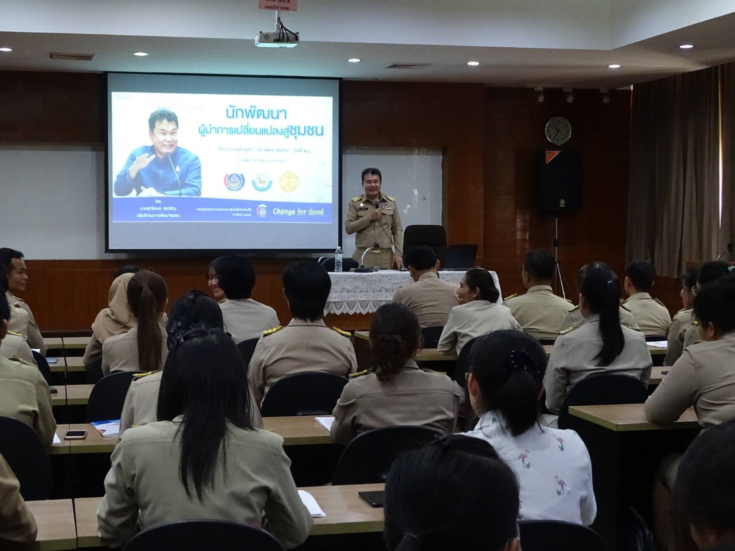 นายสุทธิพงษ์ จุลเจริญ อธิบดีกรมการพัฒนาชุมชน บรรยายพิเศษ หัวข้อ “นักพัฒนาผู้นำการเปลี่ยนแปลงสู่ชุมชน” ตามโครงการฝึกอบรมหลักสูตรนักพัฒนาชุมชน รุ่นที่ 28 โดยความร่วมมือระหว่าง 3 หน่วยงาน ได้แก่ กรมการพัฒนาชุมชน กรมส่งเสริมการปกครองท้องถิ่น และมหาวิทยาลัยธรรมศาสตร์ กลุ่มเป้าหมาย ตำแหน่ง นักวิชาการพัฒนาชุมชนระดับปฏิบัติการและชำนาญการจากทั่วประเทศการ จำนวน 72 คน วัตถุประสงค์เพื่อเพิ่มทักษะและเสริมขีดสมรรถนะความสามารถให้เป็นนักพัฒนาแบบมืออาชีพ