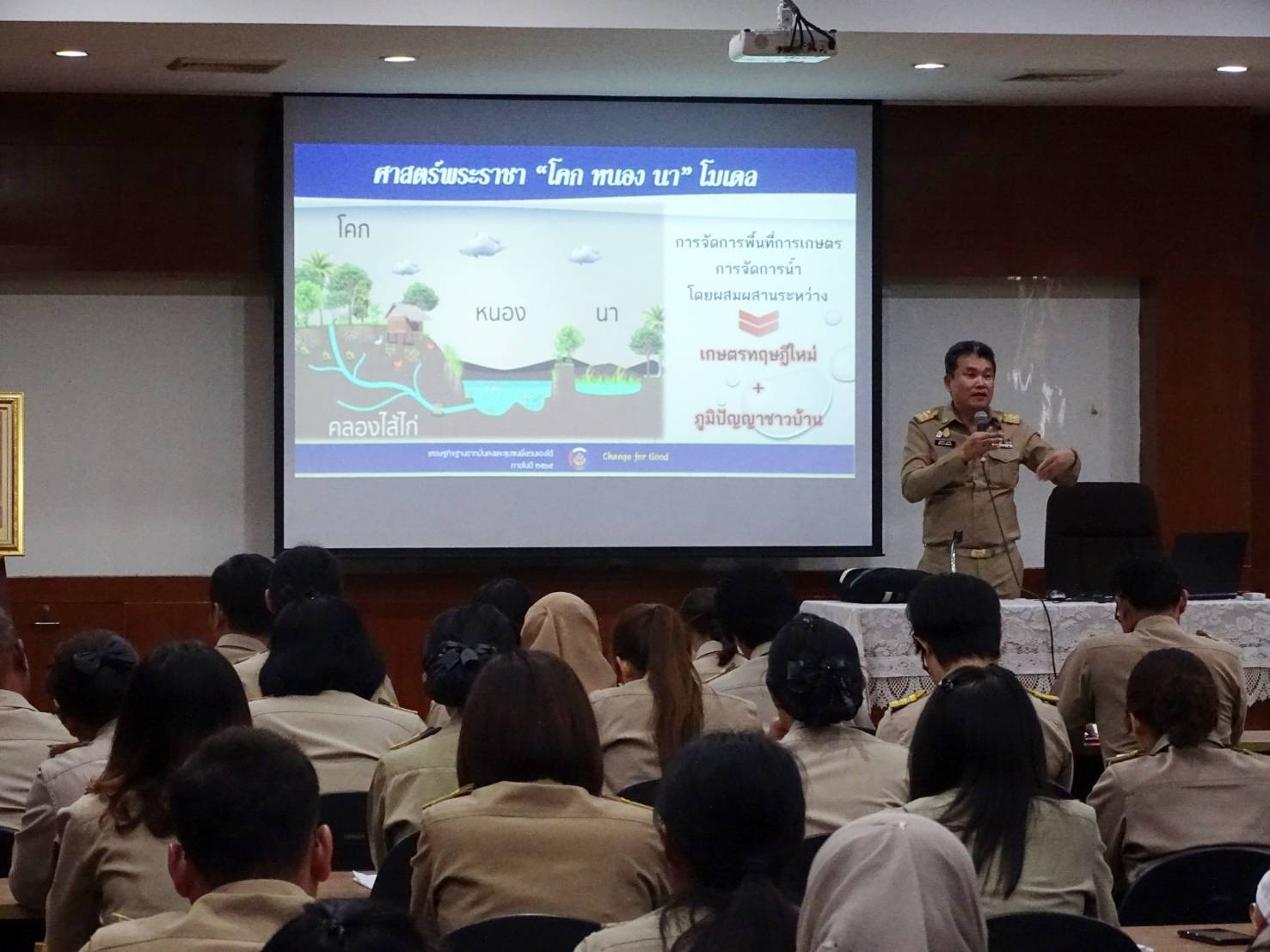 ส่วนในระดับอาชีพกรมการพัฒนาชุมชนอยากชวนพี่ ๆ น้องๆ ทุก อปท. ทั้ง 7,852 แห่ง ทั่วประเทศ รณรงค์ให้คนไทยกลับมาหวนคำนึงนึกถึงพระมหากรุณาธิคุณของล้นเกล้าฯ รัชกาลที่ 9 ที่พระองค์ทรงมีต่อ พสกนิกรชาวไทย ในเรื่องของทฤษฎีใหม่ ในรูปแบบ โคก หนอง นา โมเดล กล่าวคือ แนวคิดทฤษฎีใหม่ของรัชกาลที่ 9 ทรงทดลองในพื้นที่ทุรกันดารอยู่ในป่าในเขา ที่วัดชัยพัฒนา อำเภอเฉลิมพระเกียรติ จังหวัดสระบุรี บริหารจัดการพื้นที่แบ่งเป็น 30% สำหรับทำนา 30% สำหรับทำแหล่งน้ำ 30% สำหรับทำการเกษตร อื่น ๆ ปลูกไม้ผล ไม้ยืนต้นและ 10% สำหรับที่อยู่อาศัยและเลี้ยงสัตว์ ซึ่งต่อมา “อาจารย์ยักษ์” ดร.วิวัฒน์ ศัลยกำธร อดีต รมช.เกษตรฯ ได้นำเอาแนวคิดทฤษฎีใหม่ ของรัชกาลที่ ๙ มาประยุกต์ใช้ในการบริหารจัดการพื้นที่เรียกแบบชาวบ้านว่า “โคกหนองนา” เพราะมีขนำ มีต้นไม้ มีโคก มีหนองที่อยู่ของปลาสอดคล้องกับกับวิถีชีวิตของคนสมัยก่อน จึงขอให้พวกเราไปศึกษาดู เพราะจะเป็นวิธีการแก้วิกฤตการณ์ของโลกโดยเฉพาะอย่างยิ่งวิกฤตการณ์ด้านสิ่งแวดล้อมและเศรษฐกิจได้เป็นอย่างดี ต้นทุนการทำเขื่อนทำอ่างเก็บน้ำ กรมชลประทาน 1 ลูกบาศก์เมตรในราคา 40-60 ล้านบาท แต่ถ้าเราทำ โคก หนอง นา ทุกที่ในประเทศนี้ ทำเพียงคนละ 5 ไร่ 10 ไร่รวมแล้ว คำนวณทั่วประเทศใช้ต้นทุน 6 บาทต่อ 1 ลูกบาศก์เมตร นอกจากนั้น โคก หนอง นา ยังสามารถแก้วิกฤตการณ์เรื่องน้ำด้วยการทำหลุมขนมครกและคลองไส้ไก่ ในเลือกสวนไร่นา ถ้าทุกคนมีหนองมีหลุมขนมครกและมีคลองไส้ไก่ในพื้นที่ของตนเอง ก็สามารถพึ่งพาตนเองได้ไม่ต้องพึ่งฝนหลวง ไม่ต้องพึ่งหน่วยงานรัฐ อย่างไรก็ตามระดับแรกต้องเริ่มจากครัวเรือนโดยการปลูกพืชผักสวนครัวก่อน ส่วนระดับอาชีพให้ทำโคก หนอง นา ซึ่งกรมการพัฒนาชุมชน ได้เชิญชวนตัวแทนหมู่ละ 1 ครอบครัวเข้าสมัคร อปท.จะเข้าร่วมได้อย่างไรท่านต้องศึกษาให้เข้าใจและขับเคลื่อนไปด้วย ถ้าพวกเราช่วยกันรณรงค์ ส่งเสริมให้เกิดความสำเร็จ ผู้คนจะมีความสุขประเทศชาติพ้นวิกฤต คนมีกินมีใช้ ไม่ต้องกลัวตกงาน แต่ถ้าเรานิ่งเฉยวิกฤตการณ์จะยิ่งเลวร้าย ผมจึงขอเชิญชวนให้พวกเราปรับทัศนคติ ตั้งเป้าหมายการทำงาน ประสานความร่วมมือกับทุกภาคส่วน และบูรณาการการทำงานร่วมกัน ขอเป็นกำลังใจให้ทุกคน ขอให้ไปช่วยกัน ให้คำนึงถึงพี่น้องประชาชนว่าเขาเหมือนญาติผู้ใหญ่ดูแลพูดคุยถามสารทุกข์สุกดิบ เพื่อให้เขาได้รับความชื่นใจเหมือนกับพระราชดำรัสพระบรมราโชวาท ของล้นเกล้ารัชกาลที่ 9 ที่พระราชทานให้กับข้าราชการพลเรือนว่า “ข้าราชการ คือ ผู้ที่ทำให้ประชาชนชื่