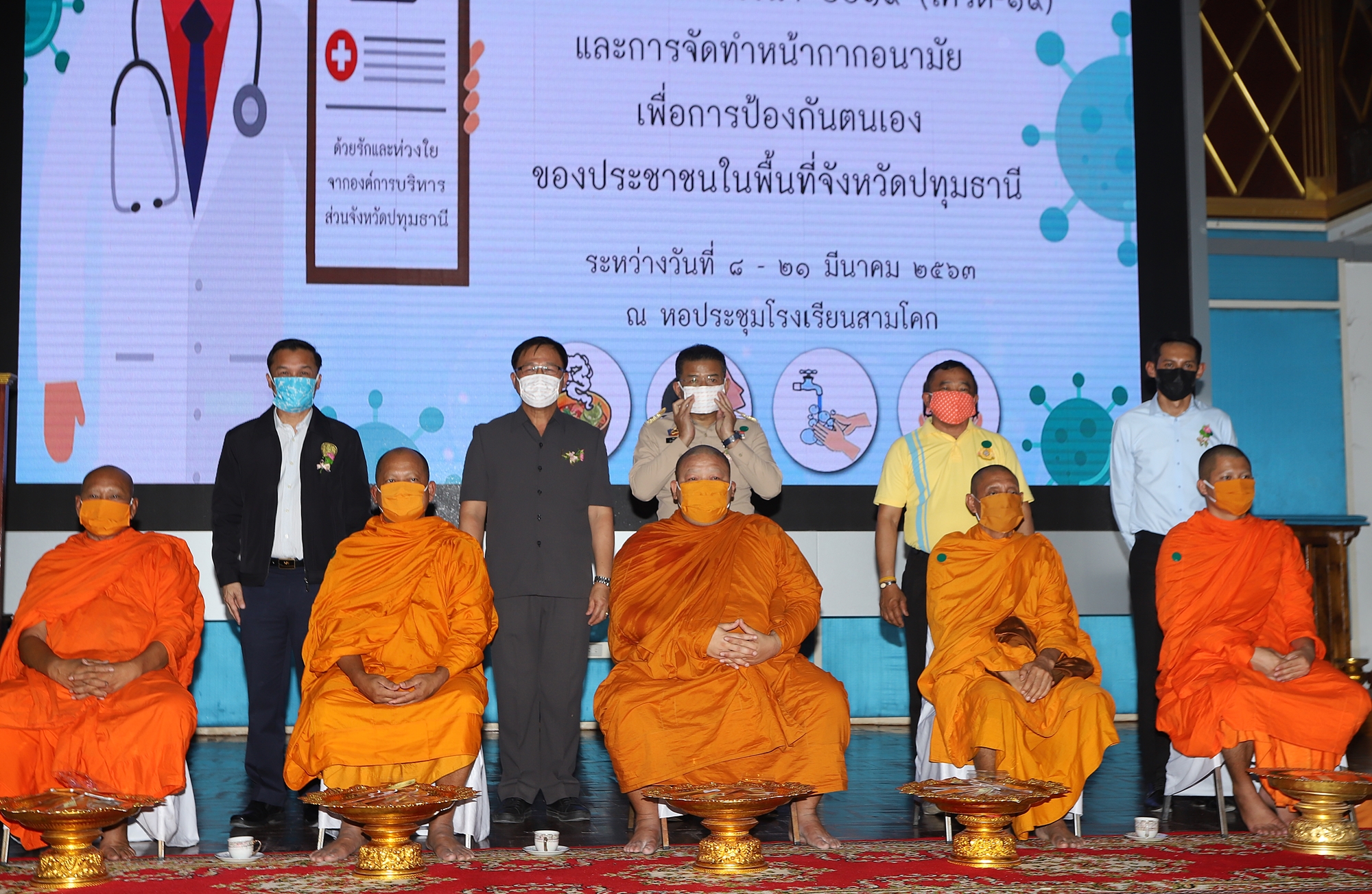 เมื่อเวลา 15.30 น. วันที่13 มีนาคม 2563 ณ หอประชุม โรงเรียนสามโคก จ.ปทุมธานี นายทรงศักดิ์ ทองศรี รัฐมนตรีช่วยว่าการกระทรวงมหาดไทย พร้อมด้วย นายประยูร รัตนเสนีย์ อธิบดีกรมส่งเสริมการปกครองท้องถิ่น ดร.พินิจ บุญเลิศ ผู้ว่าราชการจังหวัดปทุมธานี นายพิษณุ พลธี ส.ส.ปทุมธานี นายชาญ พวงเพ็ชร์ นายกองค์การบริหารส่วนจังหวัดปทุมธานี ว่าที่ ร.ต.ขรรค์ไชย ทันธิมา ท้องถิ่นจังหวัดปทุมธานี หัวหน้าส่วนราชการ เข้าตรวจเยี่ยมการดำเนินงาน โครงการพลังคนไทยร่วมใจป้องกันไวรัสโคโรนา (COVID-19) ในส่วนการดำเนินงานขององค์การบริหารส่วนจังหวัดปทุมธานี ซึ่งเป็นการขยายผลต่อจากโครงการอบรมเชิงปฏิบัติการให้ความรู้ในการป้องกันโรคติดเชื้อไวรัสโคโรนา 2019 (COVID-19) และการจัดทำหน้ากากอนามัยเพื่อการป้องกันตนเอง โดยให้ทีมวิทยากร ครู ก. ที่มีความรู้และทักษะในการจัดทำหน้ากากอนามัยร่วมมือกับกลุ่มจิตอาสาต่างๆ ในพื้นที่ ผลิตหน้ากากอนามัยชนิดผ้าส่งมอบให้แก่ประชาชนเป็นการเร่งด่วน เพื่อป้องกัน COVID-19ทั้งนี้ทุกคนที่จะเข้ามา ณ โรงเรียนสามโคก จ.ปทุมธานี จะต้องถูกคัดกรองด้วยการวัดอุณหภูมิร่างกายทุกคน โดยสำนักงานสาธารณสุขอำเภอสามโคก