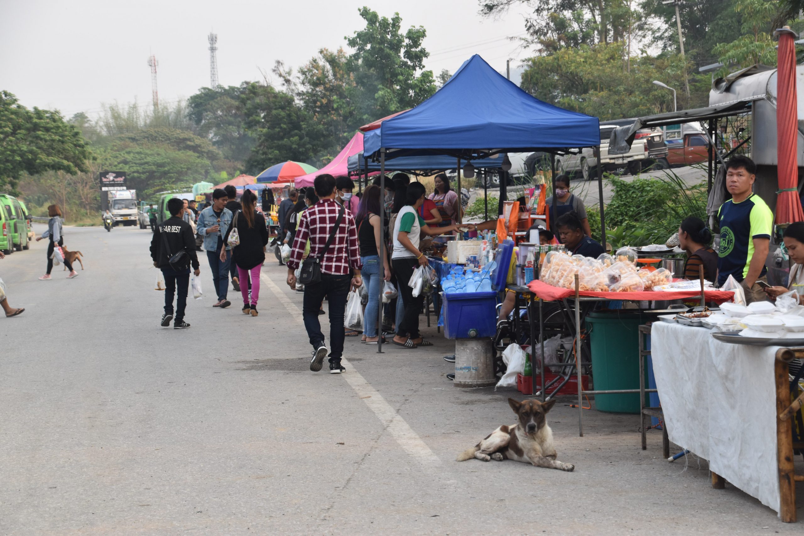 กาญจนบุรี บรรยากาศที่ด่านพุน้ำร้อน อำเภอเมืองกาญจนบุรีคึกคัก มีทั้งชายไทยและชาวต่างชาติเดินทางท่องเที่ยว ประเทศเมียนมาจำนวนมาก