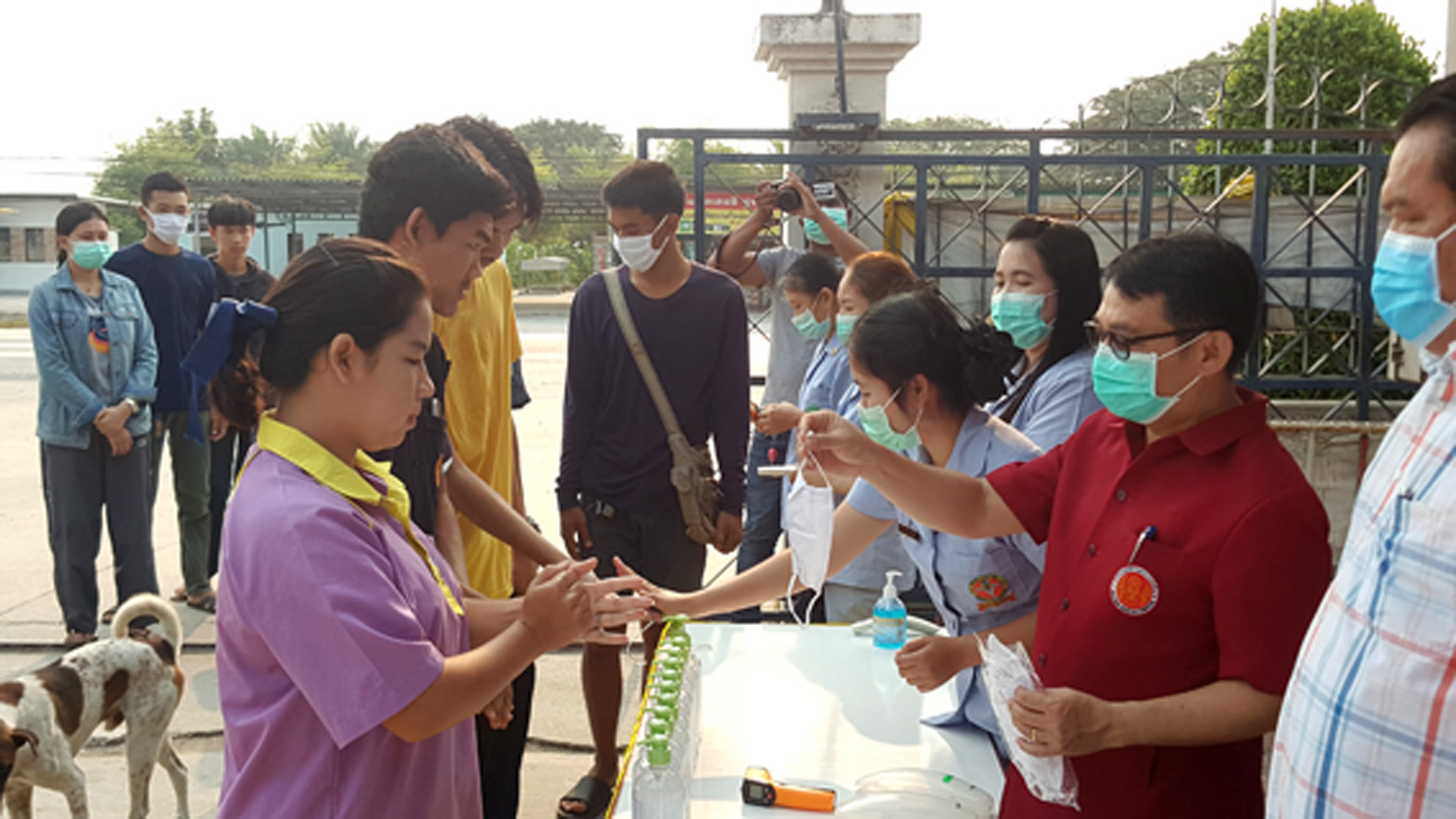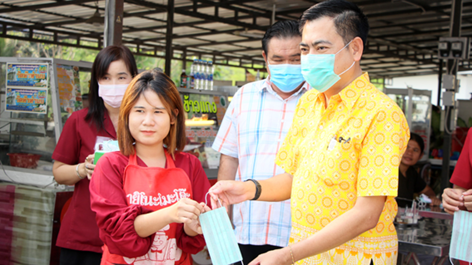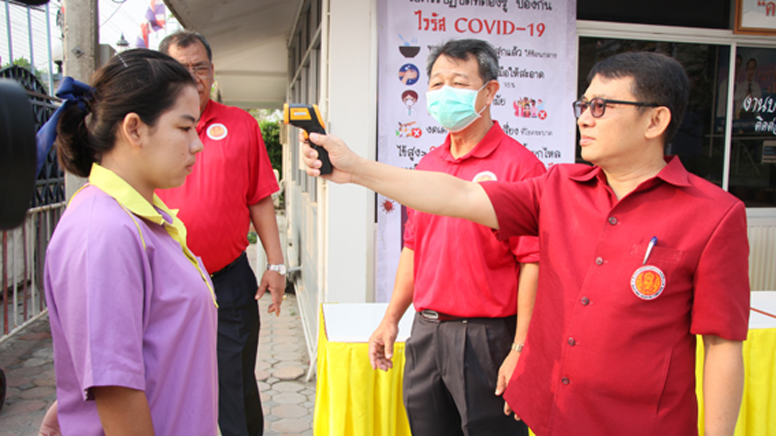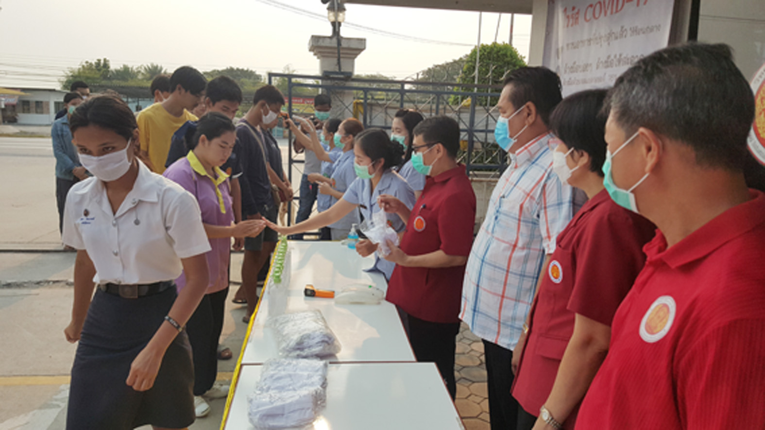 ที่ จ.สุพรรณบุรี นายเสกสรร ถนอมกิตติ นายอำเภออู่ทอง นายศิรเมศร์ พัชราอริยธรณ์ ผอ.วิทยาลัยการอาชีพอู่ทอง นายโกเมศ โตอินทร์ นายทองกำเนิด พิชิตรณชัย นางสาวเง๊กไน้ แซ่ลี้ นายสายชล ศิษย์ฤาษี รองผอ.การอาชีพ นางสาวจุฑาทิพย์ อุดคณฑี ผอ. รพ.สต.หนองโอ่ง พร้อมเจ้าหน้าที่ ร่วมกันนำหน้ากากอนามัย แจกจ่ายให้นักเรียน นักศึกษา ของวิทยาลัยการอาชีพพร้อมกับตรวจวัดอุณภูมิของนักเรียนนักศึกษา ครูอาจารย์ พ่อค้า แม่ค้า และประชาชนที่มาจับจ่ายซื้อของที่ตลาดประชารัฐ ชุมชนหนองโอ่ง ที่อยู่ใกล้กับวิทยาลัยเพื่อใช้ป้องกันเชื้อไวรัส โควิด 19