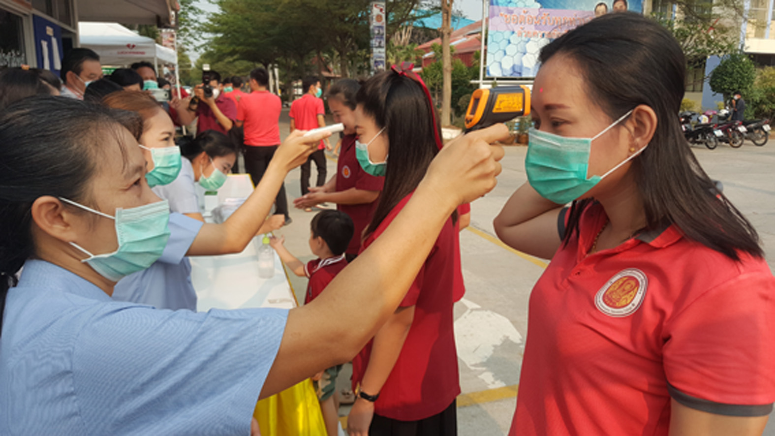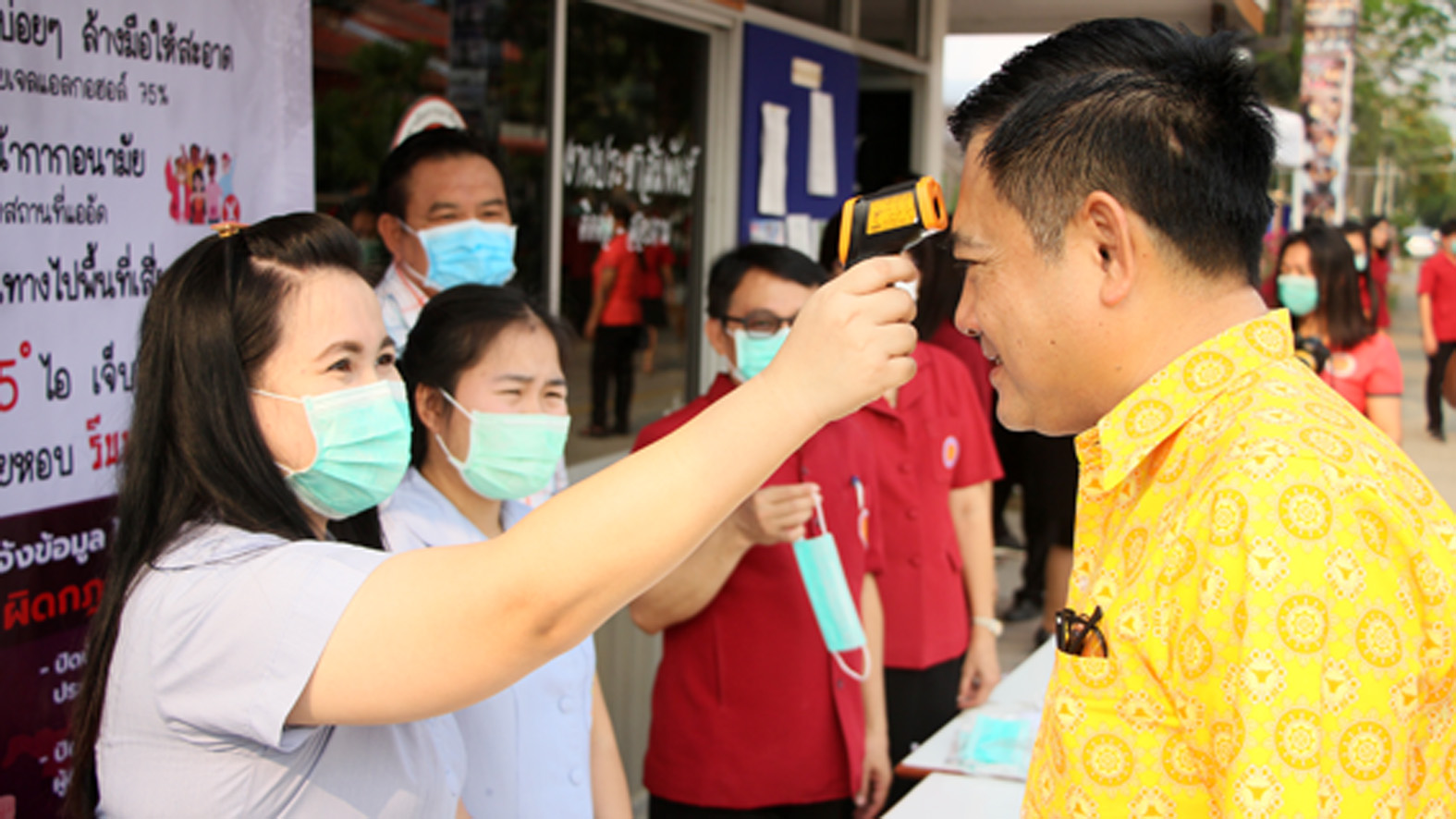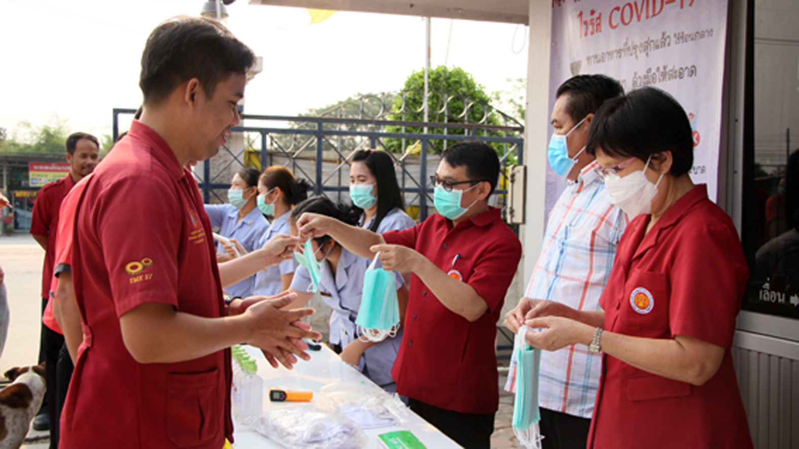ที่ จ.สุพรรณบุรี นายเสกสรร ถนอมกิตติ นายอำเภออู่ทอง นายศิรเมศร์ พัชราอริยธรณ์ ผอ.วิทยาลัยการอาชีพอู่ทอง นายโกเมศ โตอินทร์ นายทองกำเนิด พิชิตรณชัย นางสาวเง๊กไน้ แซ่ลี้ นายสายชล ศิษย์ฤาษี รองผอ.การอาชีพ นางสาวจุฑาทิพย์ อุดคณฑี ผอ. รพ.สต.หนองโอ่ง พร้อมเจ้าหน้าที่ ร่วมกันนำหน้ากากอนามัย แจกจ่ายให้นักเรียน นักศึกษา ของวิทยาลัยการอาชีพพร้อมกับตรวจวัดอุณภูมิของนักเรียนนักศึกษา ครูอาจารย์ พ่อค้า แม่ค้า และประชาชนที่มาจับจ่ายซื้อของที่ตลาดประชารัฐ ชุมชนหนองโอ่ง ที่อยู่ใกล้กับวิทยาลัยเพื่อใช้ป้องกันเชื้อไวรัส โควิด 19