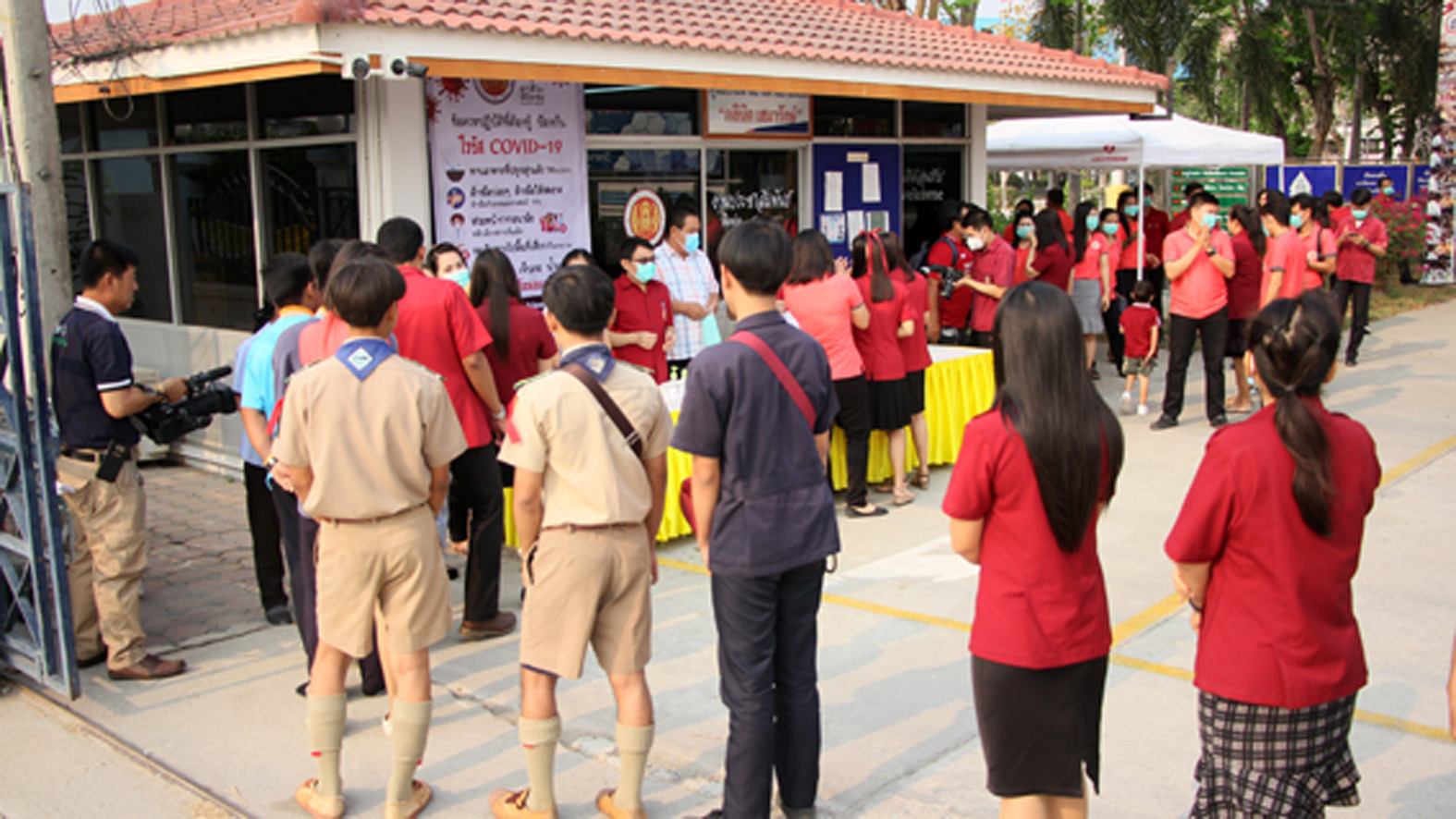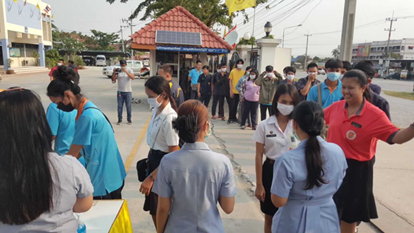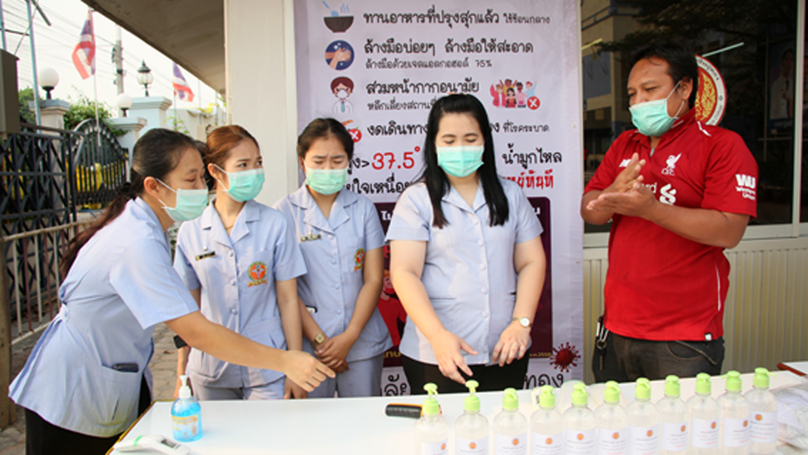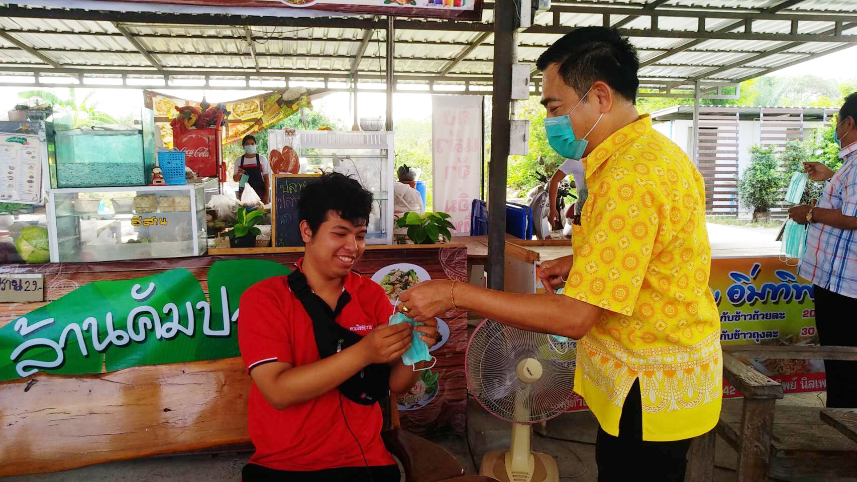 ที่ จ.สุพรรณบุรี นายเสกสรร ถนอมกิตติ นายอำเภออู่ทอง นายศิรเมศร์ พัชราอริยธรณ์ ผอ.วิทยาลัยการอาชีพอู่ทอง นายโกเมศ โตอินทร์ นายทองกำเนิด พิชิตรณชัย นางสาวเง๊กไน้ แซ่ลี้ นายสายชล ศิษย์ฤาษี รองผอ.การอาชีพ นางสาวจุฑาทิพย์ อุดคณฑี ผอ. รพ.สต.หนองโอ่ง พร้อมเจ้าหน้าที่ ร่วมกันนำหน้ากากอนามัย แจกจ่ายให้นักเรียน นักศึกษา ของวิทยาลัยการอาชีพพร้อมกับตรวจวัดอุณภูมิของนักเรียนนักศึกษา ครูอาจารย์ พ่อค้า แม่ค้า และประชาชนที่มาจับจ่ายซื้อของที่ตลาดประชารัฐ ชุมชนหนองโอ่ง ที่อยู่ใกล้กับวิทยาลัยเพื่อใช้ป้องกันเชื้อไวรัส โควิด 19