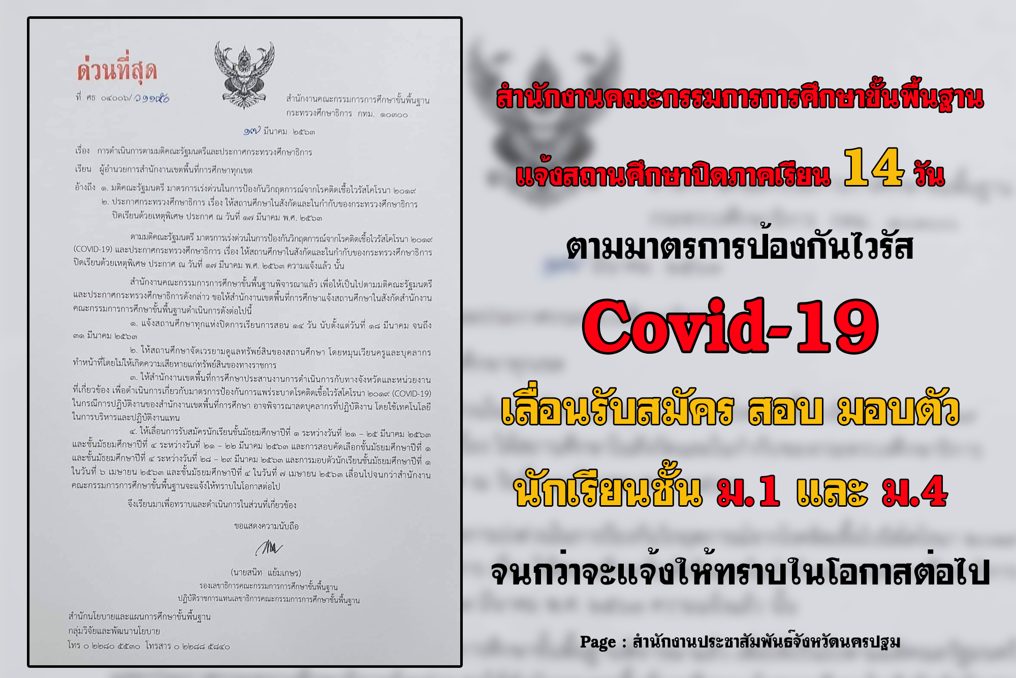 สำนักงานคณะกรรมการการศึกษาขั้นพื้นฐาน แจ้งทุกสถานศึกษาปิดการเรียนการสอน 14 วัน ตามมาตรการเร่งด่วนในการป้องกันไวรัส Covid-19 พร้อมเลื่อนการรับสมัคร การสอบคัดเลือก และการมอบตัว ของนักเรียนชั้นมัธยมศึกษาปีที่ 1 และปีที่ 4 จนกว่าจะแจ้งให้ทราบในโอกาสต่อไป
