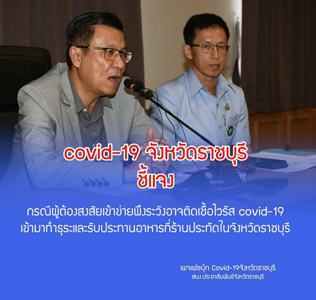 จังหวัดราชบุรีขอเรียนชี้แจงเพื่อความกระจ่างว่า เมื่อคืนวันอังคารที่ผ่านมา ผวจ.ราชบุรี ได้รับโทรศัพท์จาก ผวจ.ฉะเชิงเทรา ว่ามีผู้ต้องสงสัยเข้าข่ายพึงระวังอาจติดเชื้อไวรัส covid-19 เข้ามาทำธุระและรับประทานอาหารที่ร้านประทัดในจังหวัดราชบุรี ผวจ.ราชบุรี จึงได้สั่งการให้รอง ผวจ.( นายวิสาห์ พูนศิริรัตน์) , นพ.สสจ.ราชบุรี, นายอำเภอเมืองราชบุรี สืบสวนหาข่าวเป็นการด่วน
