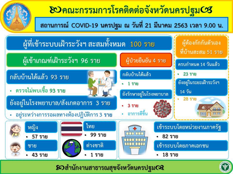 คณะกรรมการโรคติดต่อจังหวัดนครปฐม ได้รายงานสถานการณ์โรคโควิด-19 ประจำวันที่ 21 มีนาคม 2563 นับตั้งแต่เกิดสถานการณ์ Covid- 19 จ.นครปฐมมีผู้ป่วยยืนยันสะสม 4 ราย กลับบ้านแล้ว 1 ราย (ตั้งแต่ 24 ม.ค.63 ) ส่วนอีก 3 รายกำลังรับการรักษาและมีอาการดีขึ้นโดยลำดับ และขณะนี้มีผู้เข้าข่ายเฝ้าระวังสังเกตอาการ ซึ่งอยู่ระหว่างรอผลทางห้องปฏิบัติการ 3 ราย