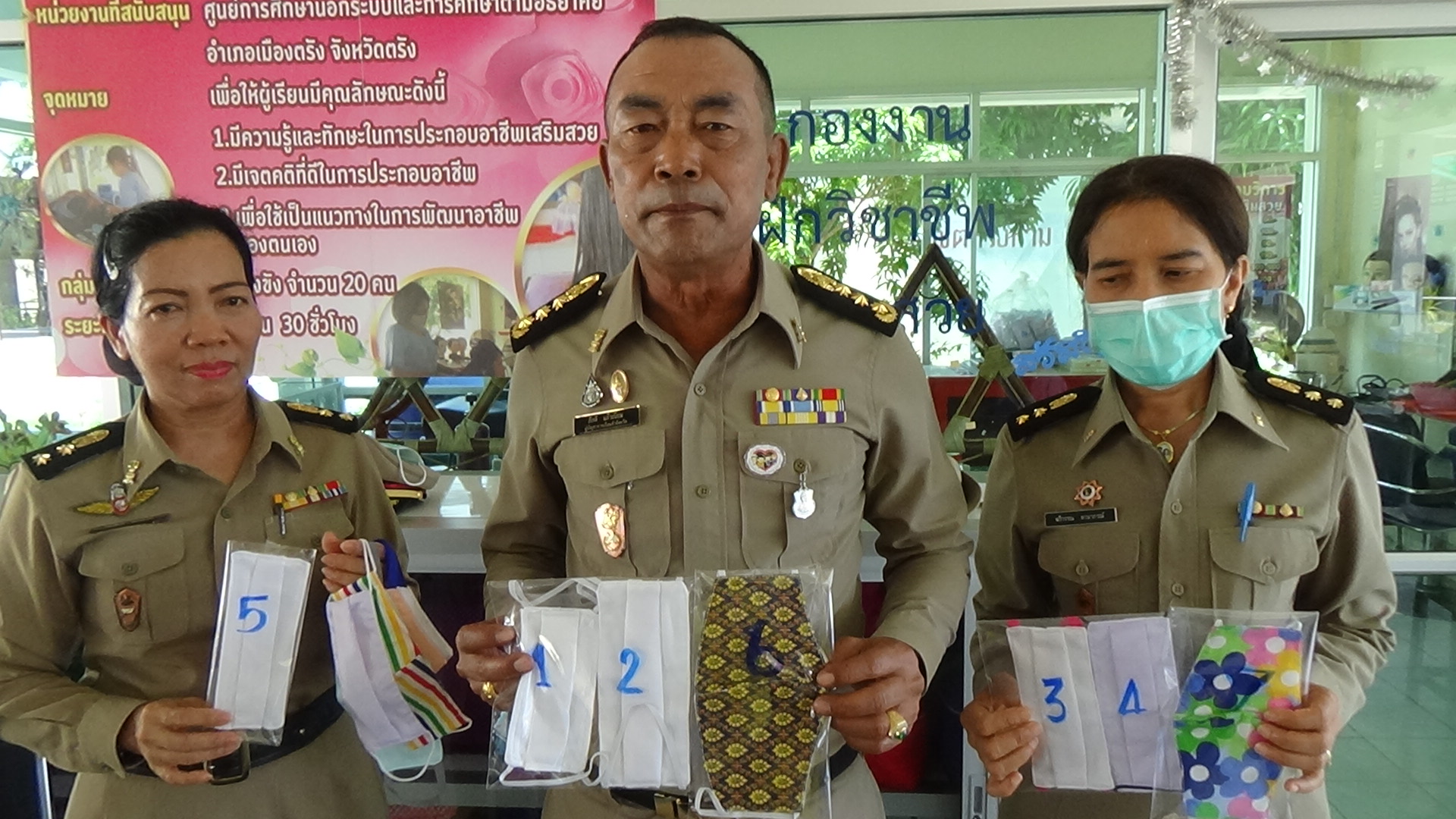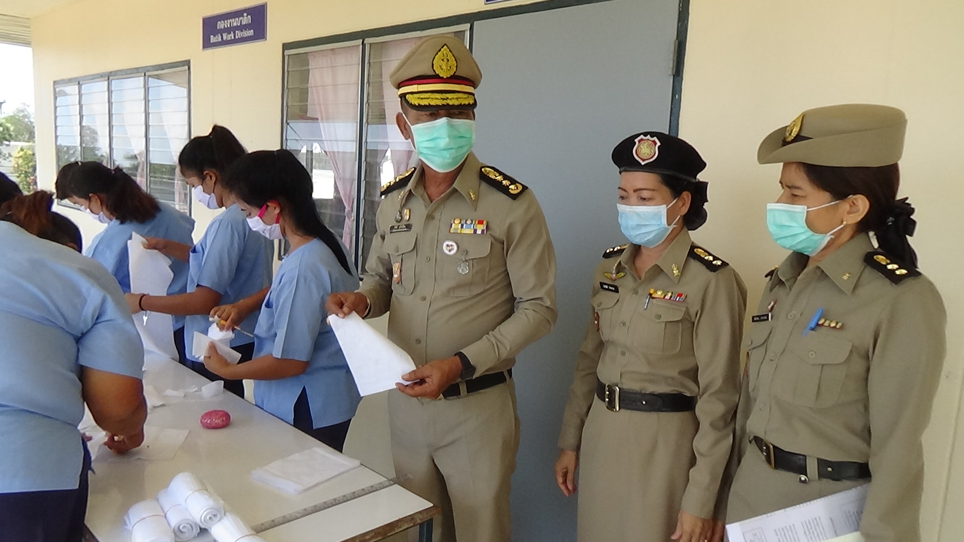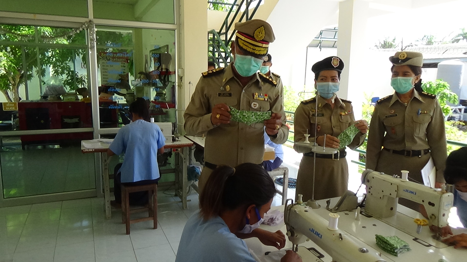 ที่เรือนจำจังหวัดตรัง นายภักดี แก้วเนียม ผู้บัญชาการเรือนจำจังหวัดตรัง นางฉวีวรรณ ลวนาภรณ์ ผู้อำนวยการส่วนสวัสดิการ ภาค 1 สงเคราะห์ผู้องขัง นางไพรัชต์ ไทรงาม นักทัณฑวิทยาชำนาญการ นางณัฐพร บรรจงเกลี้ยง เจ้าพนักงานราชทัณฑ์ชำนาญงาน หัวหน้าโรงงานฝึกวิชาชีพ-หัตกรรมแดนหญิง ตรวจการเย็บหน้ากากอนามัยของเรือนจำ ในแดนผู้ต้องหญิง ที่กำลังช่วยกันตัดเย็บหน้ากากอนามัย ตั้งแต่เวลา 09.00 -17.00 น.ของทุกวัน สามารถทำหน้ากากอนามัยได้วันละ 400-500 อัน
