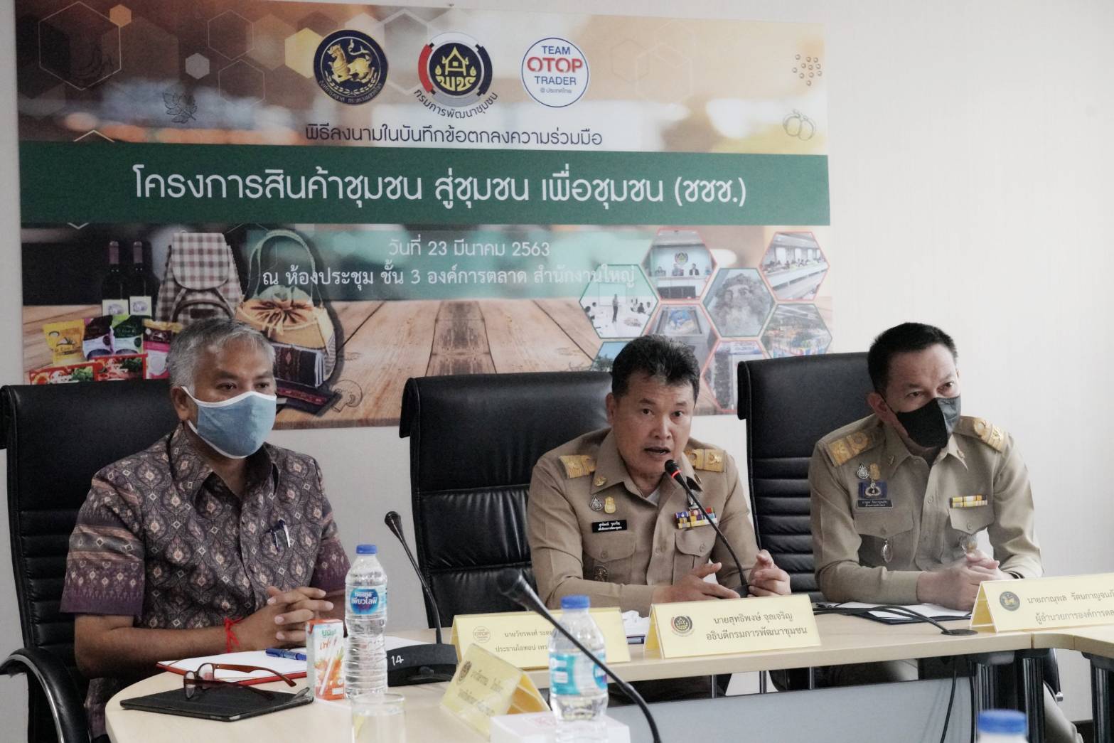 โดยนายสุทธิพงษ์ อธิบดีฯ พช. กล่าวถึงความร่วมมือว่า ขอบคุณองค์การตลาดที่กรุณาเป็นธุระในการที่ริเริ่มในการที่จะทำให้กลุ่มผู้ประกอบการ OTOP ได้มีความเข้มแข็งทั้งระบบครบวงจรชีวิตของการทำมาหากิน 20 ปีที่ผ่านมากรมการพัฒนาชุมชนได้ช่วยสร้างความเข้มแข็งในเรื่องของการผลิตให้พี่น้องประชาชน นับถึงปัจจุบันกว่า 87,000 กลุ่ม ก็คือผลิตสินค้า OTOP ที่หลากหลาย หลาย sector นับแสนรายการ ทั้ง 5 ประเภท ประกอบด้วย ประเภทอาหาร ประเภทเครื่องดื่ม ประเภทผ้าเครื่องแต่งกาย ประเภทของใช้ ของตกแต่ง ของที่ระลึก และประเภทสมุนไพรที่ไม่ใช่อาหาร ซึ่งที่ผ่านมาถือว่าประสบความสำเร็จ ในฐานะที่กรมการพัฒนาชุมชนได้รับมอบหมายจากรัฐบาลในการทำให้ผู้ประกอบการ OTOP มีความเข้มแข็งสามารถผลิตสินค้าที่มีคุณภาพดี และกรมฯ ยังได้มีการส่งเสริมในเรื่องของการตลาด เช่น จัดตั้งศูนย์จัดจำหน่ายสินค้า OTOP ตามจังหวัดต่างๆ จัดตลาด OTOP ที่เป็นระดับชาติ OTOP city, OTOP midyear, ศิลปาชีพ ประทีปไทย โอทอปก้าวไกลด้วยพระบารมี OTOP ภูมิภาคในจังหวัดต่างๆ เป็นต้น