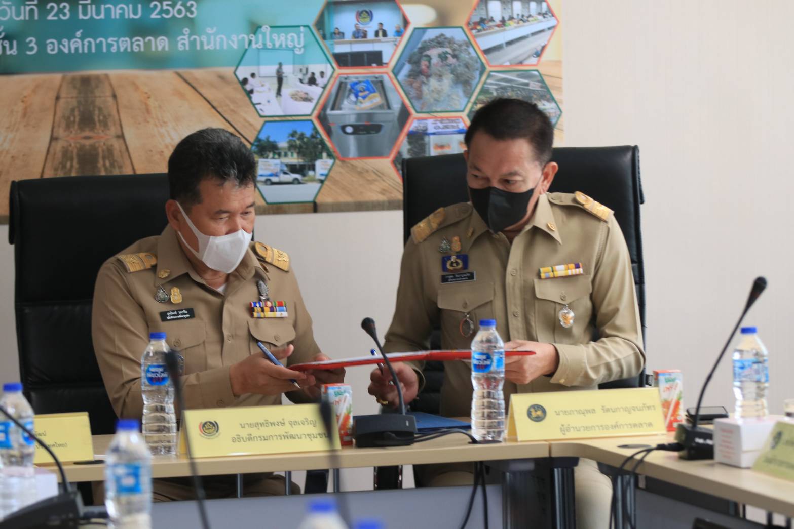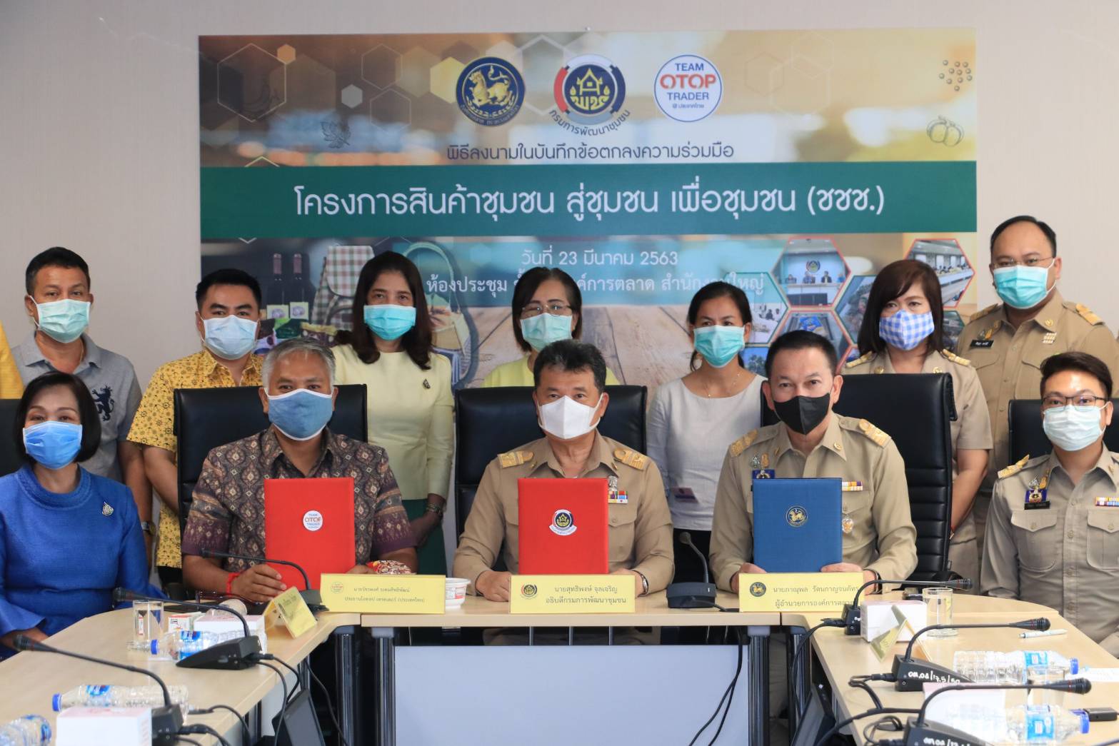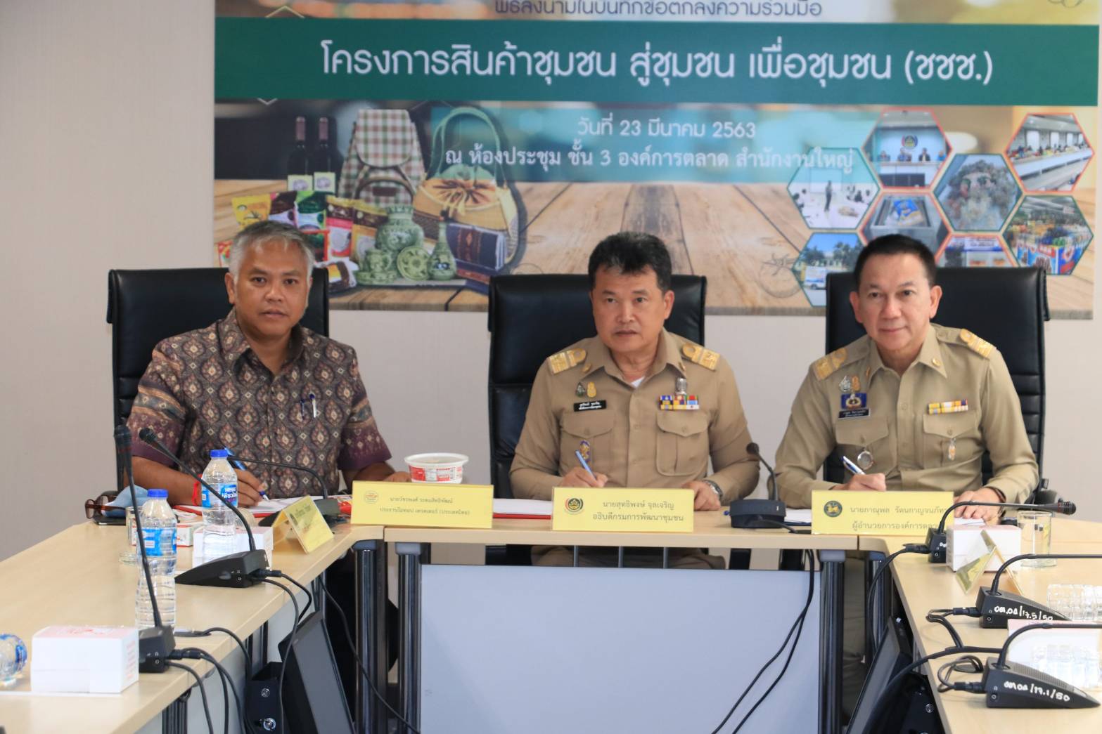 วันจันทร์ที่ 23 มีนาคม 2563 เวลา 9:30 น. นายสุทธิพงษ์ จุลเจริญ อธิบดีกรมการพัฒนาชุมชน ผู้แทนกรมการพัฒนาชุมชน (พช.) และ นายวัชรพงศ์ ระดมสิทธิพัฒน์ ประธาน OTOP เทรดเดอร์ (ประเทศไทย) ร่วมกับ นายภาณุพล รัตนกาญจนภัทร ผู้อำนวยการองค์การตลาด ผู้แทนองค์การตลาด (อต.) ร่วมบันทึกข้อตกลงความร่วมมือโครงการสินค้าชุมชน สู่ชุมชน เพื่อชุมชน เพื่อสร้างรายได้ผ่านการสร้างตราสินค้า”อต. Select” โดยมี นางวิไลวรรณ ไกรโสดา รองอธิบดีกรมการพัฒนาชุมชน และนายวิทยา ทรัพย์เย็น รองผู้อำนวยการองค์การตลาด และ ณ ห้องประชุมใหญ่ชั้น 3 องค์การตลาด สำนักงานใหญ่ ตำบลสวนผัก ซอย 4 เขตตลิ่งชัน กรุงเทพฯ